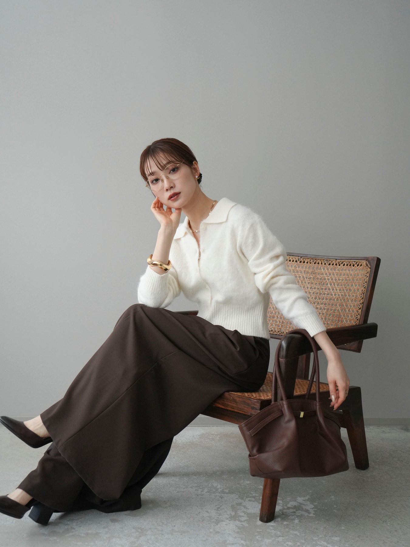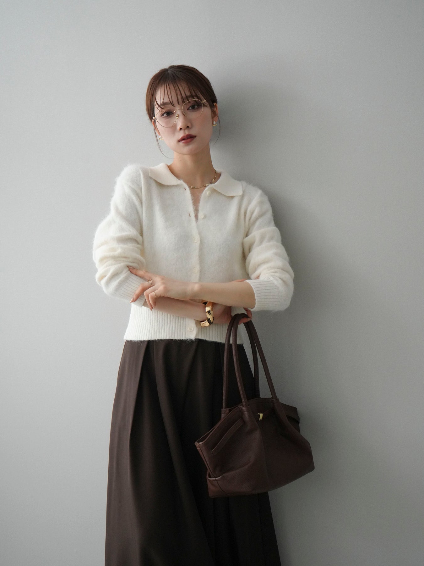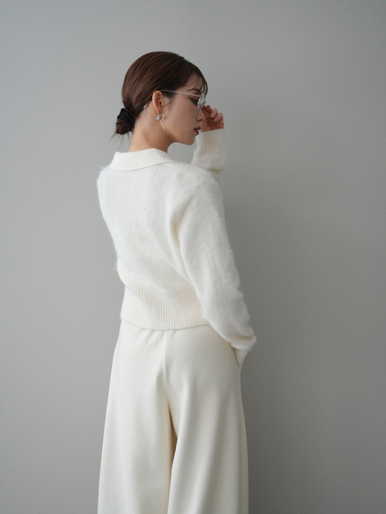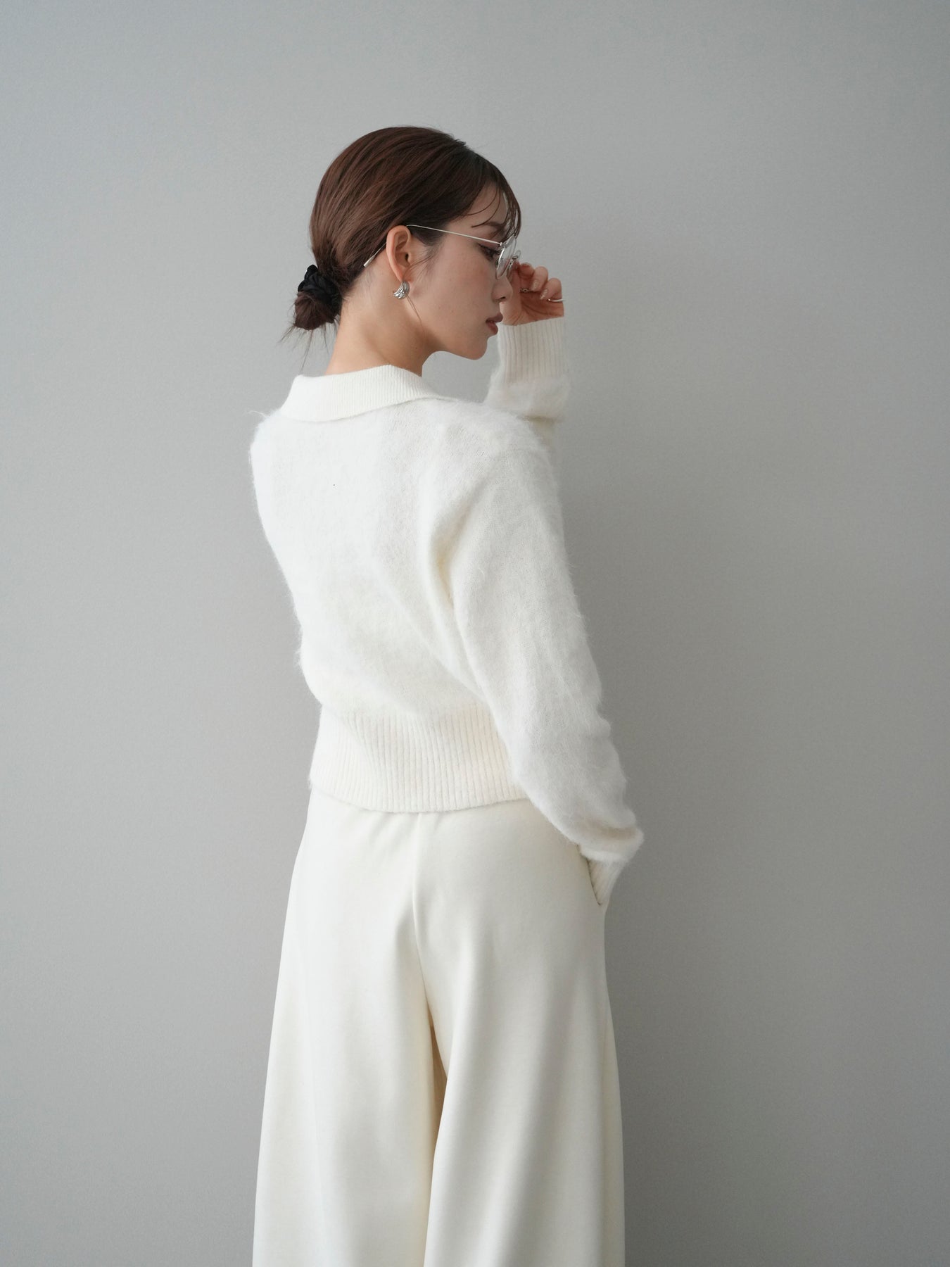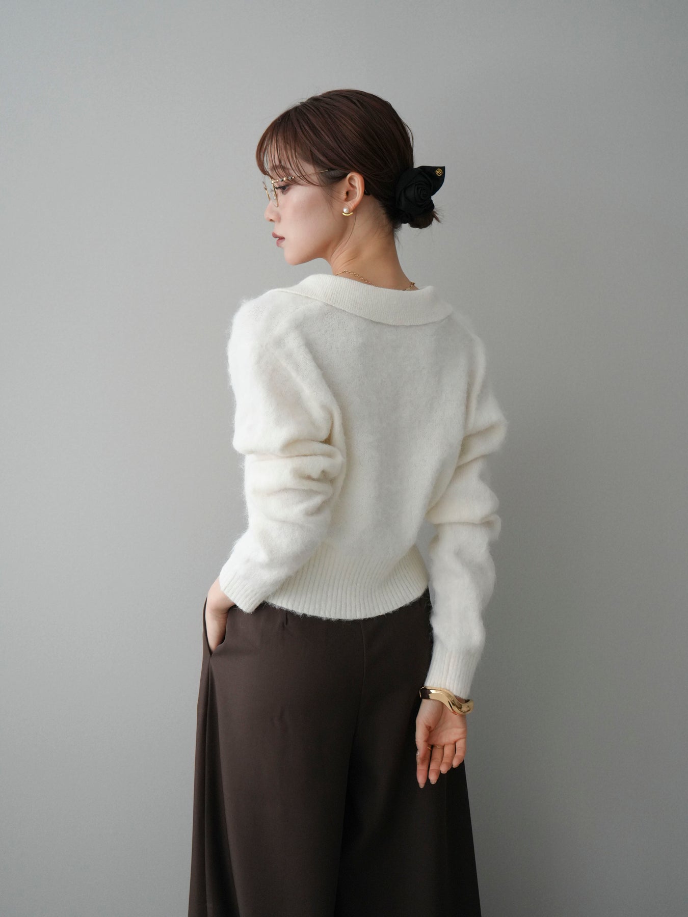 ふんわりとしたモヘアタッチの素材感が魅力の衿付きニットプルオーバー。 やさしい起毛感がシーズンムードを高め、見た目にも暖かみのある一着です。 きちんと感のある衿デザインに、フロントのボタンがほどよいアクセントとなり、甘さと上品さをバランス良く演出。 コンパクトなシルエットで全体がすっきりとまとまり、ボトムスを選ばず着こなしやすいのもポイントです。 一枚で着映えし、デイリーから少しきれいめなスタイリングまで幅広く活躍します。