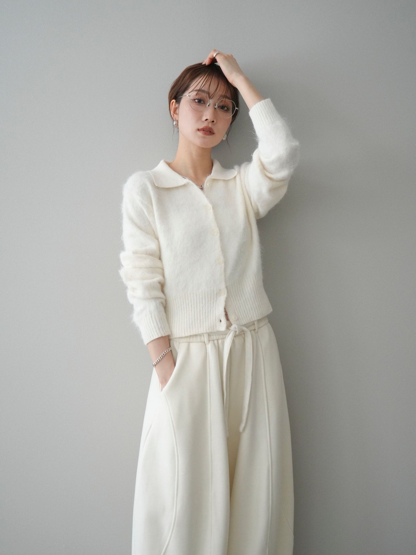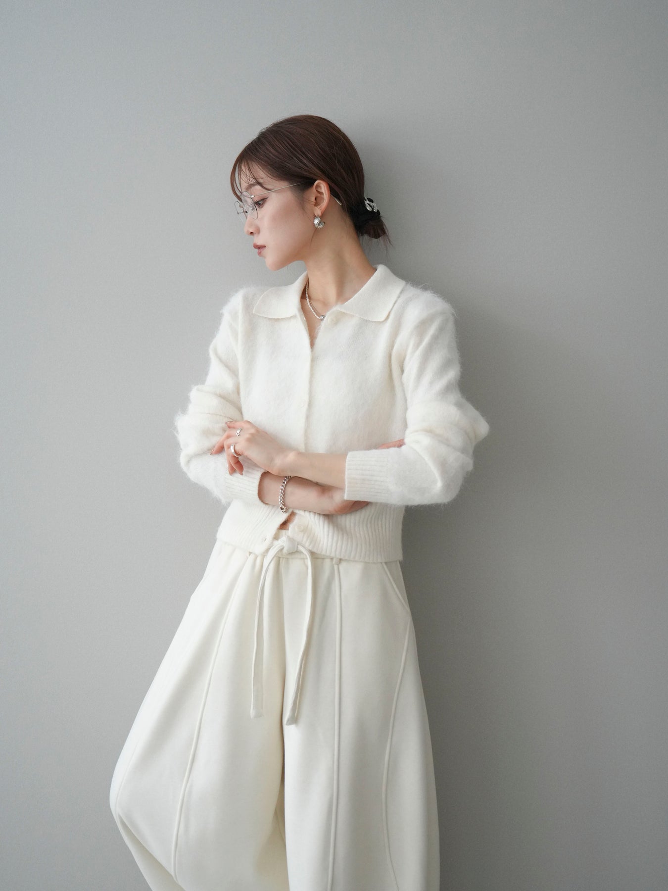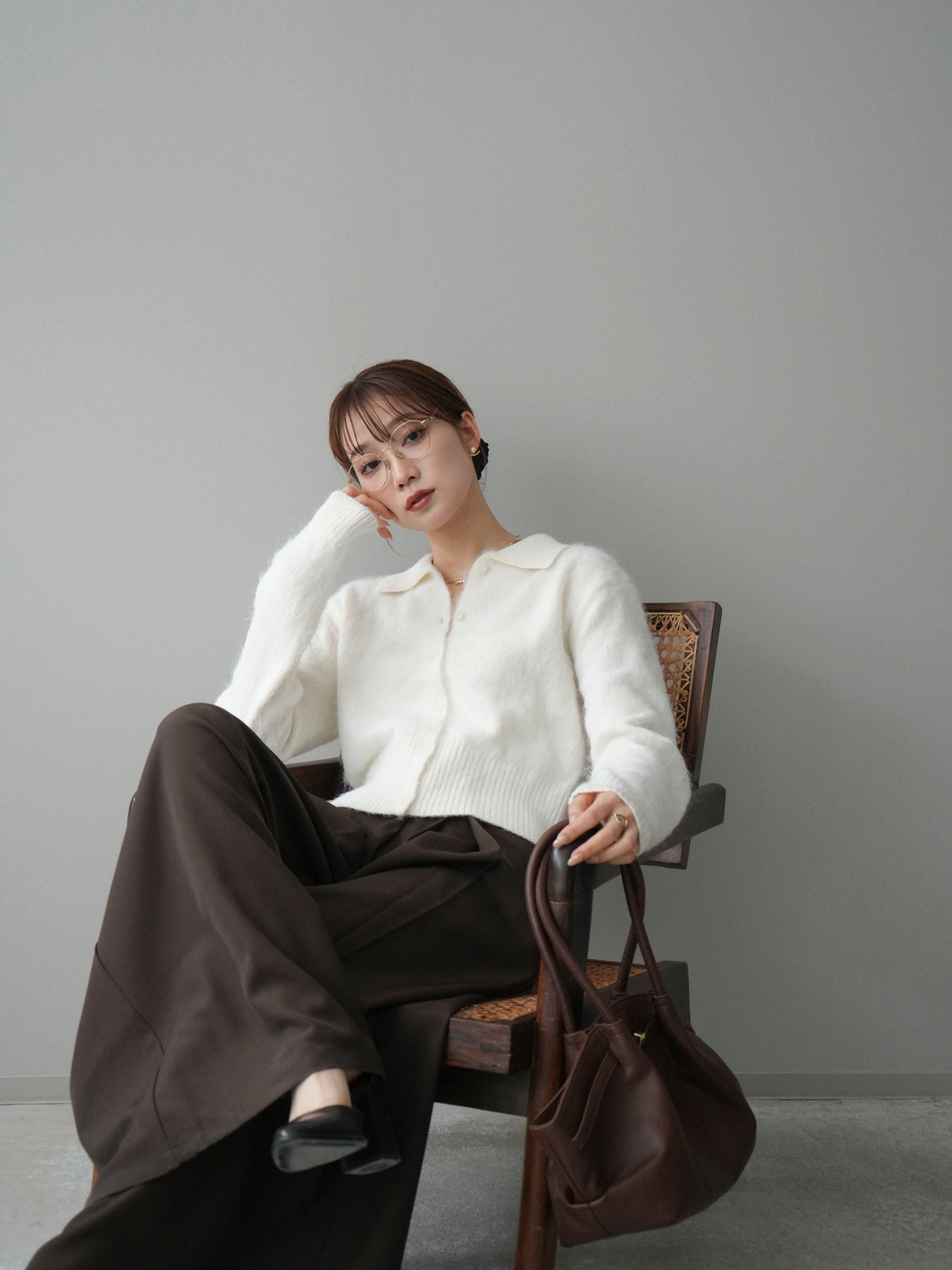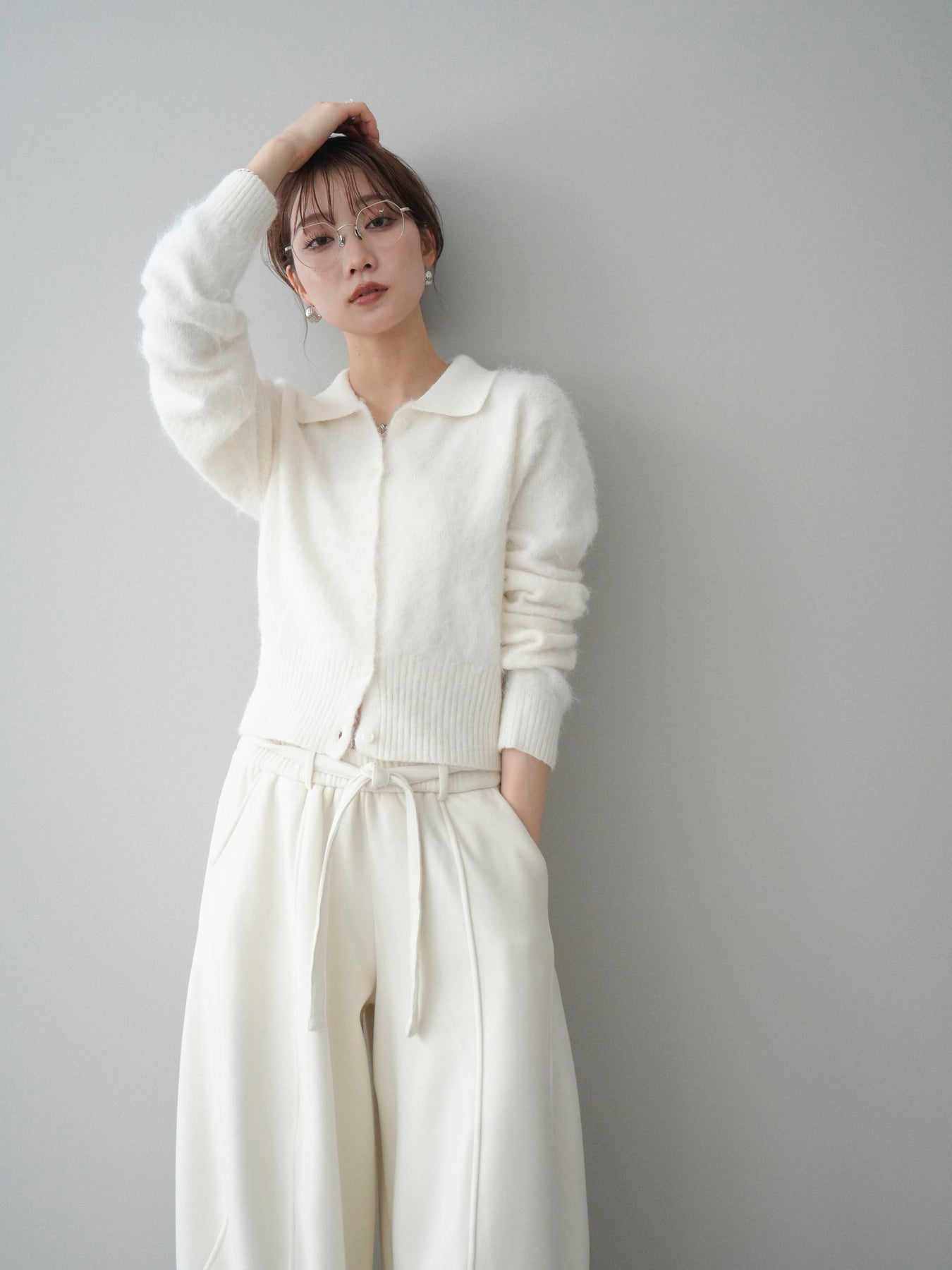 ふんわりとしたモヘアタッチの素材感が魅力の衿付きニットプルオーバー。 やさしい起毛感がシーズンムードを高め、見た目にも暖かみのある一着です。 きちんと感のある衿デザインに、フロントのボタンがほどよいアクセントとなり、甘さと上品さをバランス良く演出。 コンパクトなシルエットで全体がすっきりとまとまり、ボトムスを選ばず着こなしやすいのもポイントです。 一枚で着映えし、デイリーから少しきれいめなスタイリングまで幅広く活躍します。