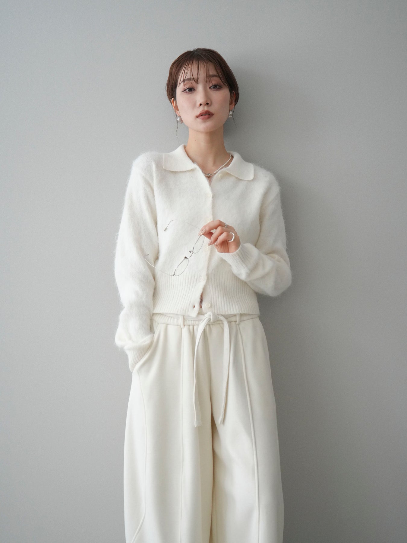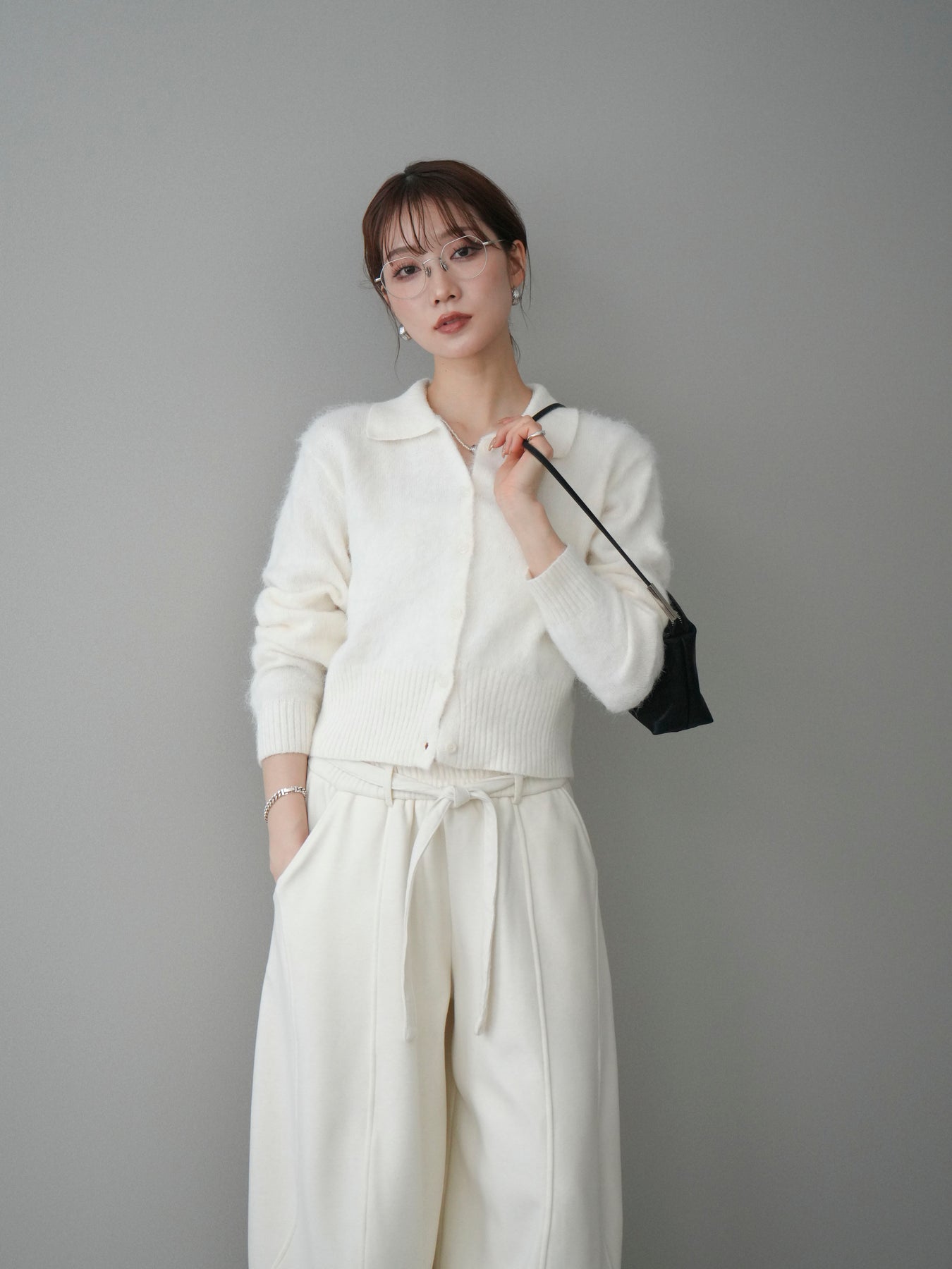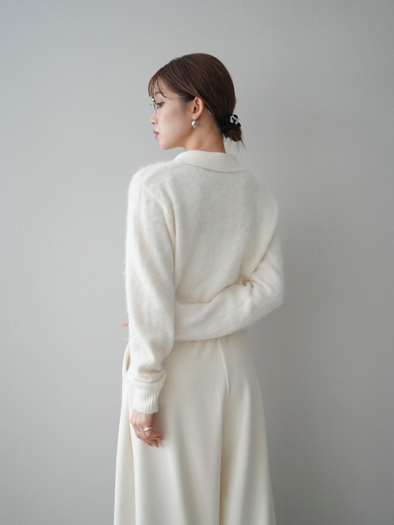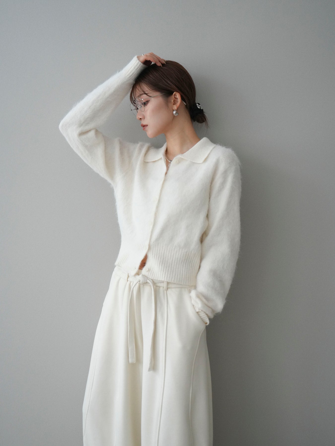 ふんわりとしたモヘアタッチの素材感が魅力の衿付きニットプルオーバー。 やさしい起毛感がシーズンムードを高め、見た目にも暖かみのある一着です。 きちんと感のある衿デザインに、フロントのボタンがほどよいアクセントとなり、甘さと上品さをバランス良く演出。 コンパクトなシルエットで全体がすっきりとまとまり、ボトムスを選ばず着こなしやすいのもポイントです。 一枚で着映えし、デイリーから少しきれいめなスタイリングまで幅広く活躍します。