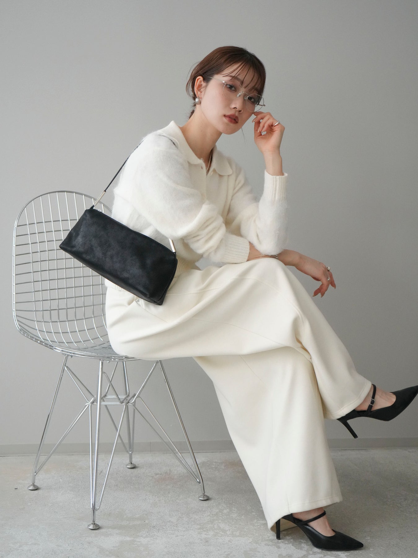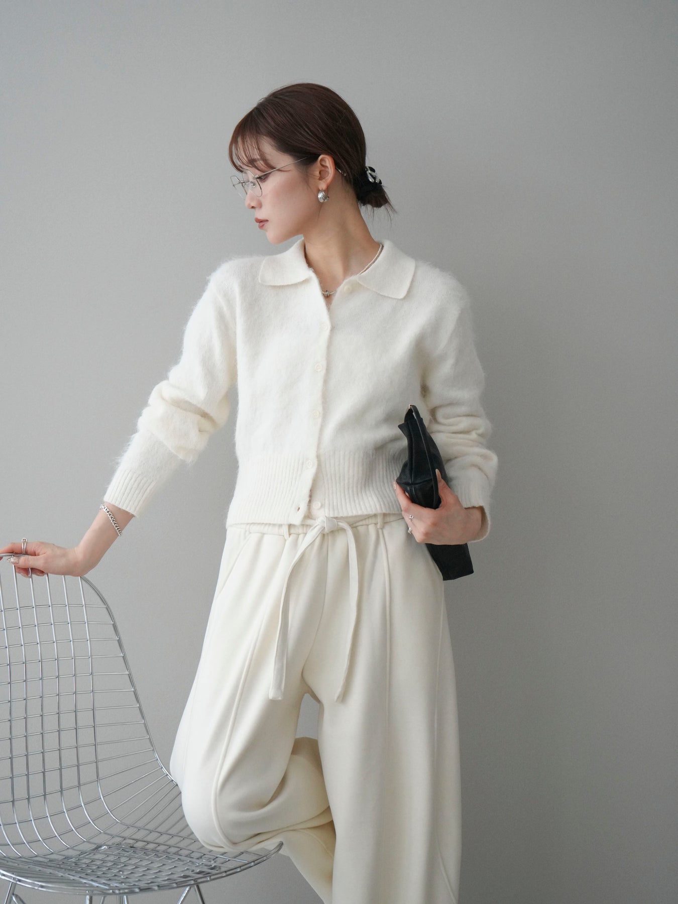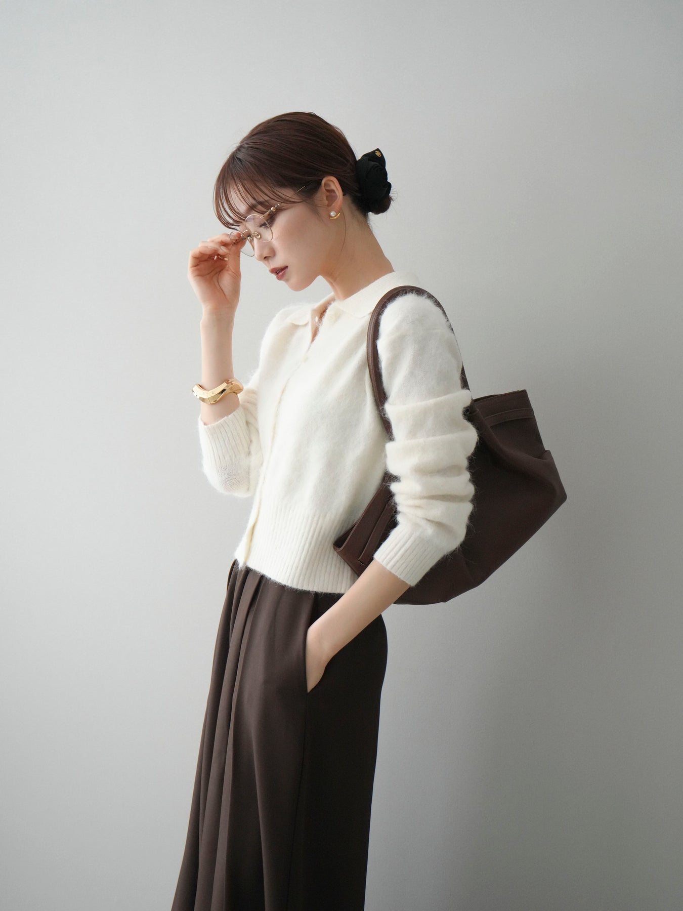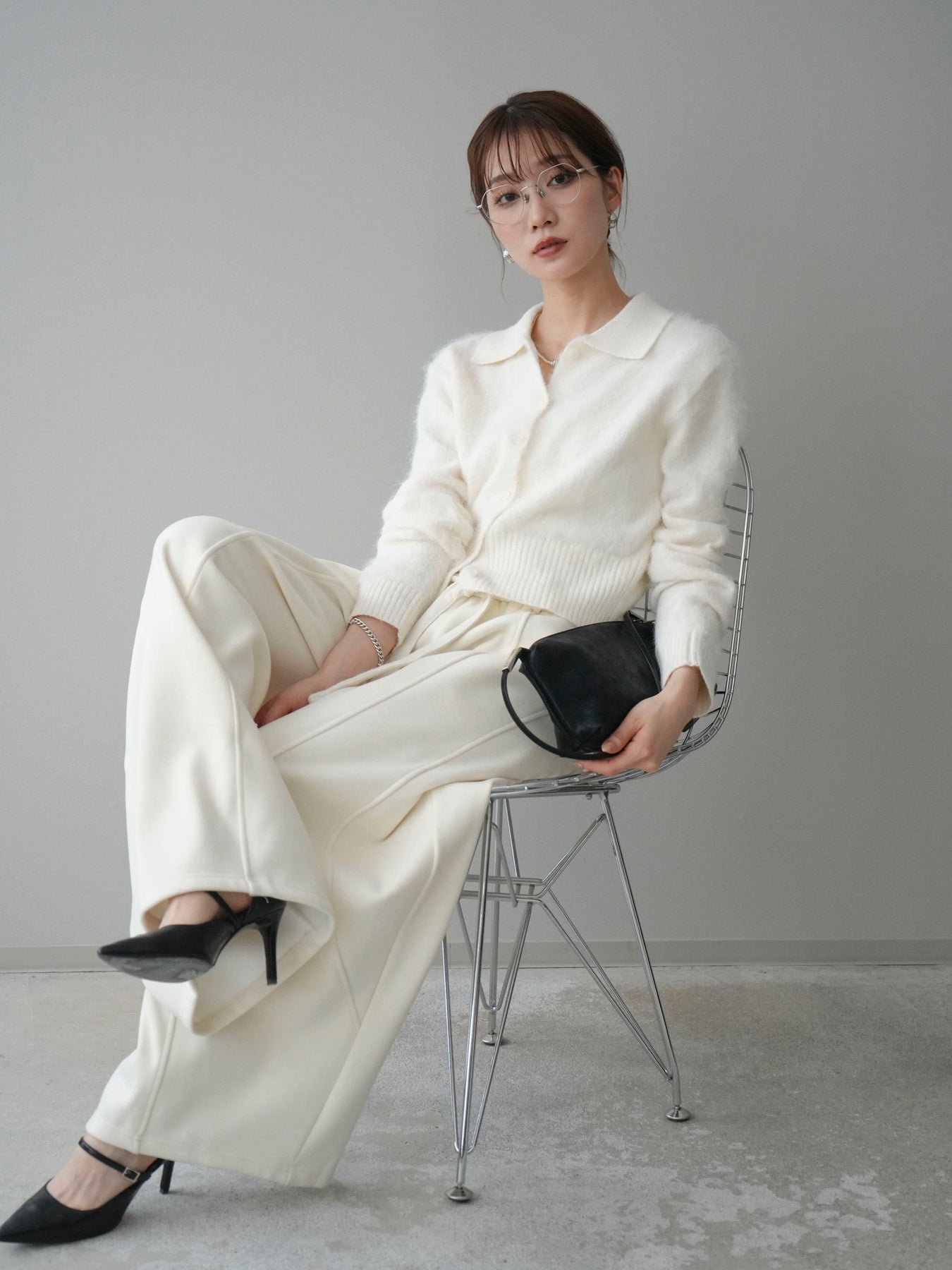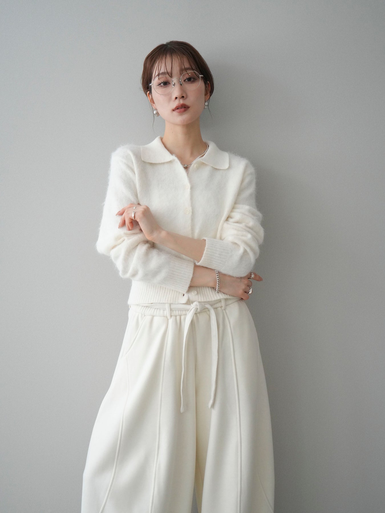 ふんわりとしたモヘアタッチの素材感が魅力の衿付きニットプルオーバー。 やさしい起毛感がシーズンムードを高め、見た目にも暖かみのある一着です。 きちんと感のある衿デザインに、フロントのボタンがほどよいアクセントとなり、甘さと上品さをバランス良く演出。 コンパクトなシルエットで全体がすっきりとまとまり、ボトムスを選ばず着こなしやすいのもポイントです。 一枚で着映えし、デイリーから少しきれいめなスタイリングまで幅広く活躍します。