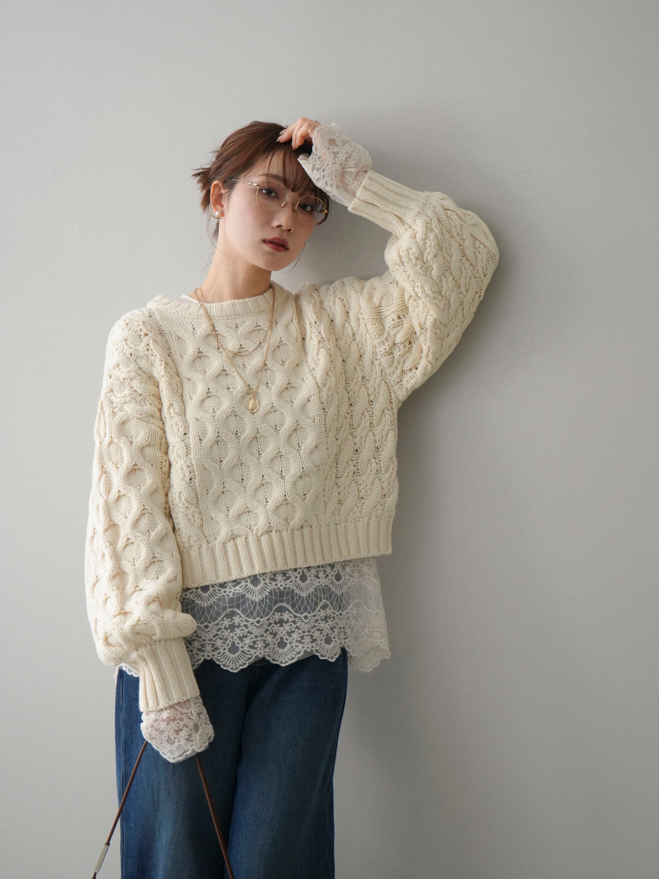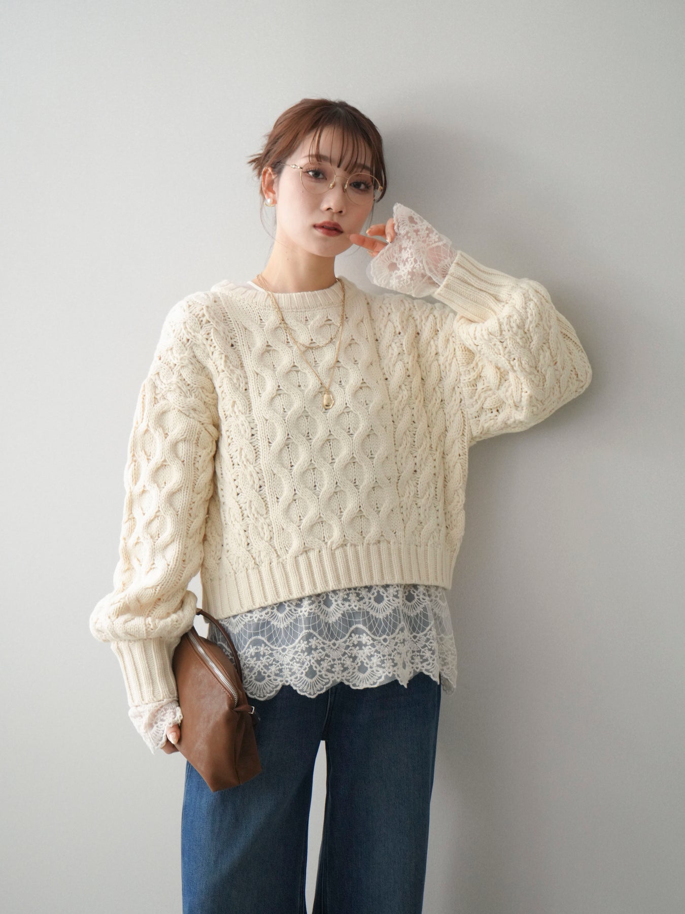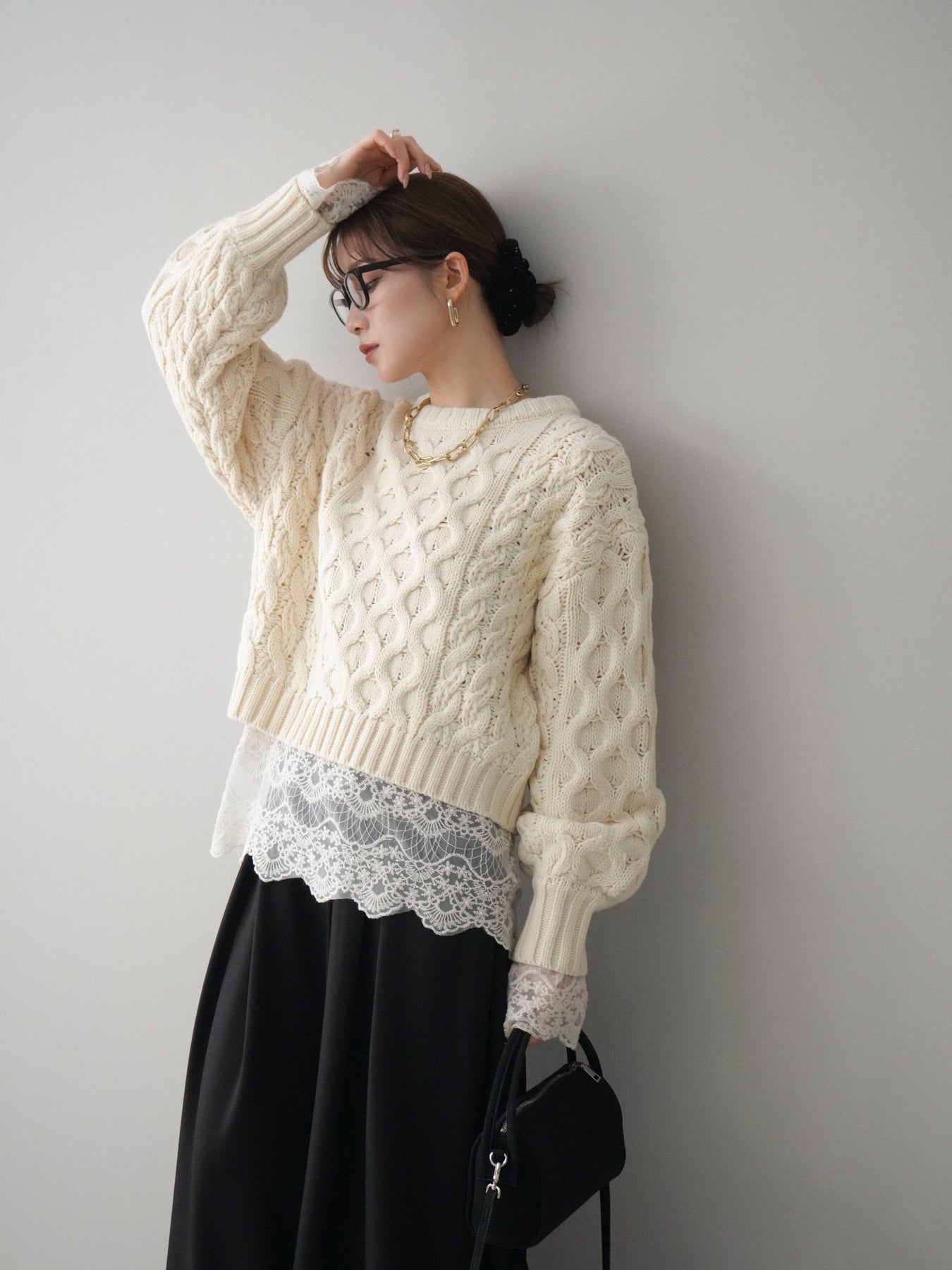 立体感のあるケーブル編みが目を惹く、存在感たっぷりのニットプルオーバー。 バルキーな編み地がシーズンムードを高め、着るだけでコーディネートに温かみと奥行きをプラスします。 程よくボリュームのあるスリーブと、バランスの取りやすいクロップド丈が特徴。 コンパクトな丈感ながら、立体的なシルエットでラフになりすぎず、洗練された印象に仕上がります。 ハイウエストのボトムスやスカートとも相性が良く、 シンプルなスタイリングでも主役として活躍してくれる一着です。