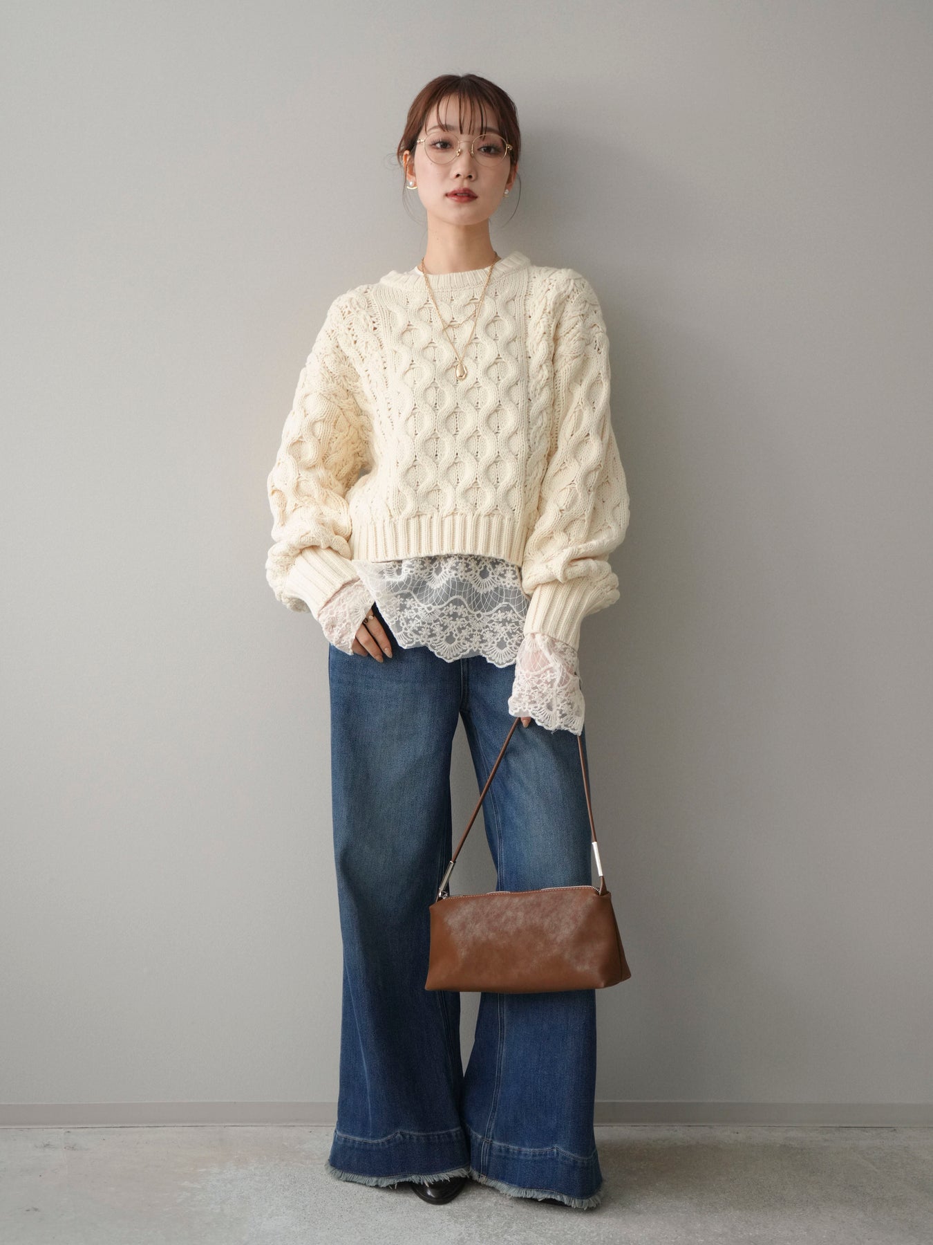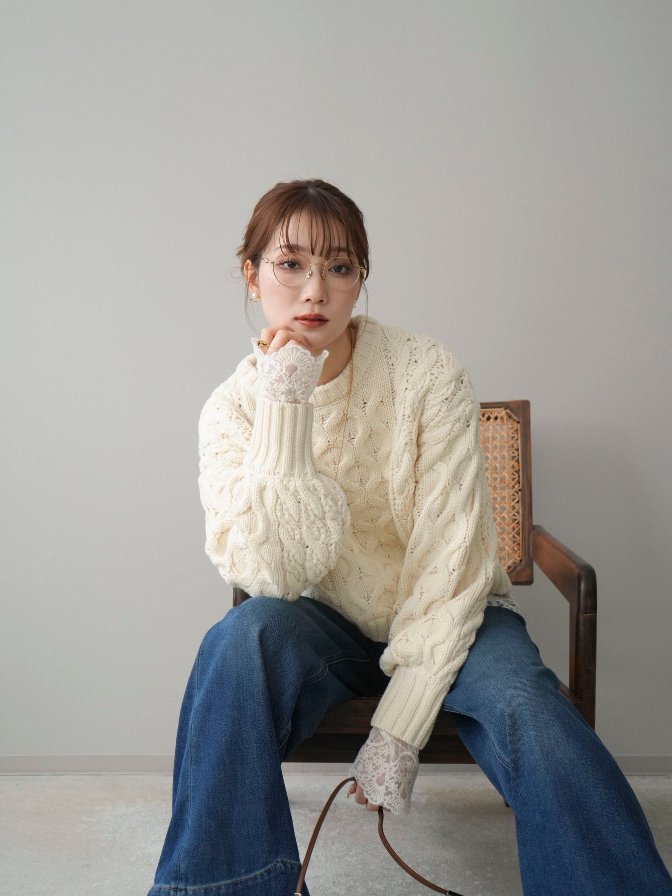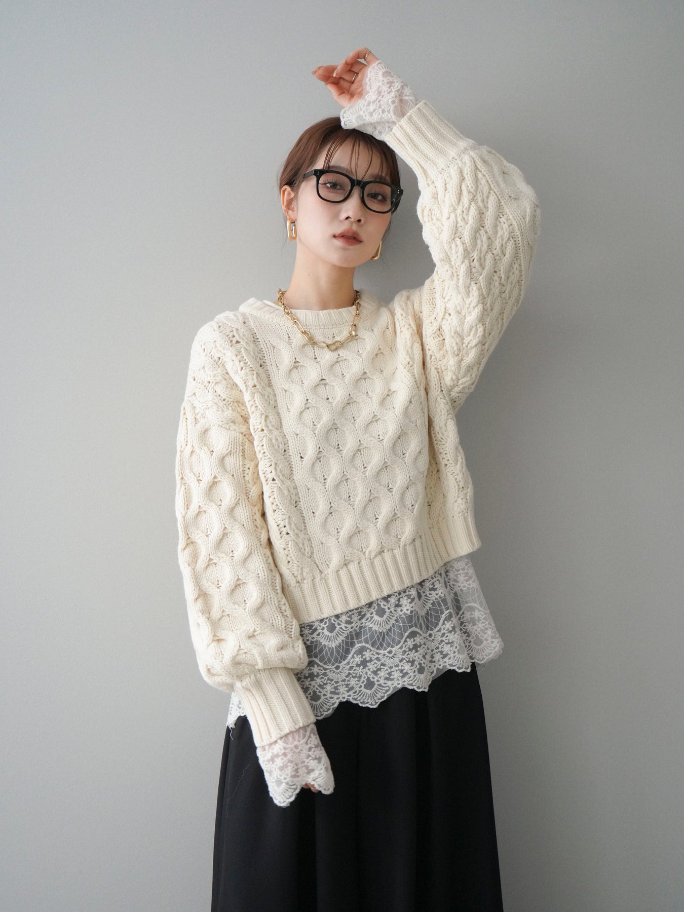 立体感のあるケーブル編みが目を惹く、存在感たっぷりのニットプルオーバー。 バルキーな編み地がシーズンムードを高め、着るだけでコーディネートに温かみと奥行きをプラスします。 程よくボリュームのあるスリーブと、バランスの取りやすいクロップド丈が特徴。 コンパクトな丈感ながら、立体的なシルエットでラフになりすぎず、洗練された印象に仕上がります。 ハイウエストのボトムスやスカートとも相性が良く、 シンプルなスタイリングでも主役として活躍してくれる一着です。