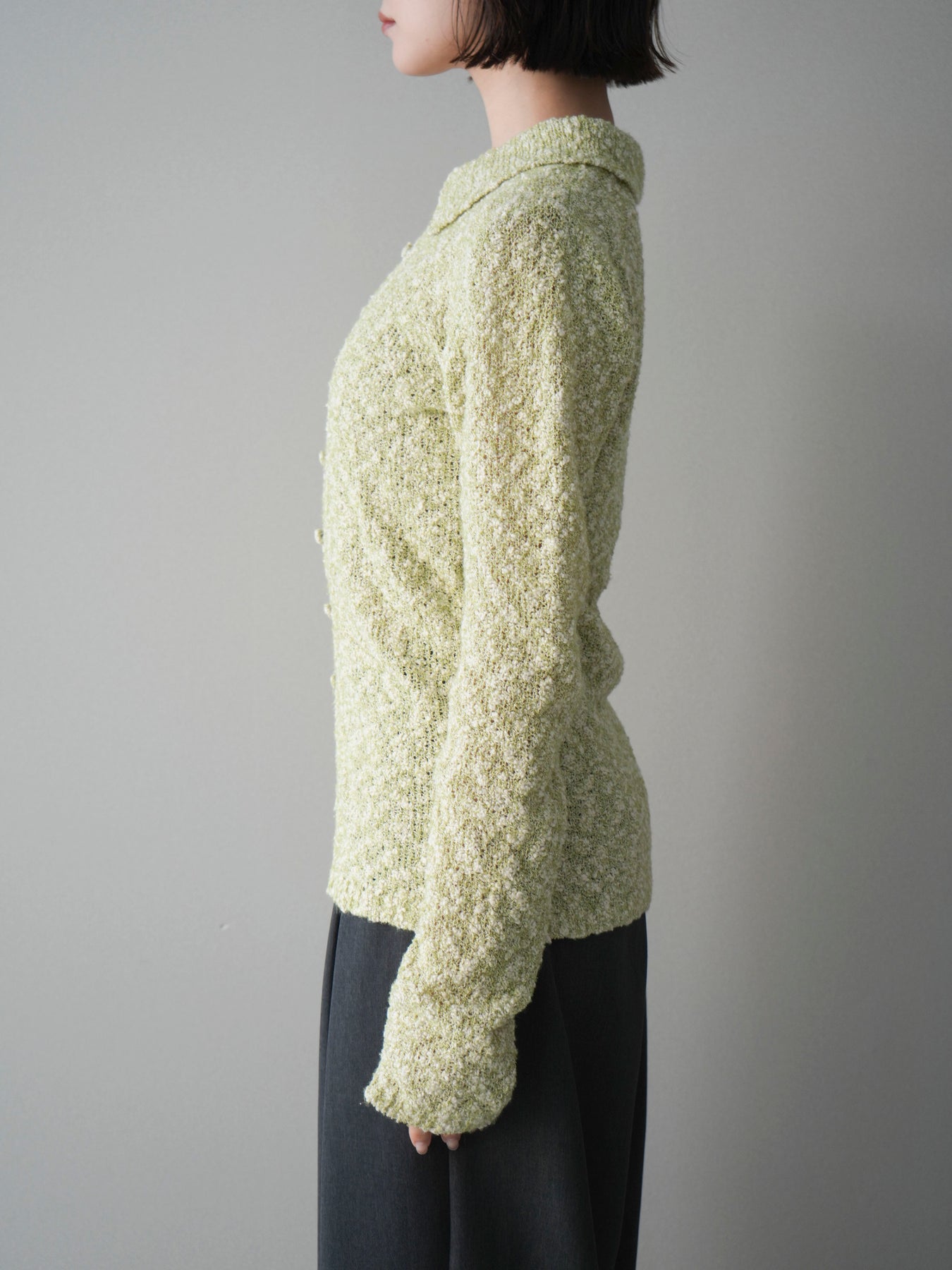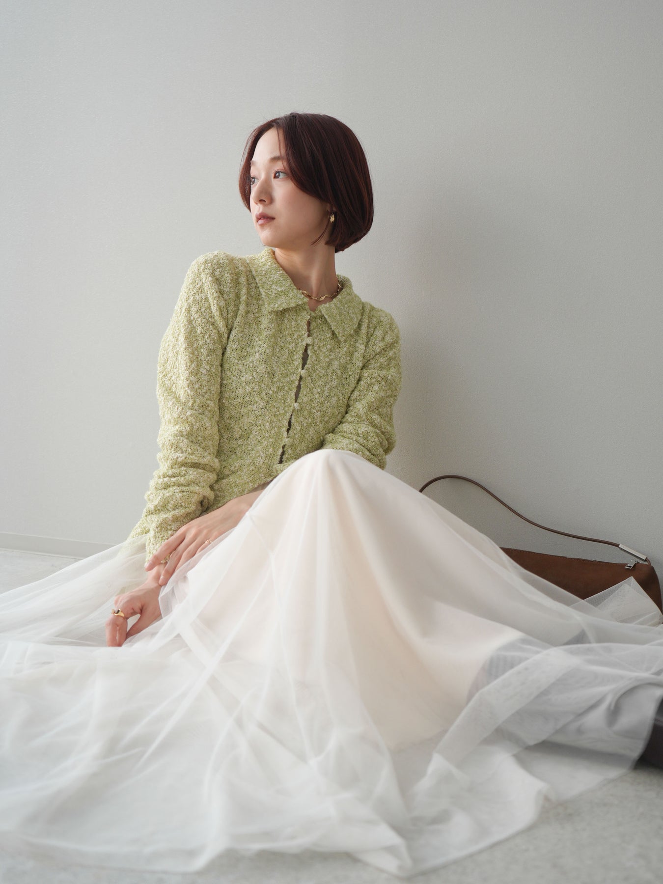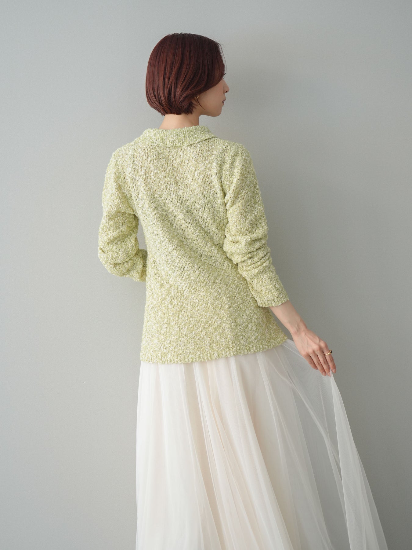 透かし編みとブークレ糸の表情が印象的な、ポロデザインのニットトップス。 立体感のある編み地がシンプルになりすぎず、着るだけで奥行きのあるスタイルに仕上がります。 ほどよくフィット感のあるシルエットに、襟付きデザインを掛け合わせることで、抜け感ときちんと感をバランスよくプラス。 透かし編みならではの軽やかさがあり、レイヤードもしやすく、インナー次第で雰囲気の変化を楽しめます。 デニムなどのカジュアルなボトムスはもちろん、きれいめなアイテムとも相性がよく、幅広いスタイリングに活躍する一着です。 ※ボトムス、キャミソール(インナー)以外の商品は一律でインナーは付属していません。