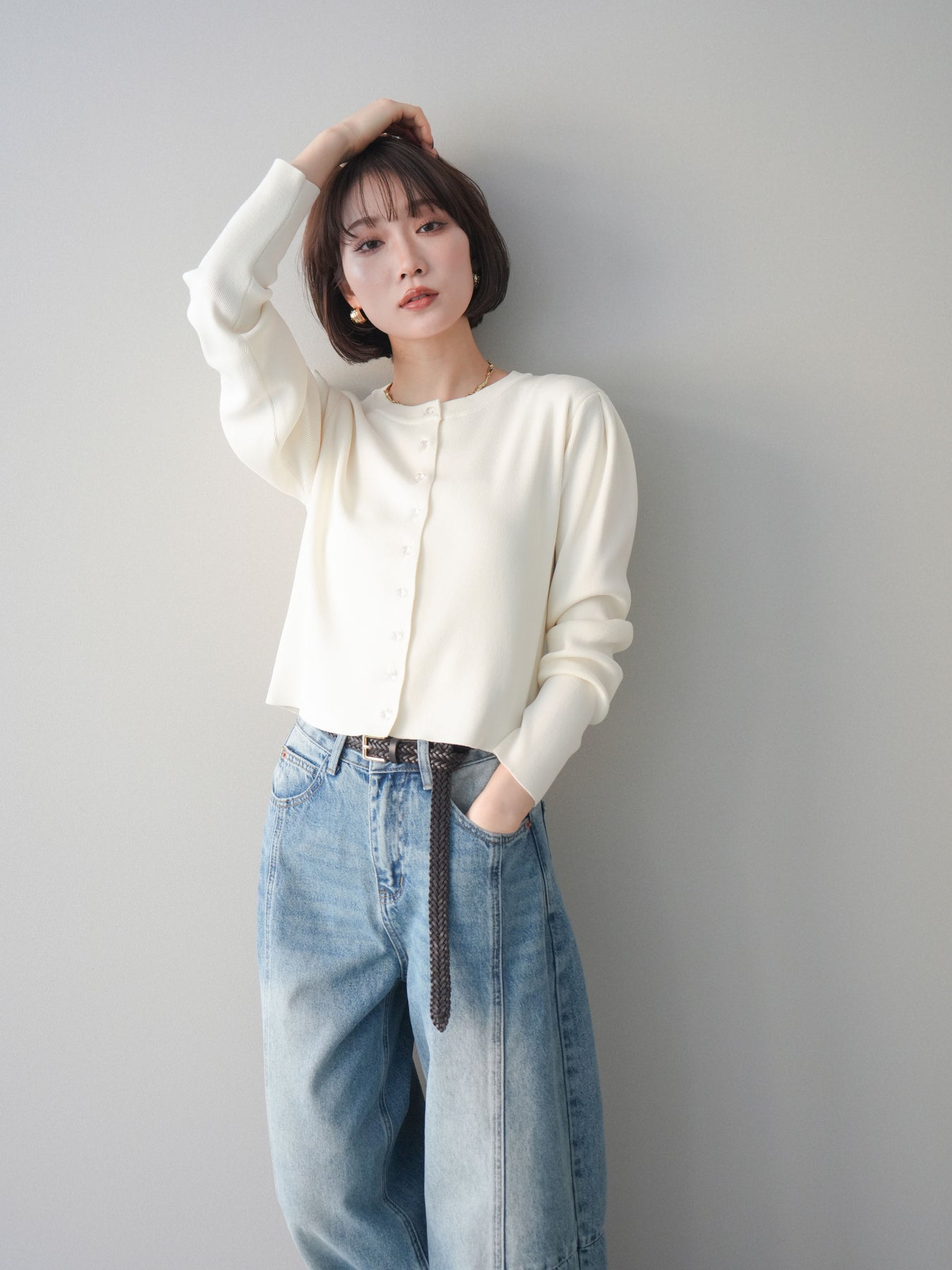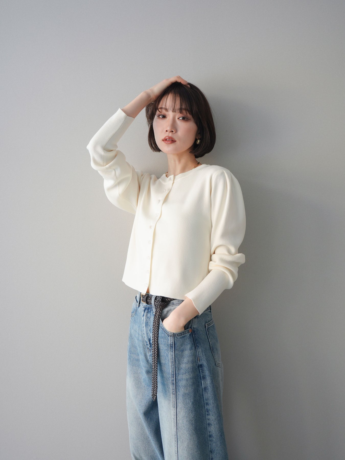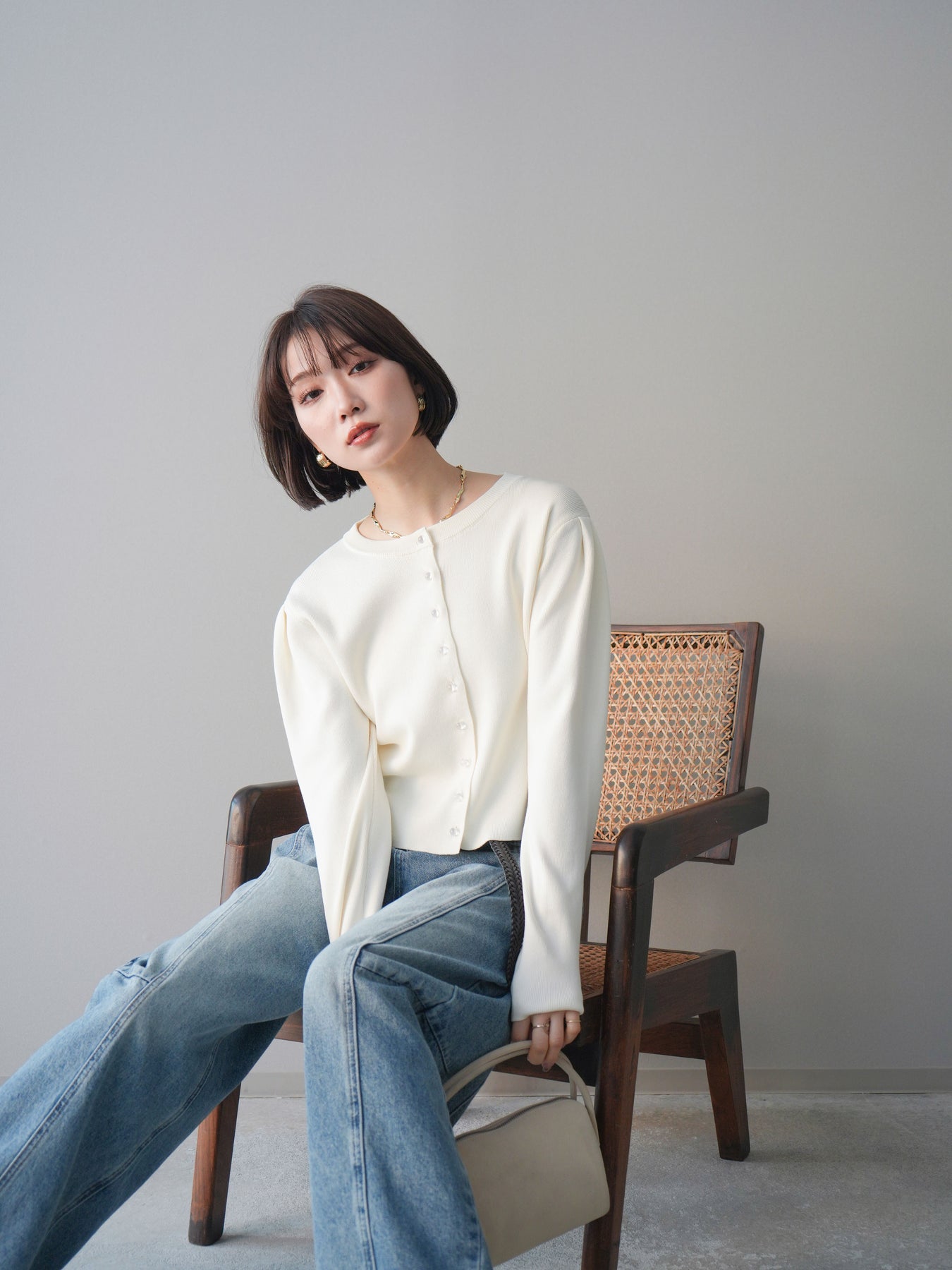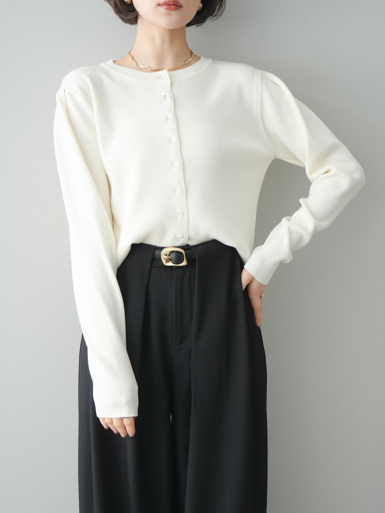 フロントに並ぶクリアボタンが、さりげない抜け感を演出するニットカーディガン。タックを施したデザインが立体感を生み、シンプルながらも表情のある一着に仕上がっています。程よくコンパクトなシルエットで、前を留めてトップスとしても、羽織りとしても着用しやすいのが魅力。きれいめにもカジュアルにも馴染み、ボトムスを選ばず幅広いスタイリングに活躍します。 ※ボトムス、キャミソール(インナー)以外の商品は一律でインナーは付属していません。