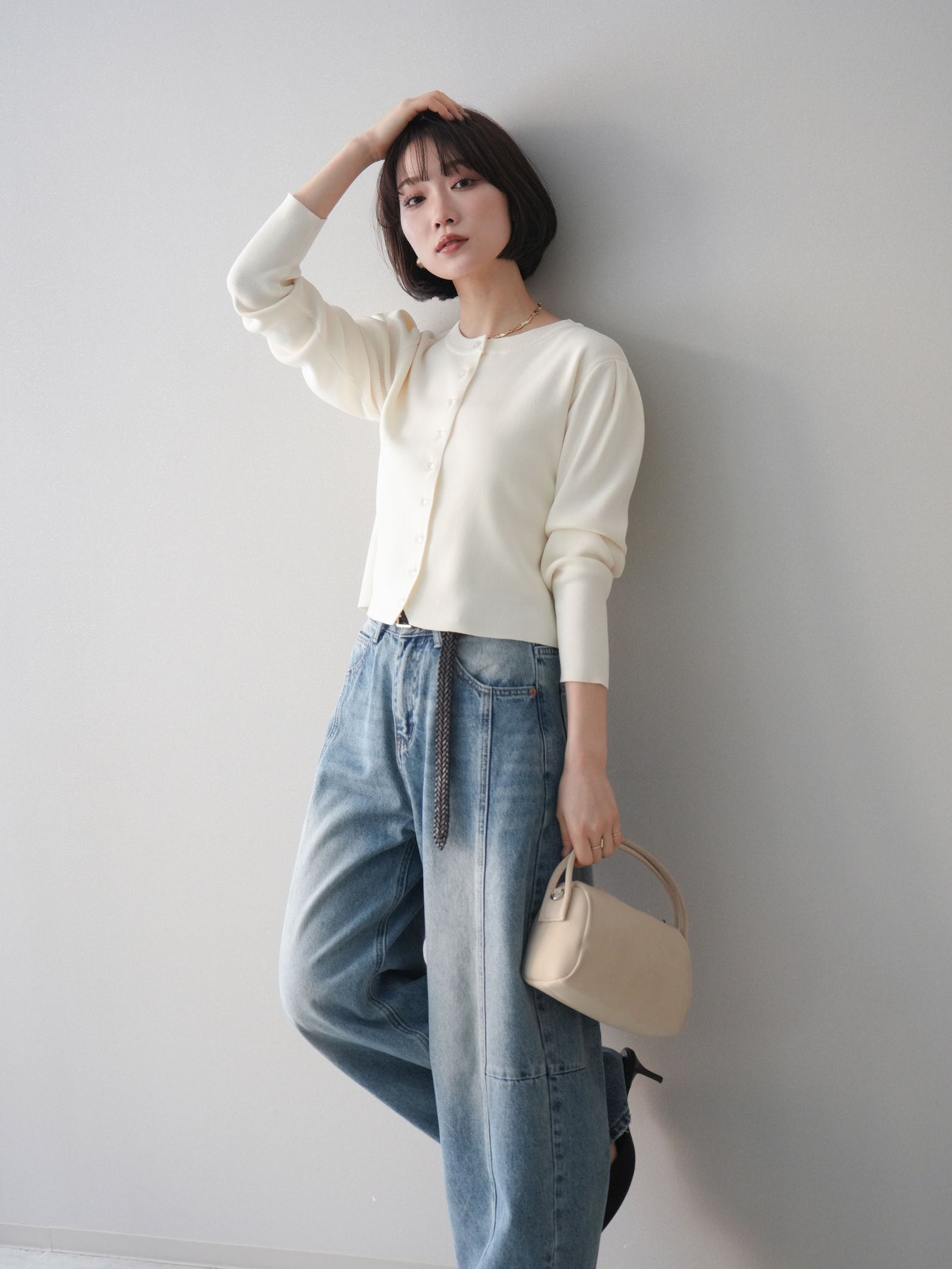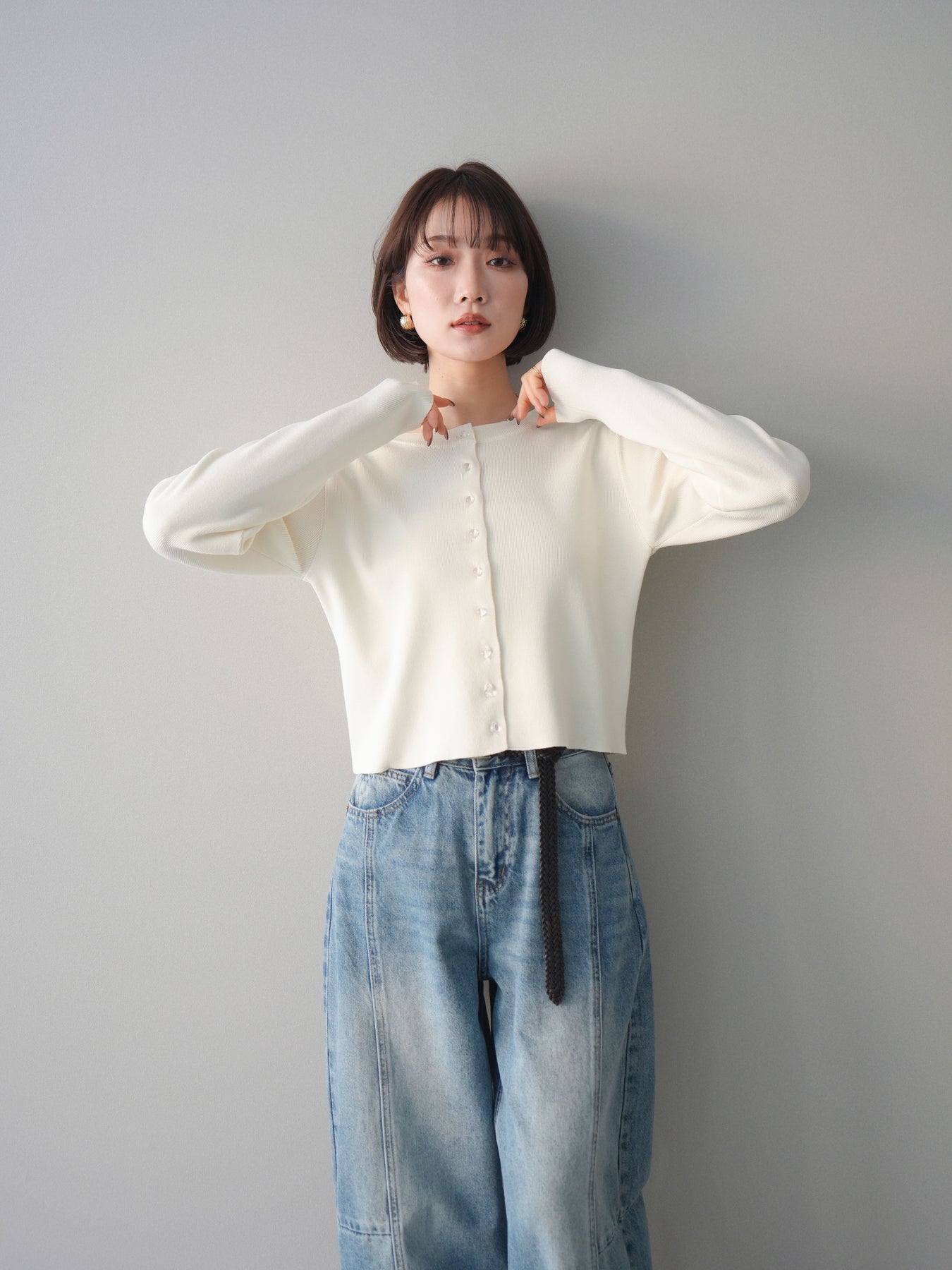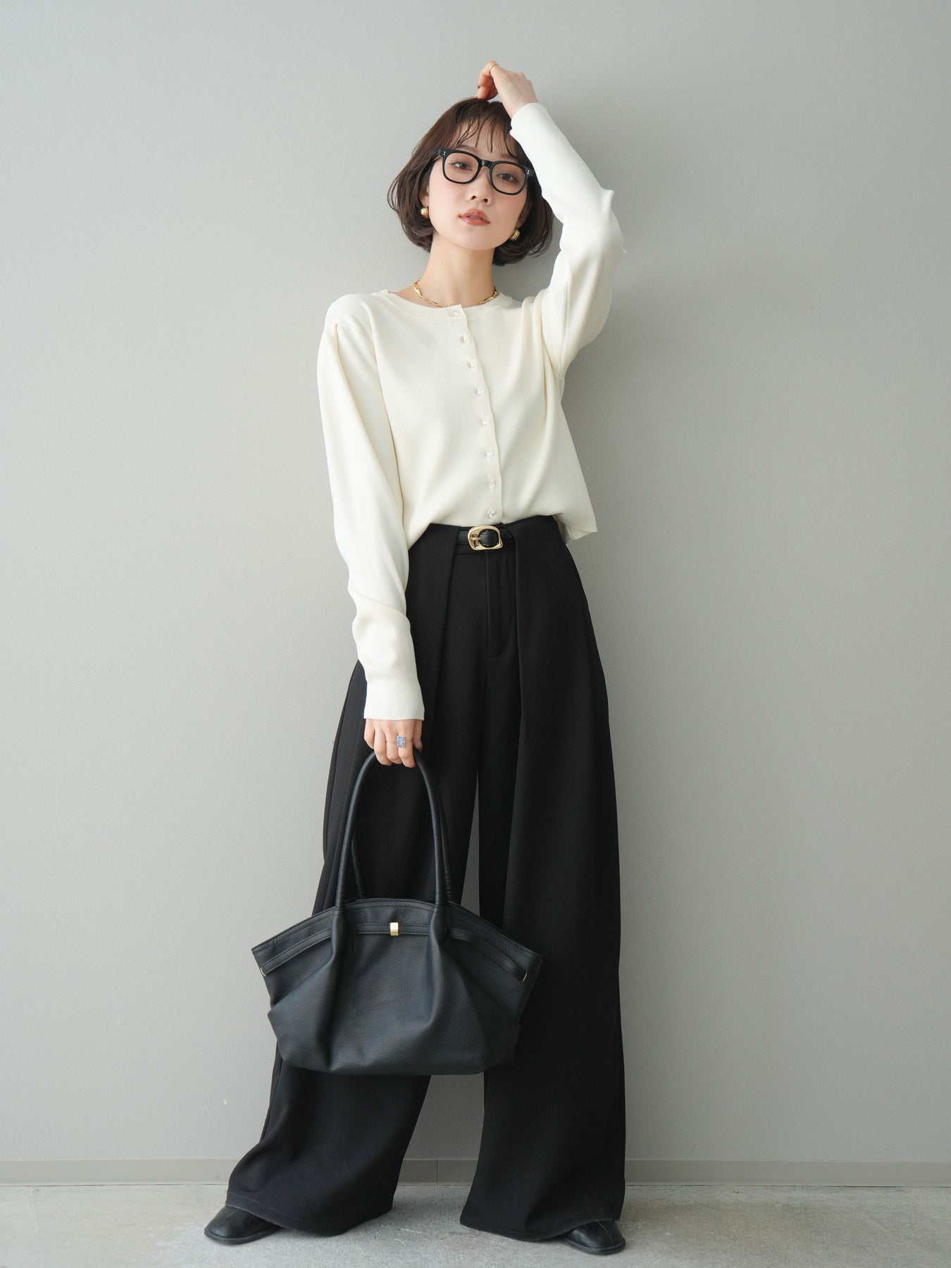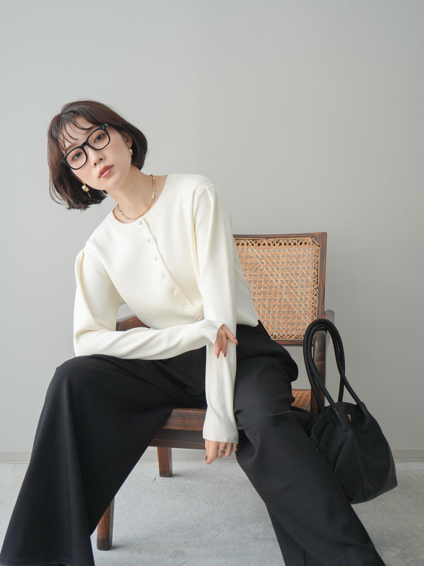 フロントに並ぶクリアボタンが、さりげない抜け感を演出するニットカーディガン。タックを施したデザインが立体感を生み、シンプルながらも表情のある一着に仕上がっています。程よくコンパクトなシルエットで、前を留めてトップスとしても、羽織りとしても着用しやすいのが魅力。きれいめにもカジュアルにも馴染み、ボトムスを選ばず幅広いスタイリングに活躍します。 ※ボトムス、キャミソール(インナー)以外の商品は一律でインナーは付属していません。