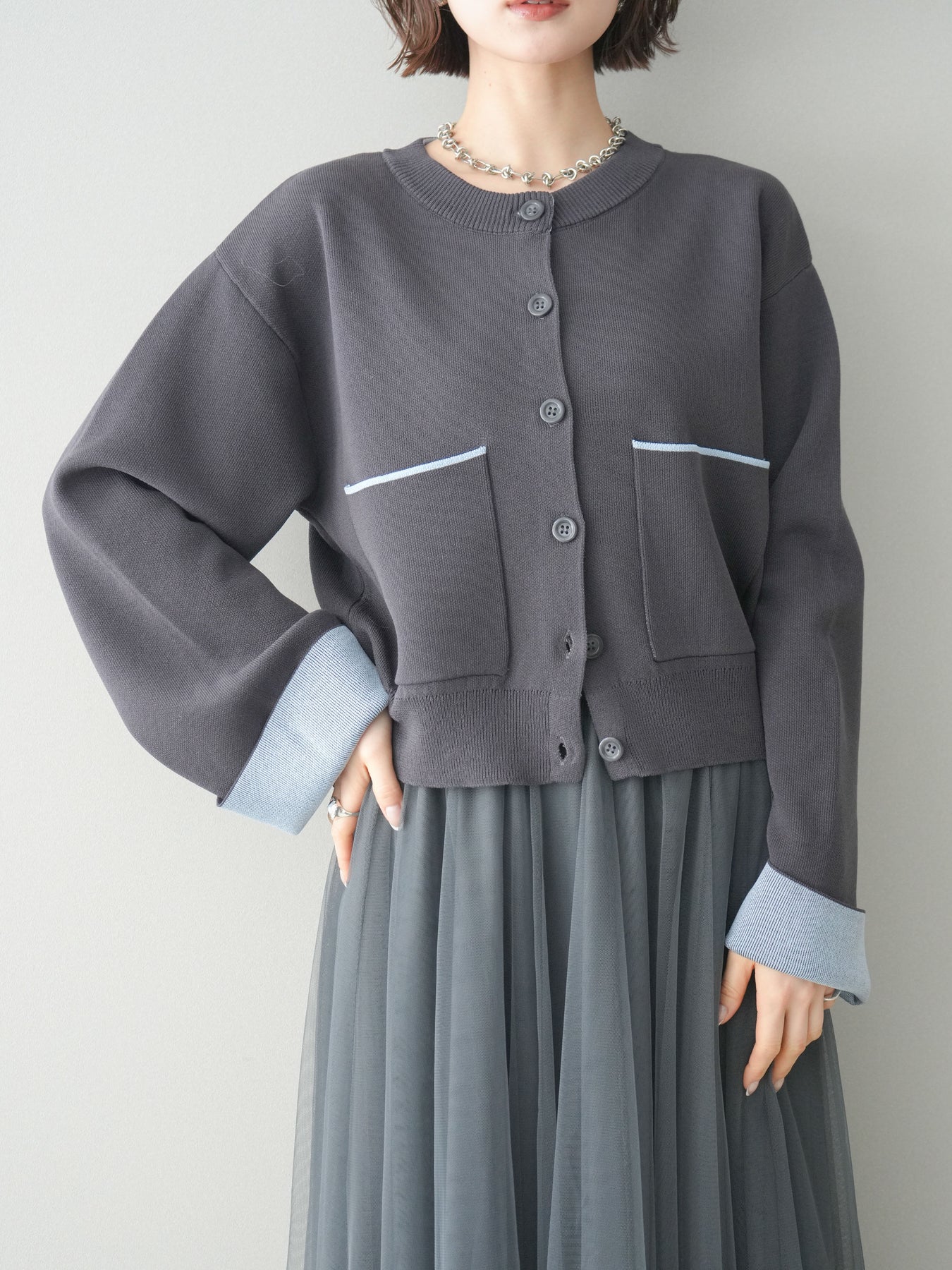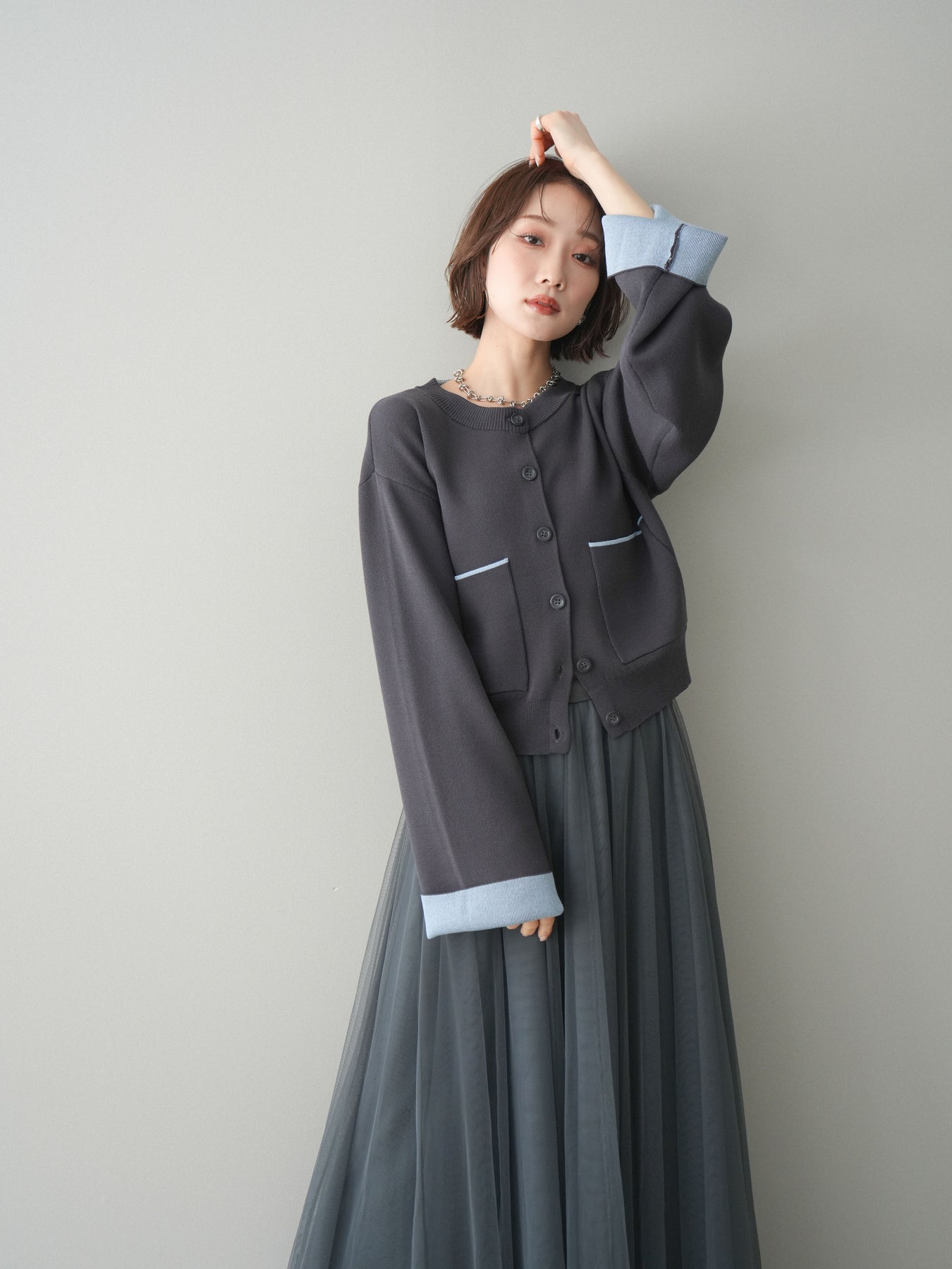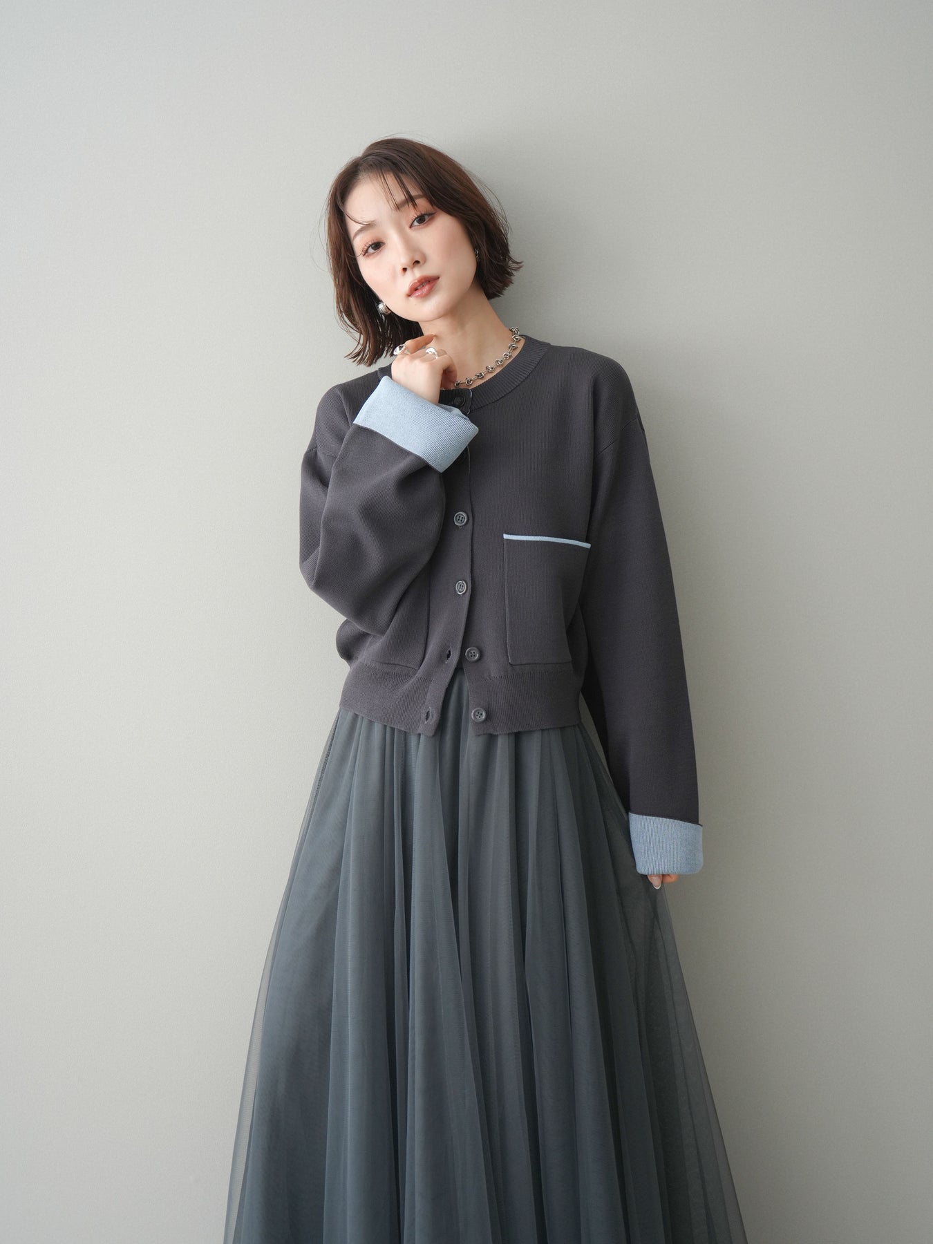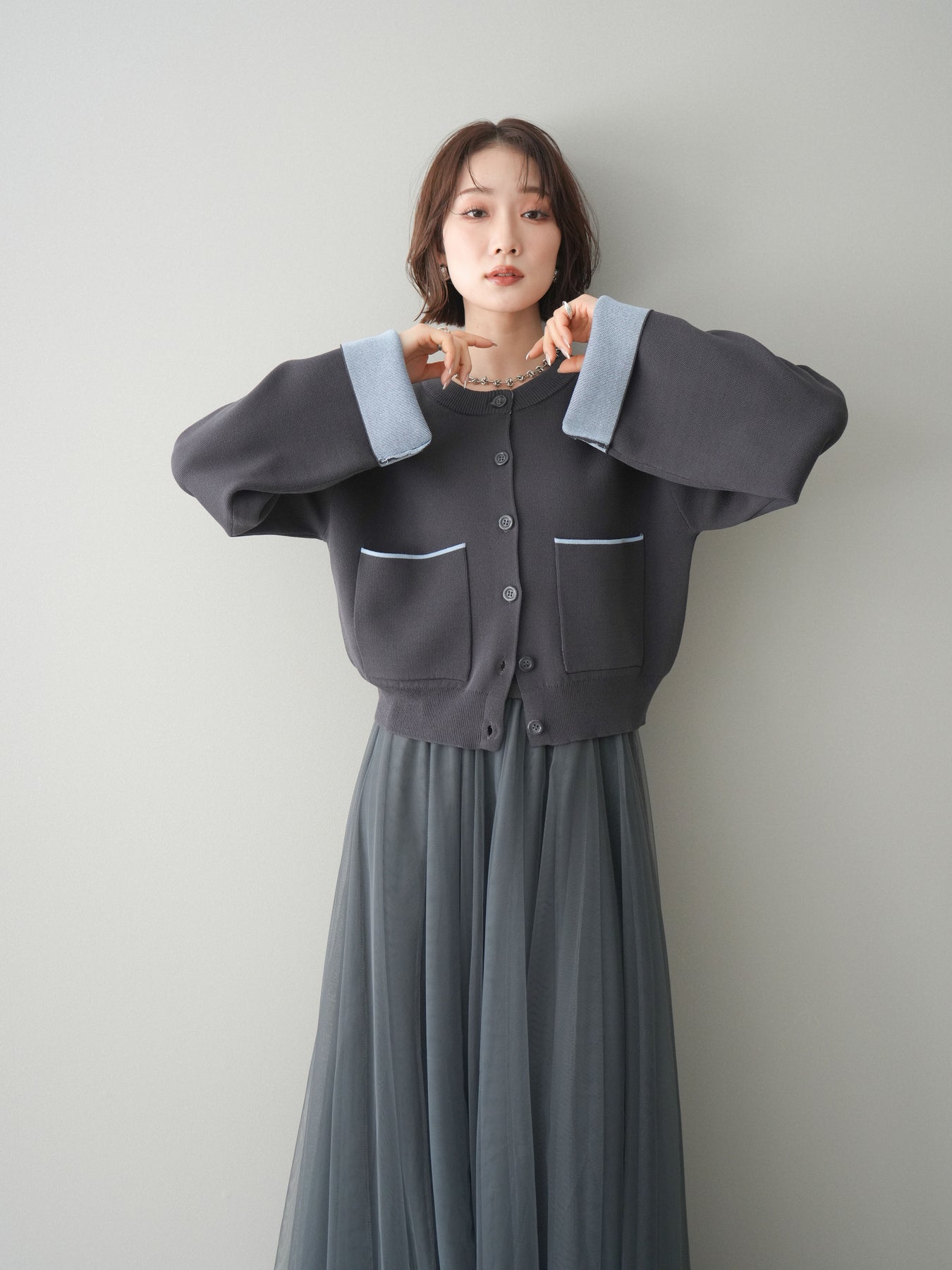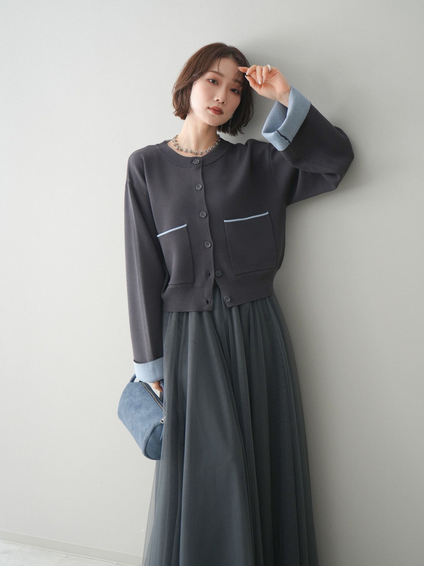滑らかな肌触りのレーヨンポリ素材を使用した、ダブルフェイス仕様のニットカーディガン。程よく厚みのある編み地が立体的なシルエットを生み、羽織るだけでこなれた印象に仕上がります。袖口やポケットにさりげなく配した配色ディテールがアクセントとなり、シンプルながらも表情のあるデザインに。前を留めてトップスとしても、軽く羽織ってもバランス良く着用でき、デイリーからきれいめスタイルまで幅広く活躍する一着です。 ※ボトムス、キャミソール(インナー)以外の商品は一律でインナーは付属していません。