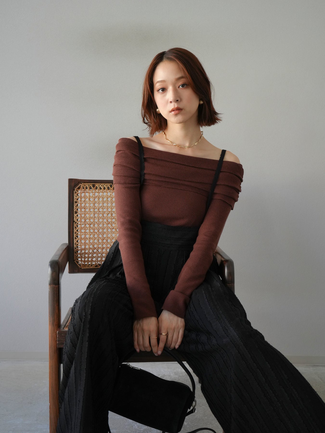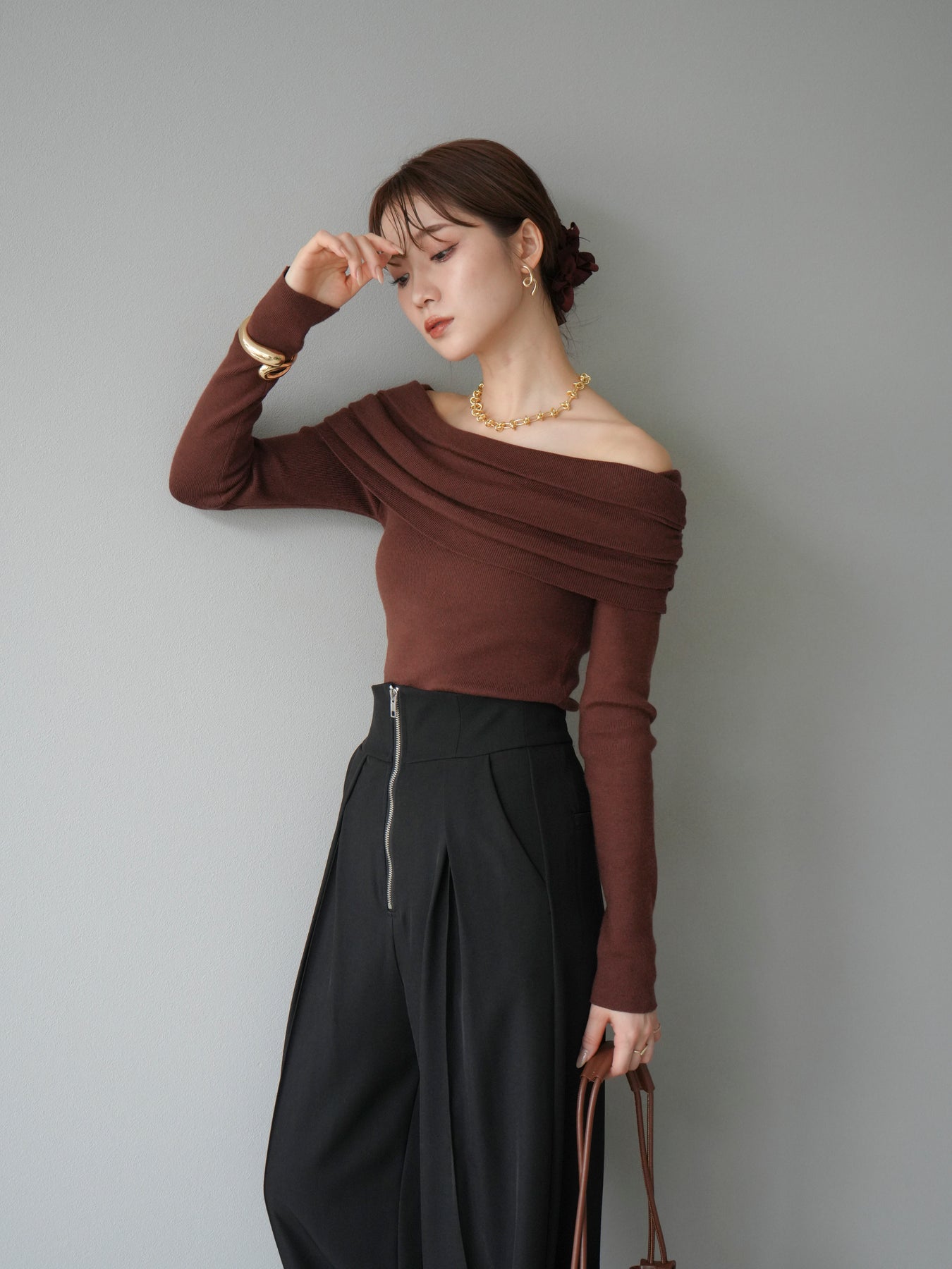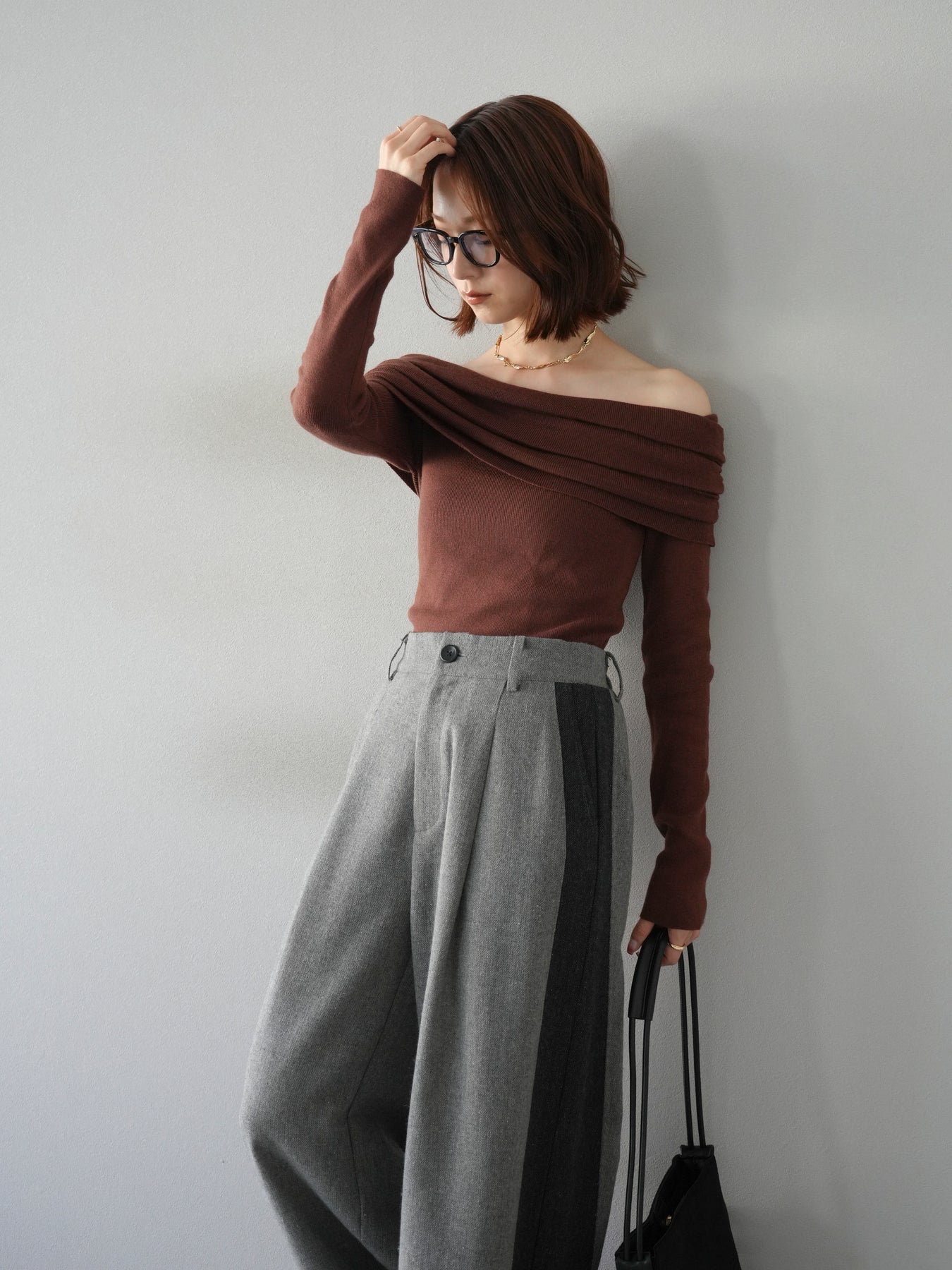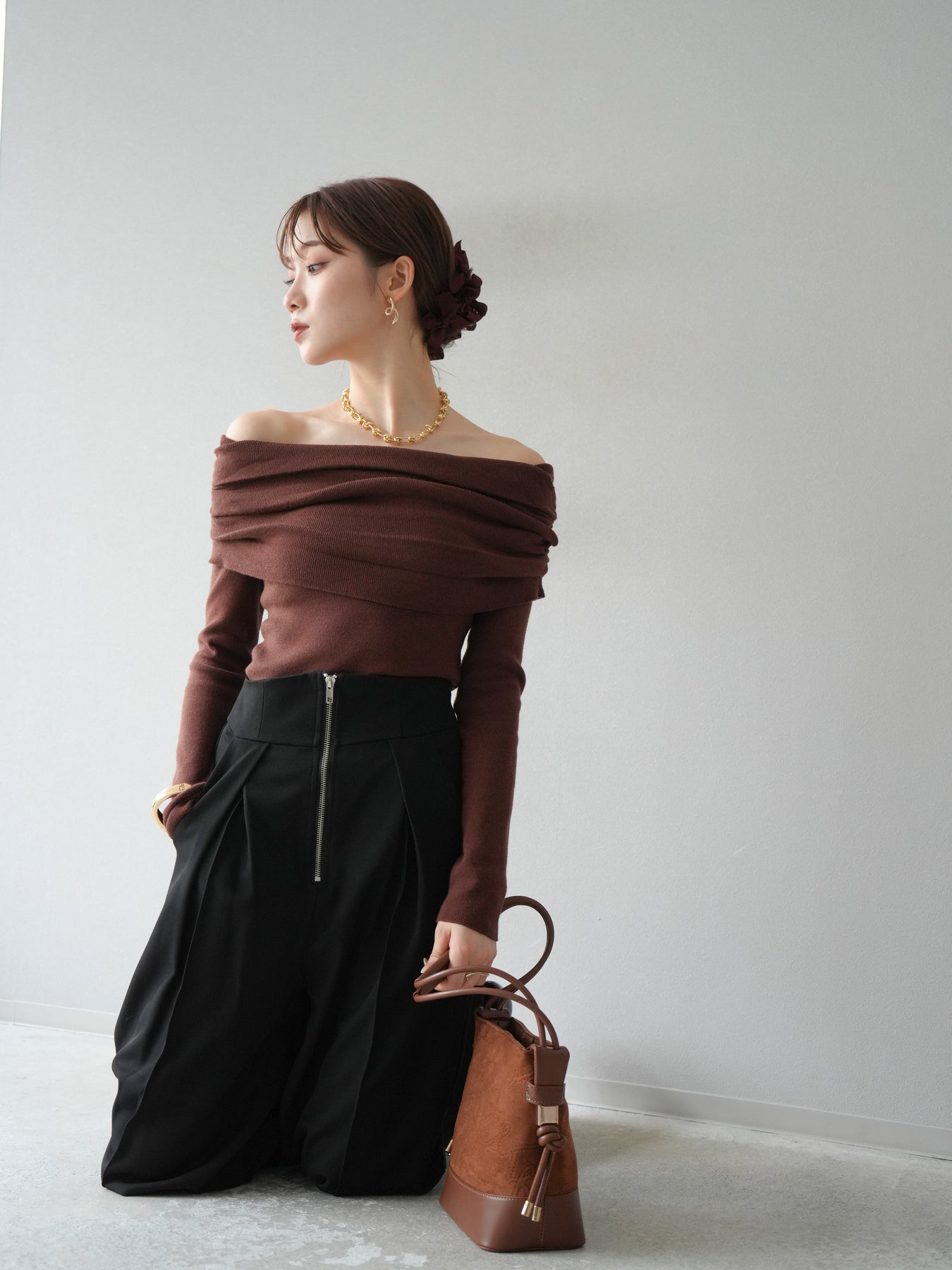 大きく開いたネックラインがデコルテを美しく見せるオフショルダーデザインのニットプルオーバー。リブ編みの切り替えが立体感を演出し、シンプルながらも華やかな印象を与えてくれます。柔らかく伸縮性のある素材を使用しており、着心地も快適。パンツと合わせて大人っぽく、スカートと合わせてフェミニンにと、幅広いコーディネートに対応できる一枚です。季節の変わり目のスタイリングにも重宝するアイテム。 ※ボトムス、キャミソール(インナー)以外の商品は一律でインナーは付属していません。