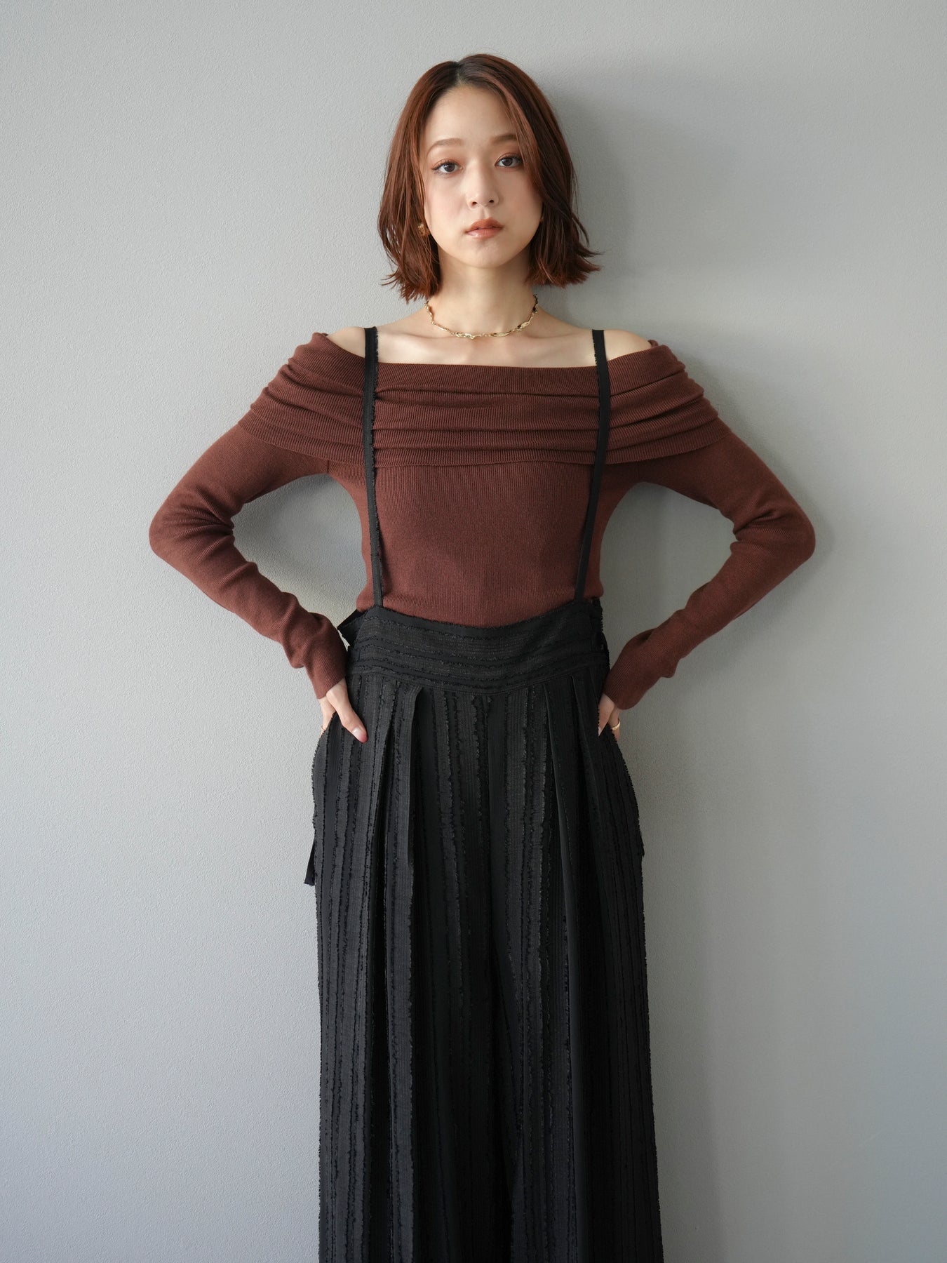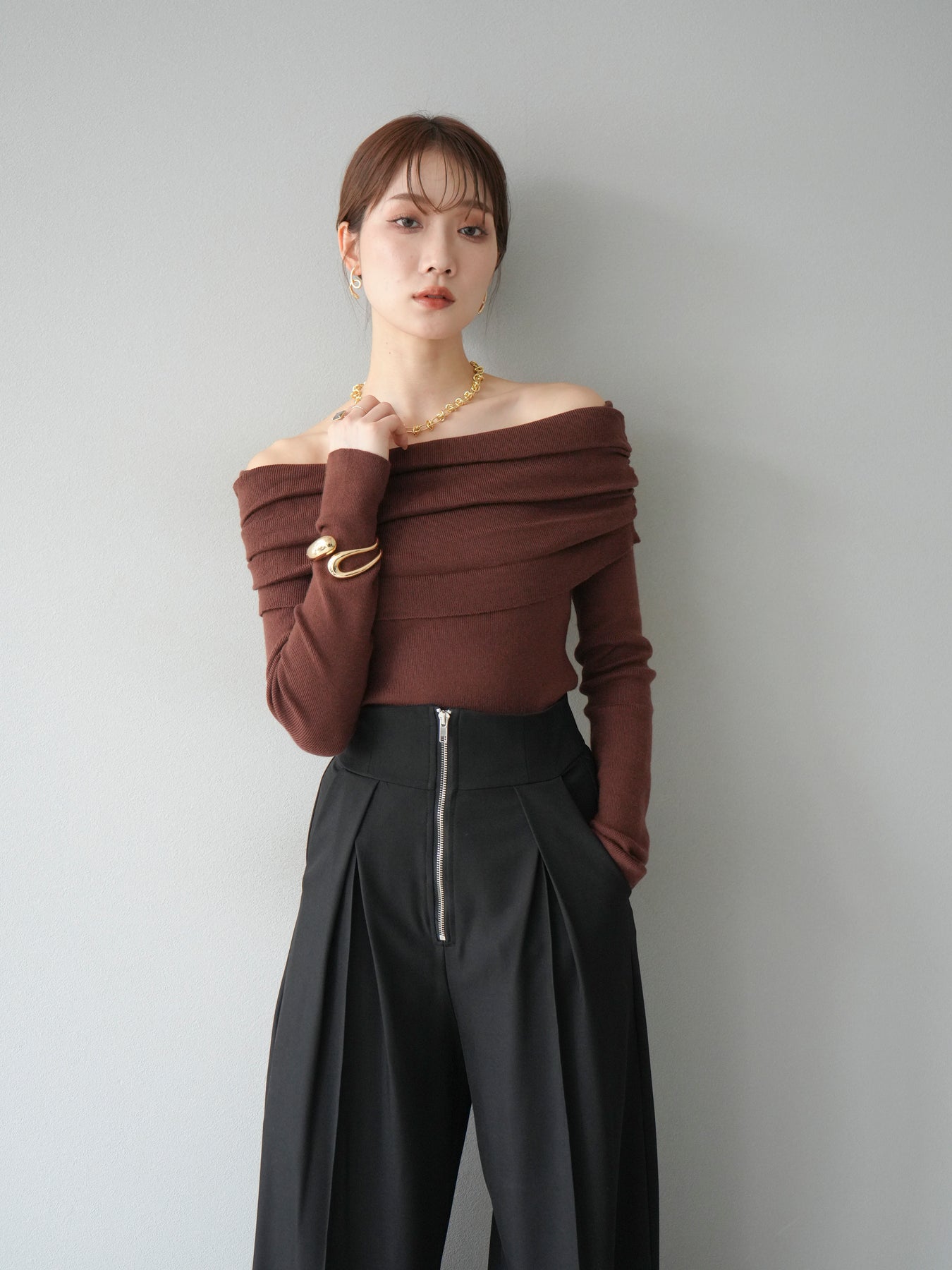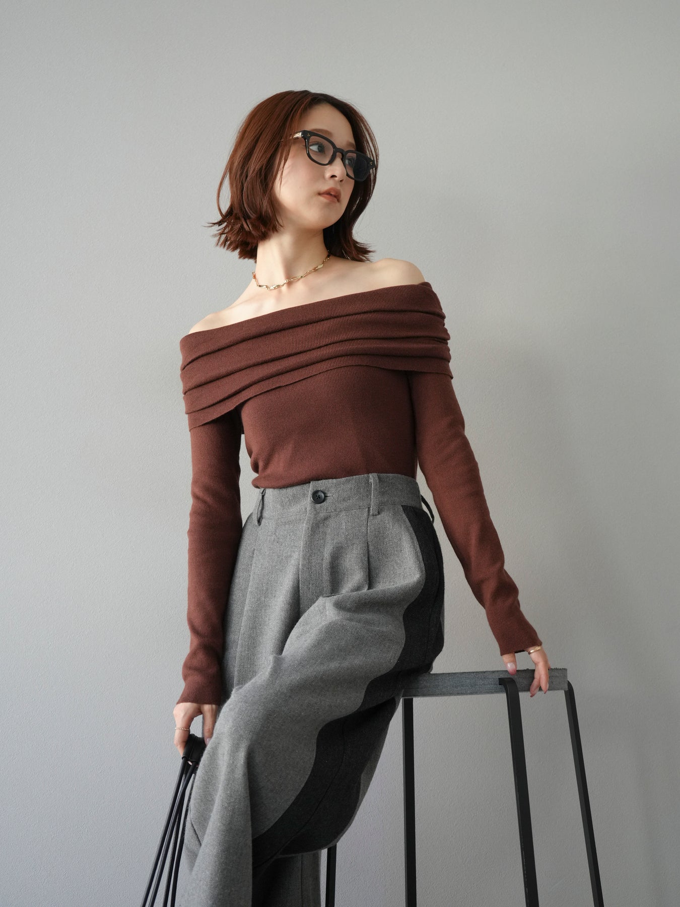 大きく開いたネックラインがデコルテを美しく見せるオフショルダーデザインのニットプルオーバー。リブ編みの切り替えが立体感を演出し、シンプルながらも華やかな印象を与えてくれます。柔らかく伸縮性のある素材を使用しており、着心地も快適。パンツと合わせて大人っぽく、スカートと合わせてフェミニンにと、幅広いコーディネートに対応できる一枚です。季節の変わり目のスタイリングにも重宝するアイテム。 ※ボトムス、キャミソール(インナー)以外の商品は一律でインナーは付属していません。
