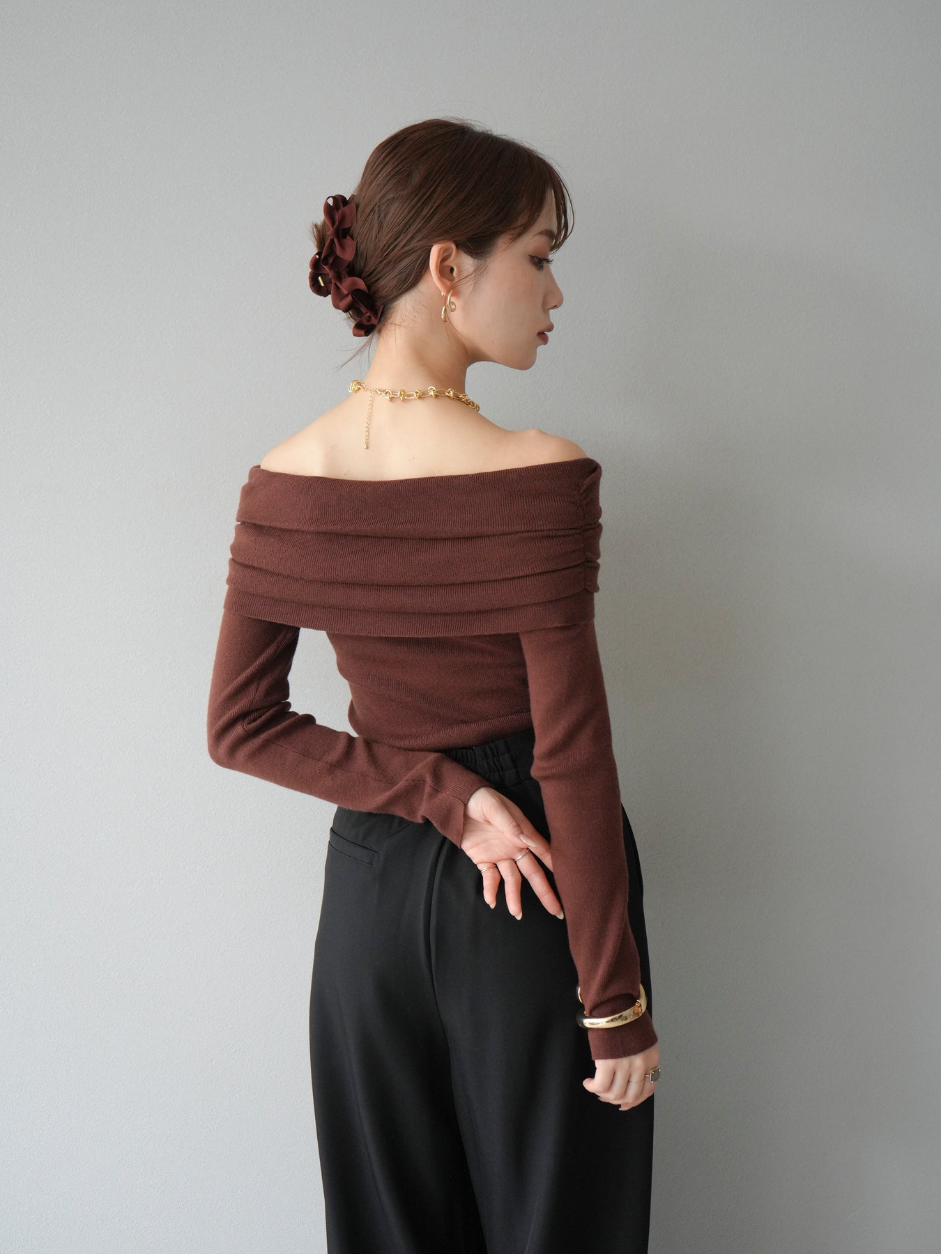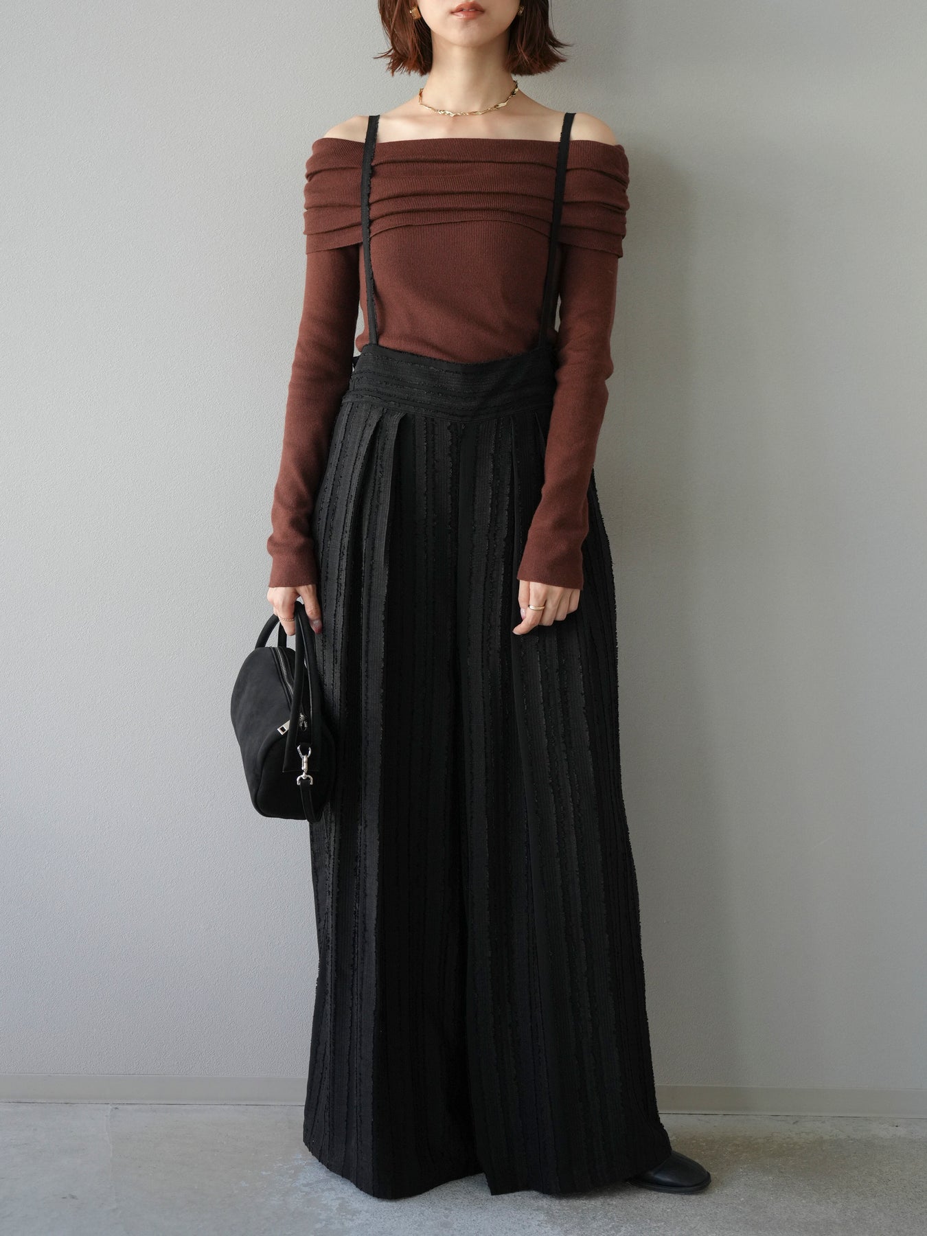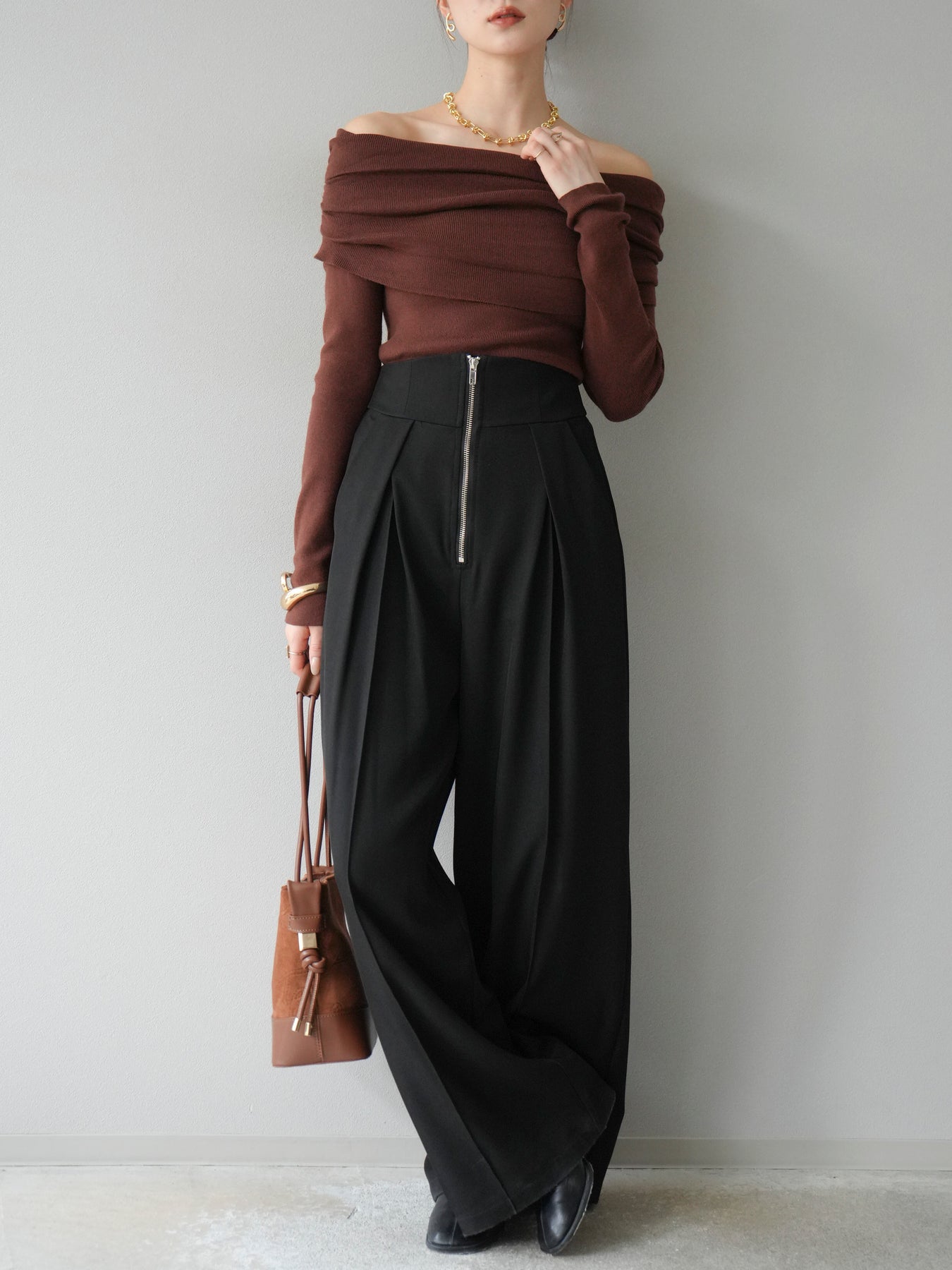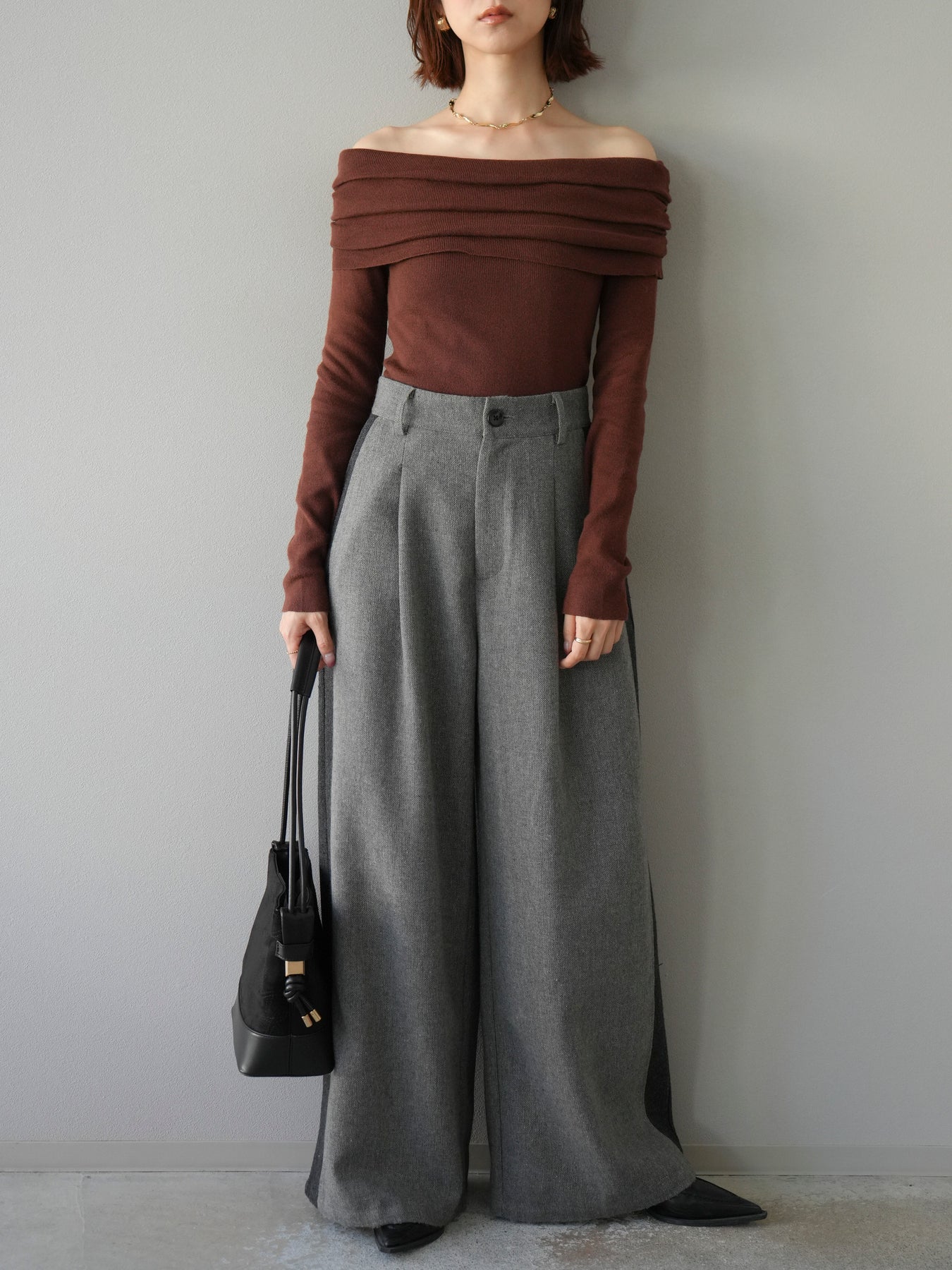 大きく開いたネックラインがデコルテを美しく見せるオフショルダーデザインのニットプルオーバー。リブ編みの切り替えが立体感を演出し、シンプルながらも華やかな印象を与えてくれます。柔らかく伸縮性のある素材を使用しており、着心地も快適。パンツと合わせて大人っぽく、スカートと合わせてフェミニンにと、幅広いコーディネートに対応できる一枚です。季節の変わり目のスタイリングにも重宝するアイテム。 ※ボトムス、キャミソール(インナー)以外の商品は一律でインナーは付属していません。