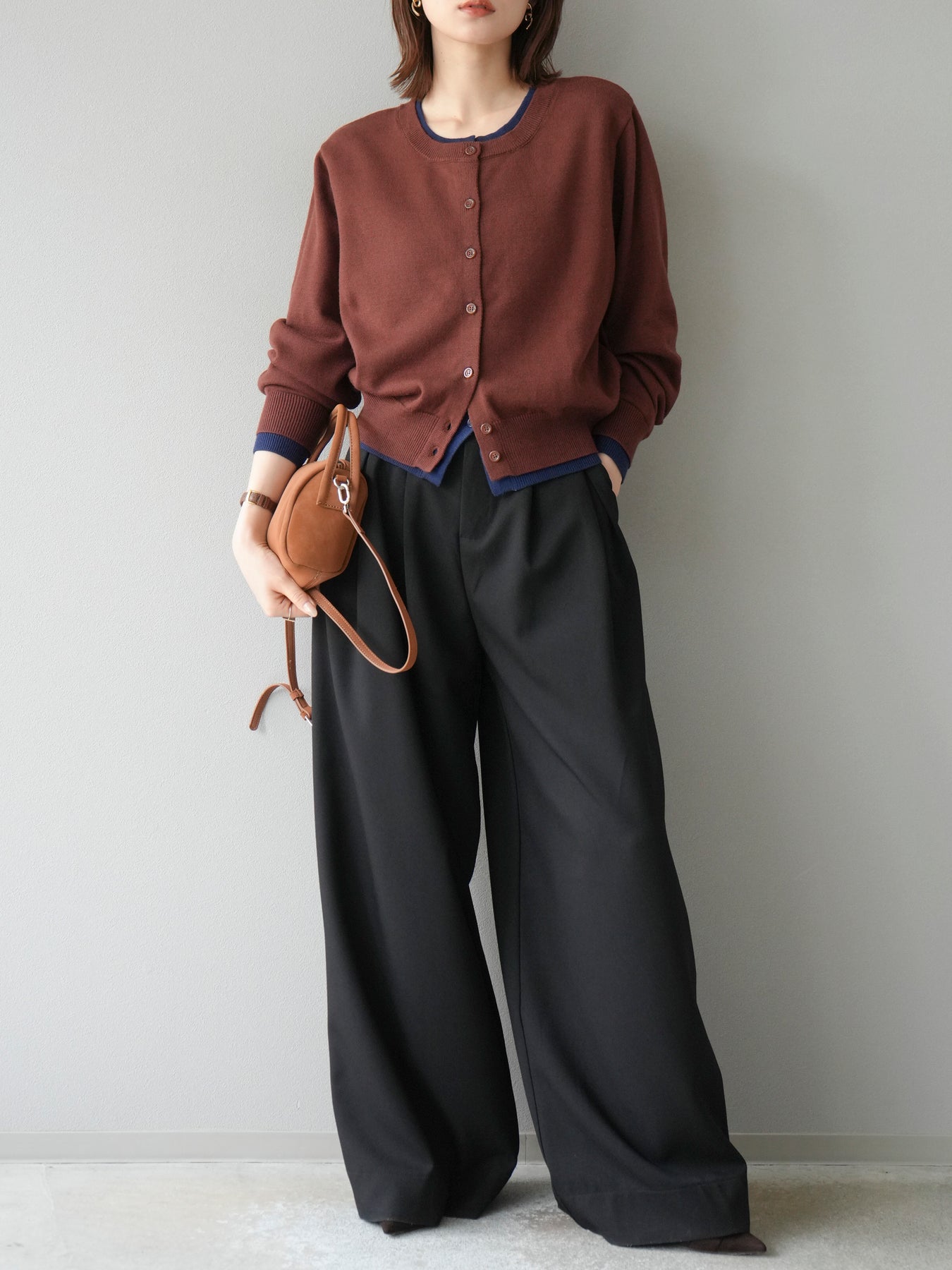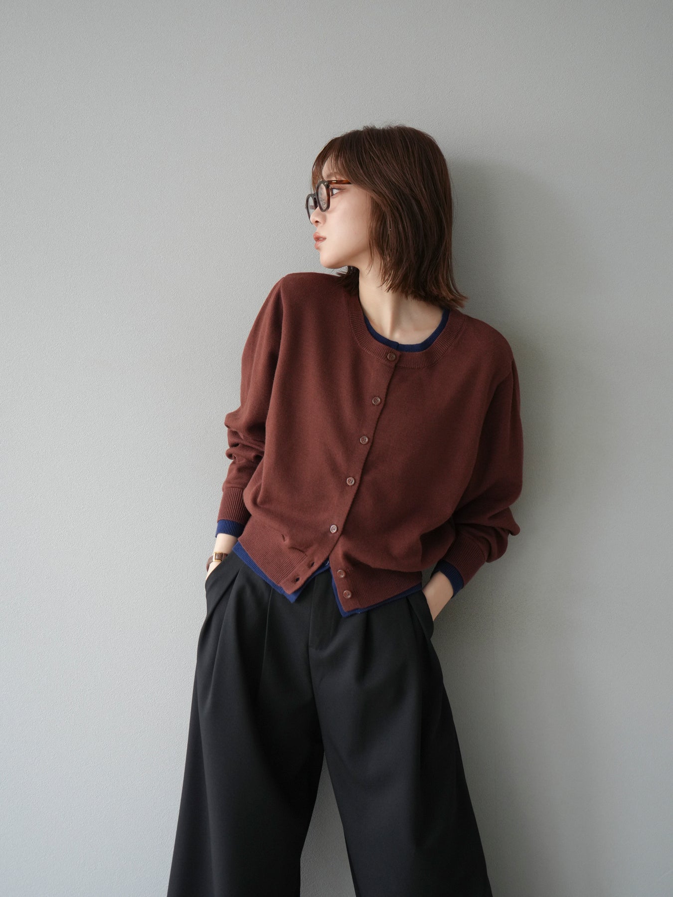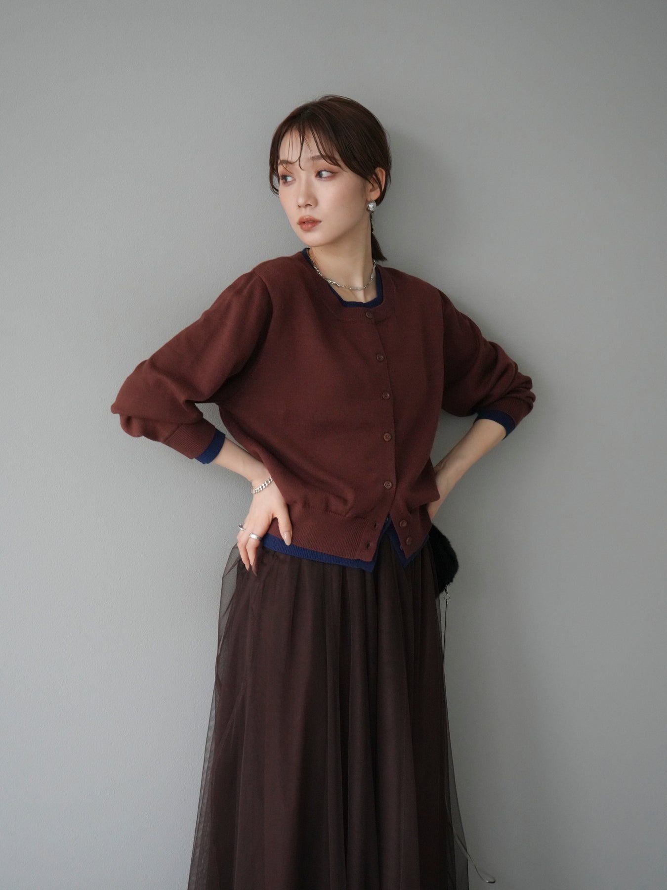 【預購】顏色協調的多層開襟衫/棕色