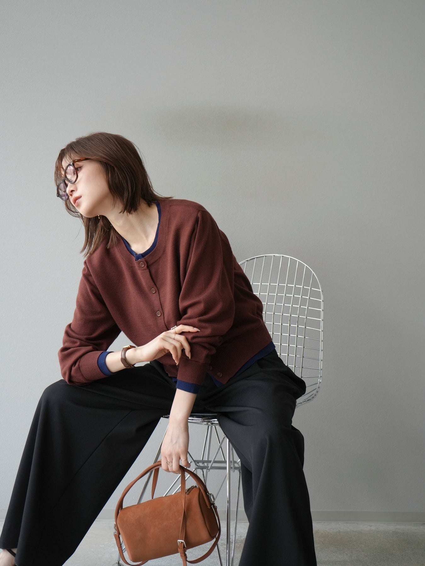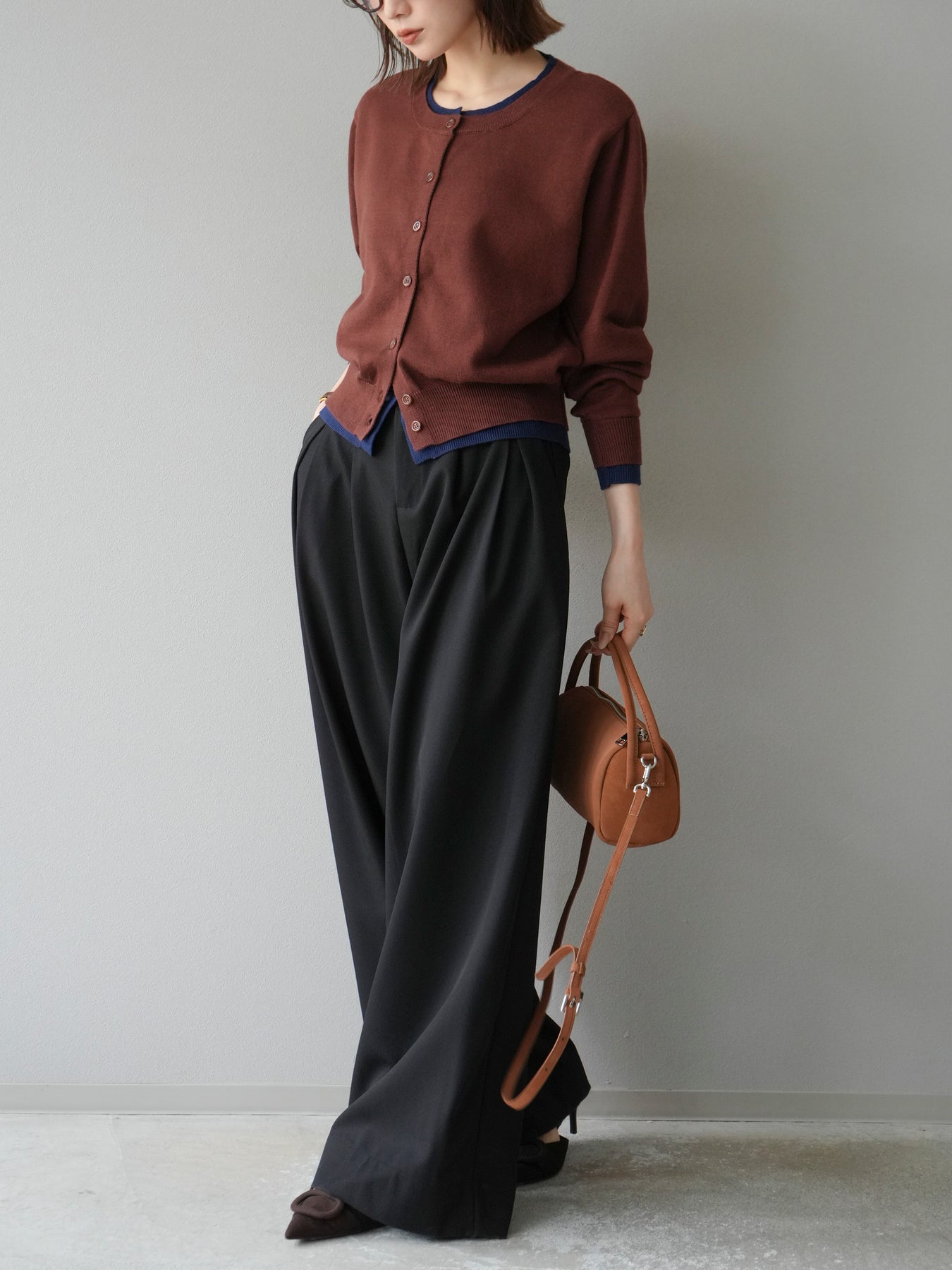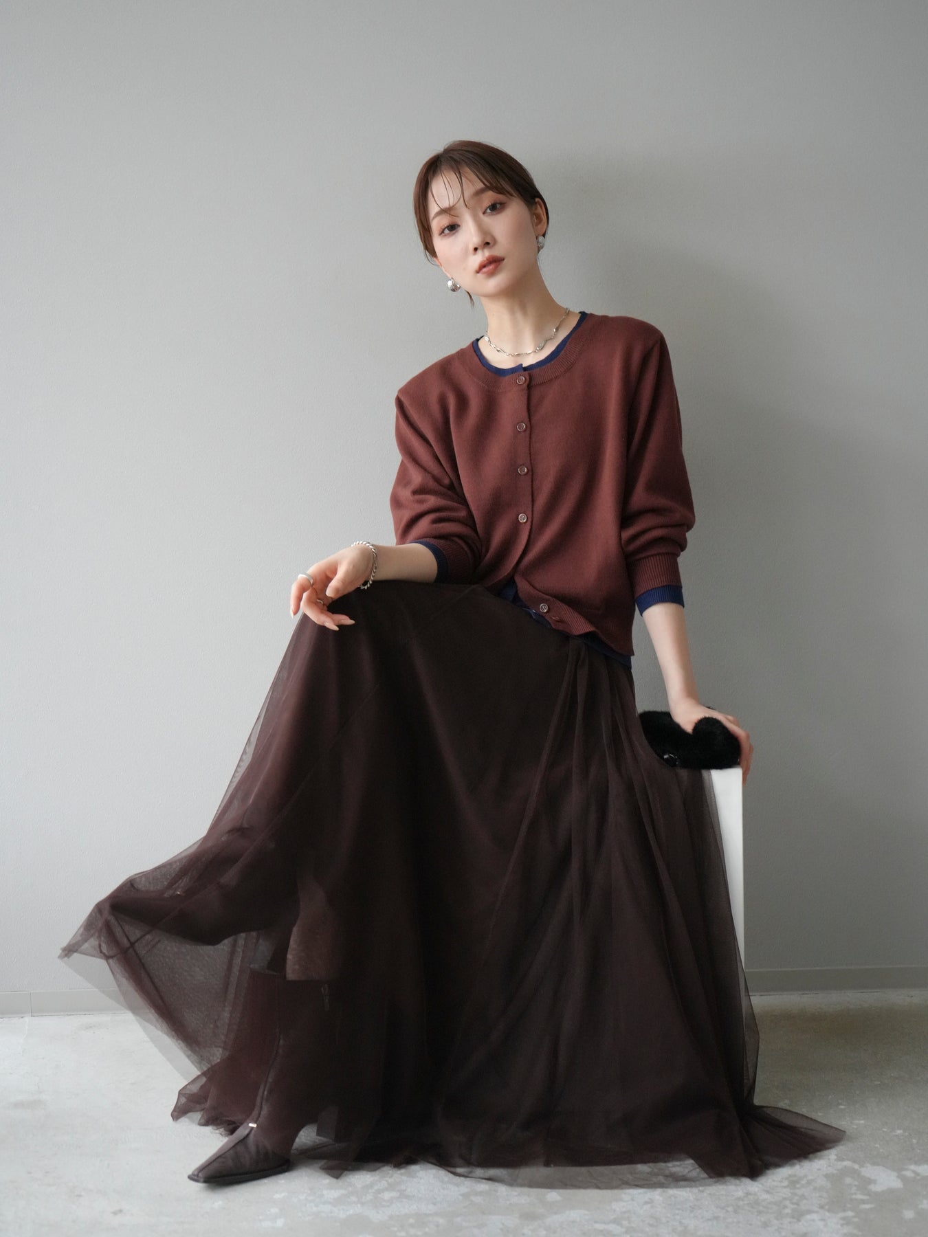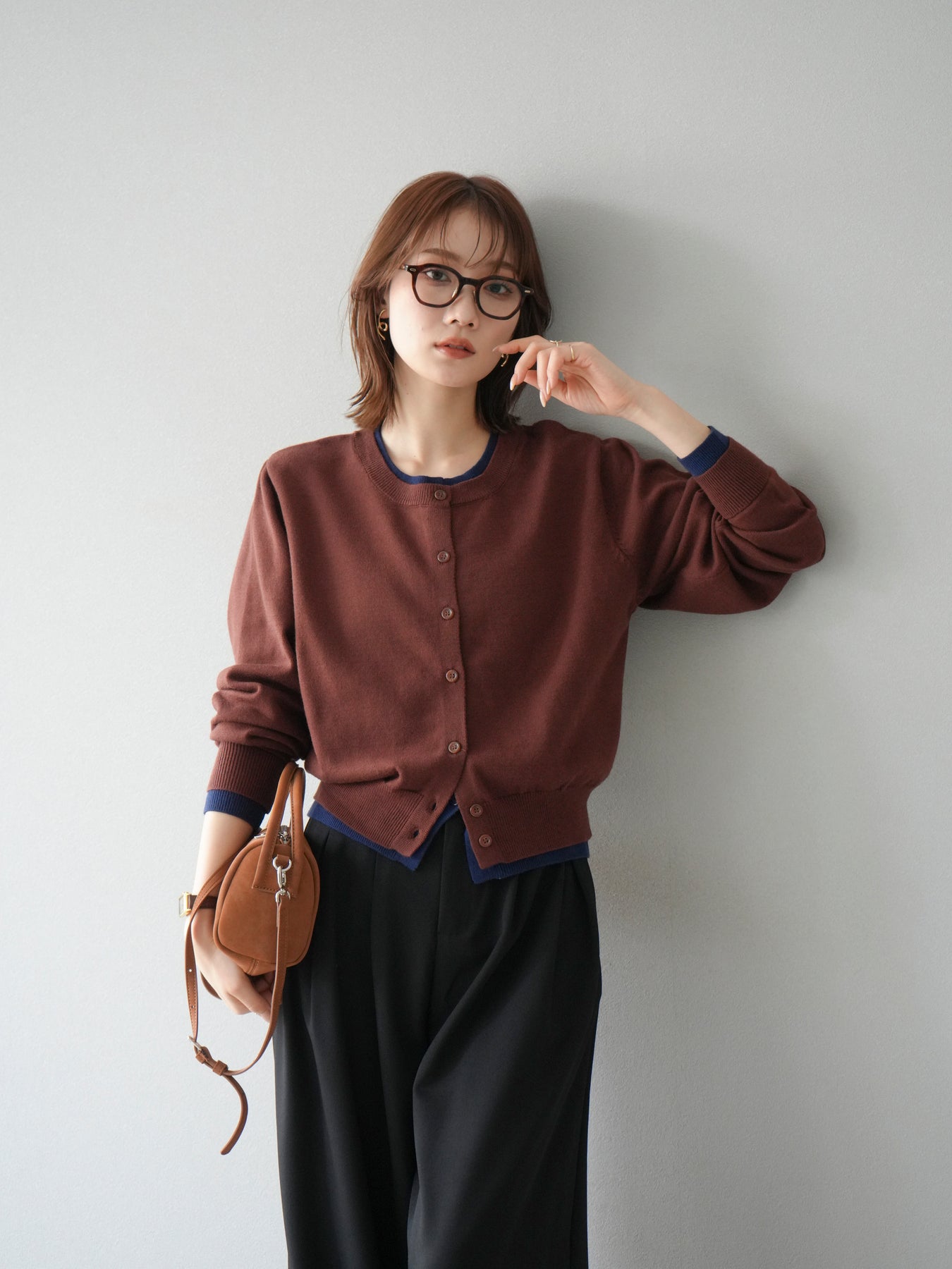 【預購】顏色協調的多層開襟衫/棕色