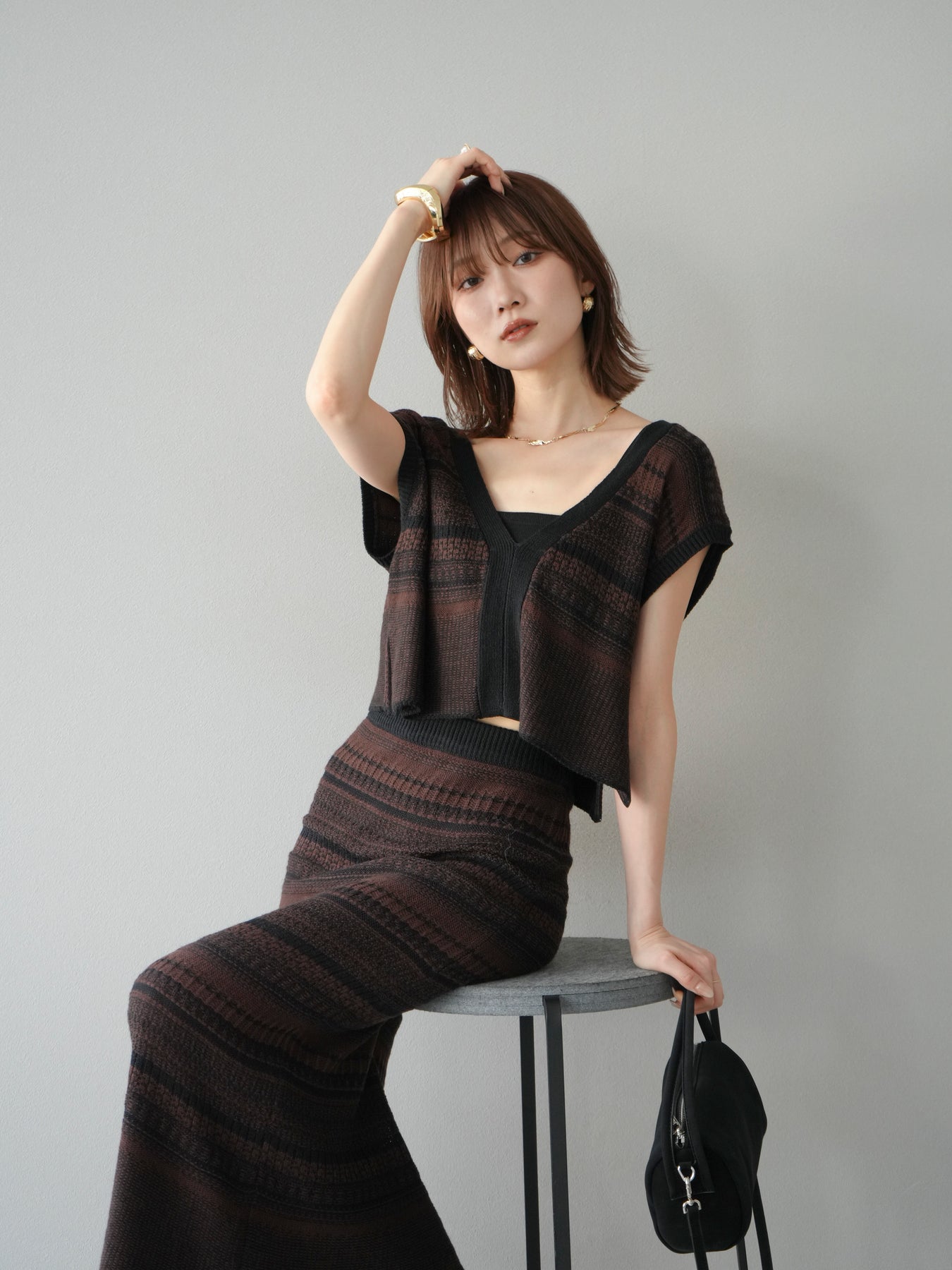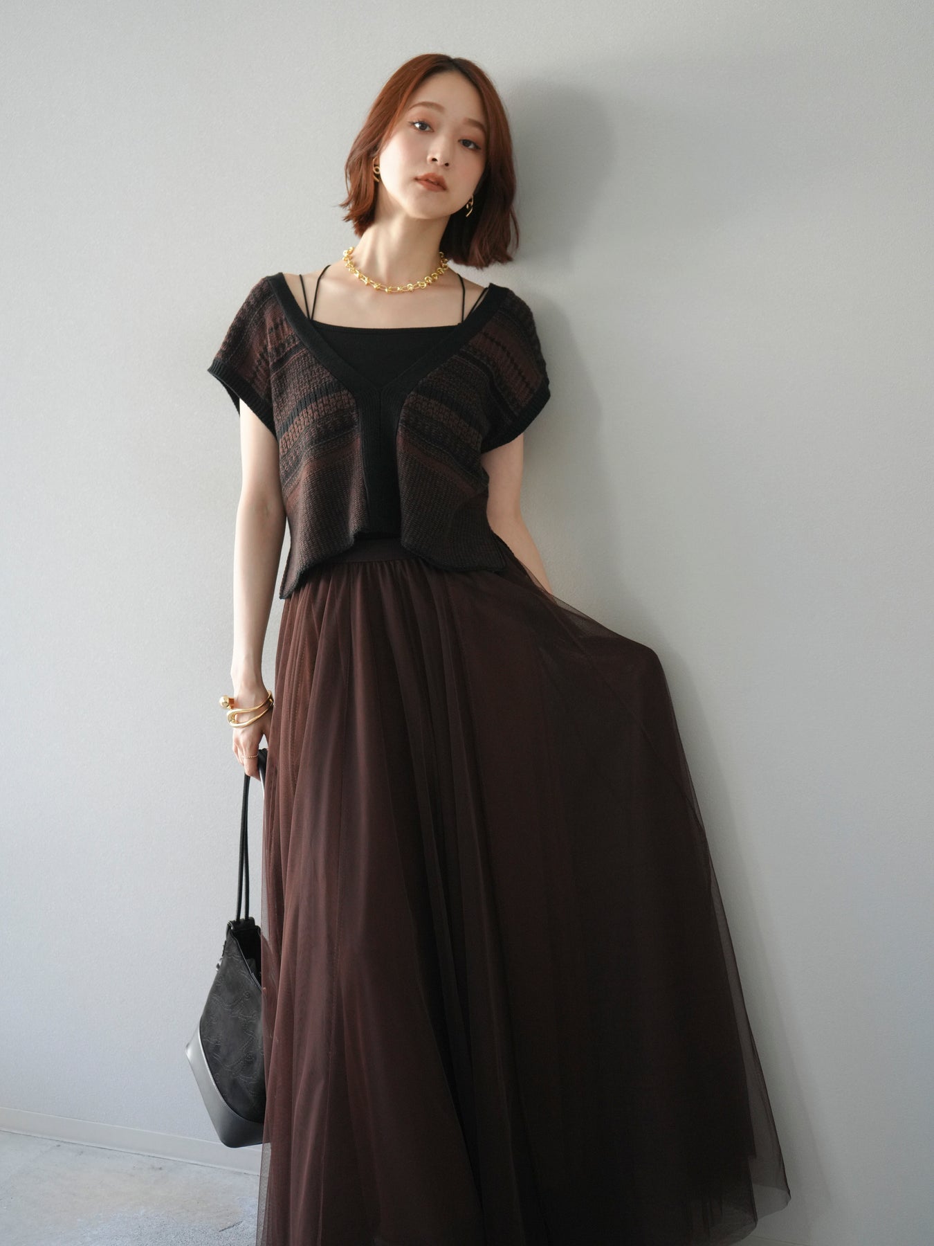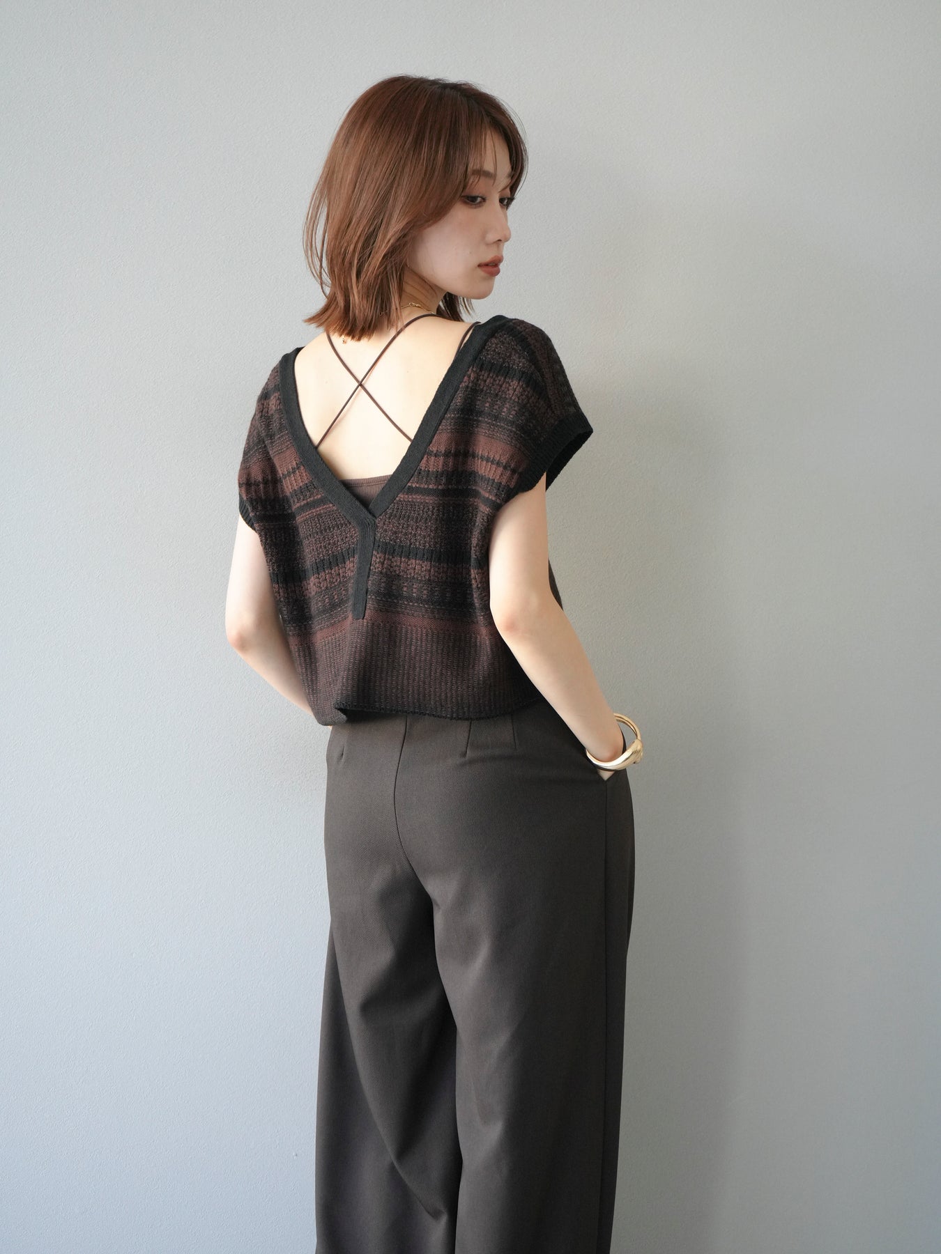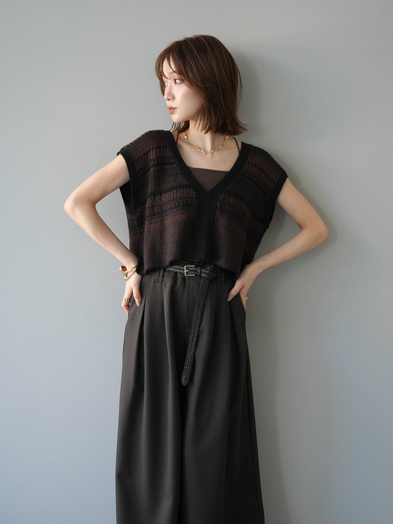 表情豊かなガーター編みをベースにした2WAY仕様のニットベスト。前後どちらでも着用できるデザインで、気分やスタイリングに合わせてアレンジが楽しめます。Vネックをフロントにすれば抜け感のある印象に、クルーネックを前にすればベーシックに着こなせる万能アイテム。シャツやワンピースとのレイヤードはもちろん、シンプルなカットソーに重ねるだけでコーディネートが決まります。 ※ボトムス、キャミソール(インナー)以外の商品は一律でインナーは付属していません。