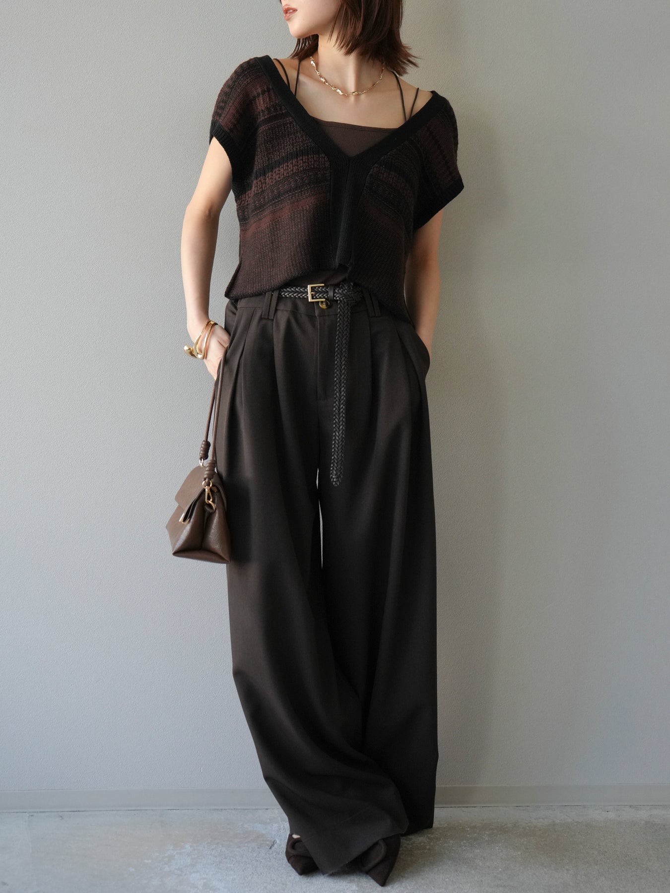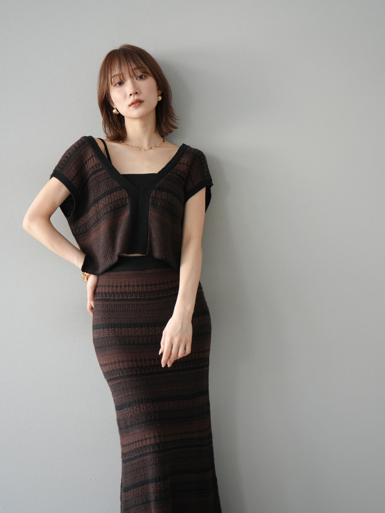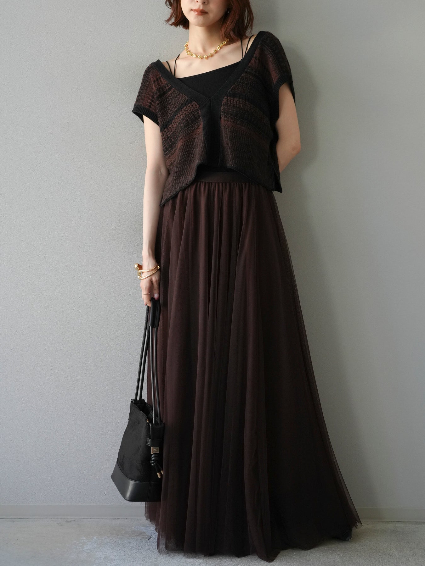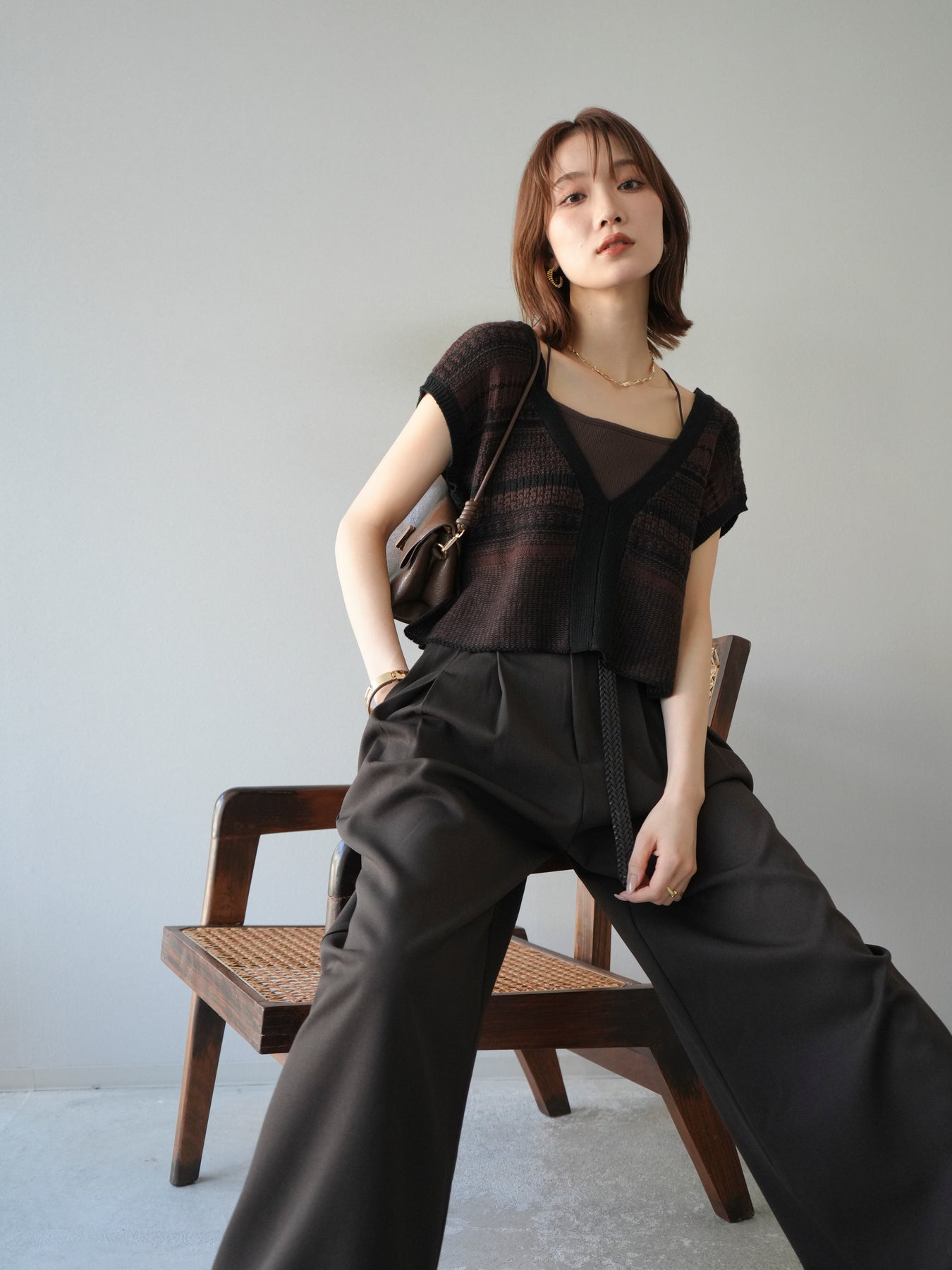 表情豊かなガーター編みをベースにした2WAY仕様のニットベスト。前後どちらでも着用できるデザインで、気分やスタイリングに合わせてアレンジが楽しめます。Vネックをフロントにすれば抜け感のある印象に、クルーネックを前にすればベーシックに着こなせる万能アイテム。シャツやワンピースとのレイヤードはもちろん、シンプルなカットソーに重ねるだけでコーディネートが決まります。 ※ボトムス、キャミソール(インナー)以外の商品は一律でインナーは付属していません。