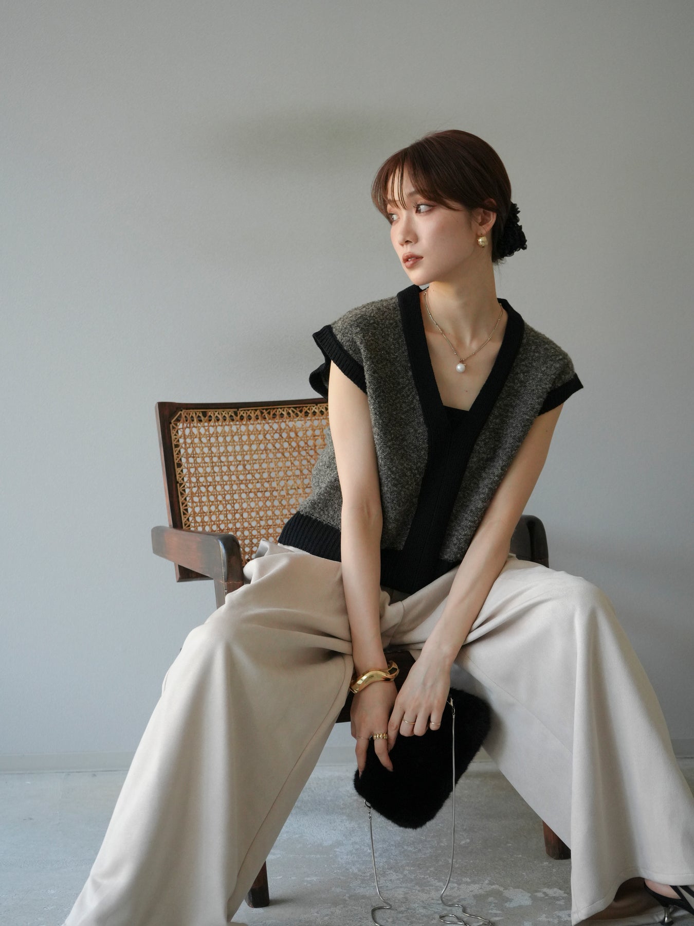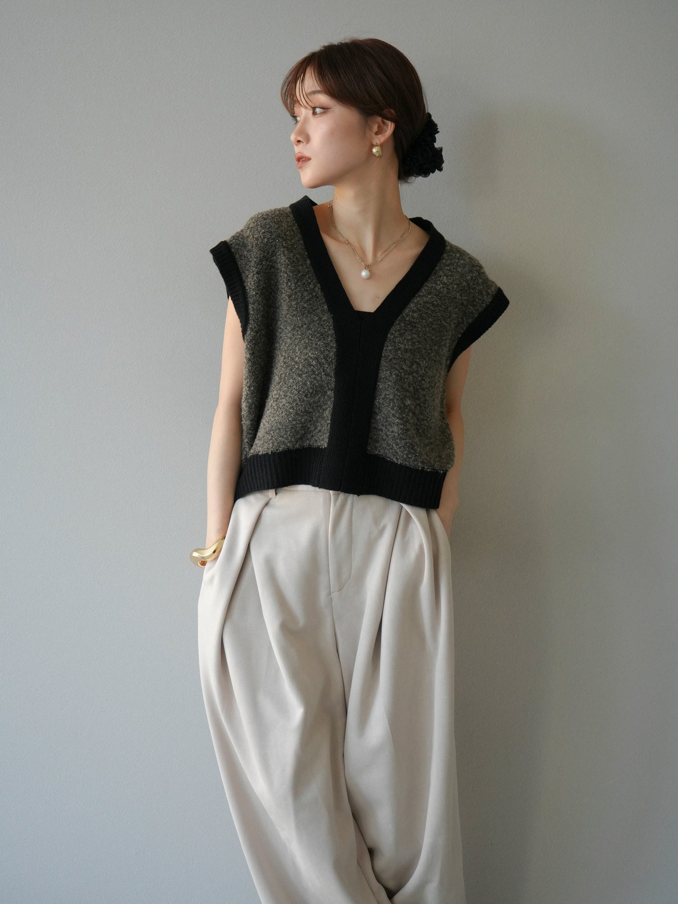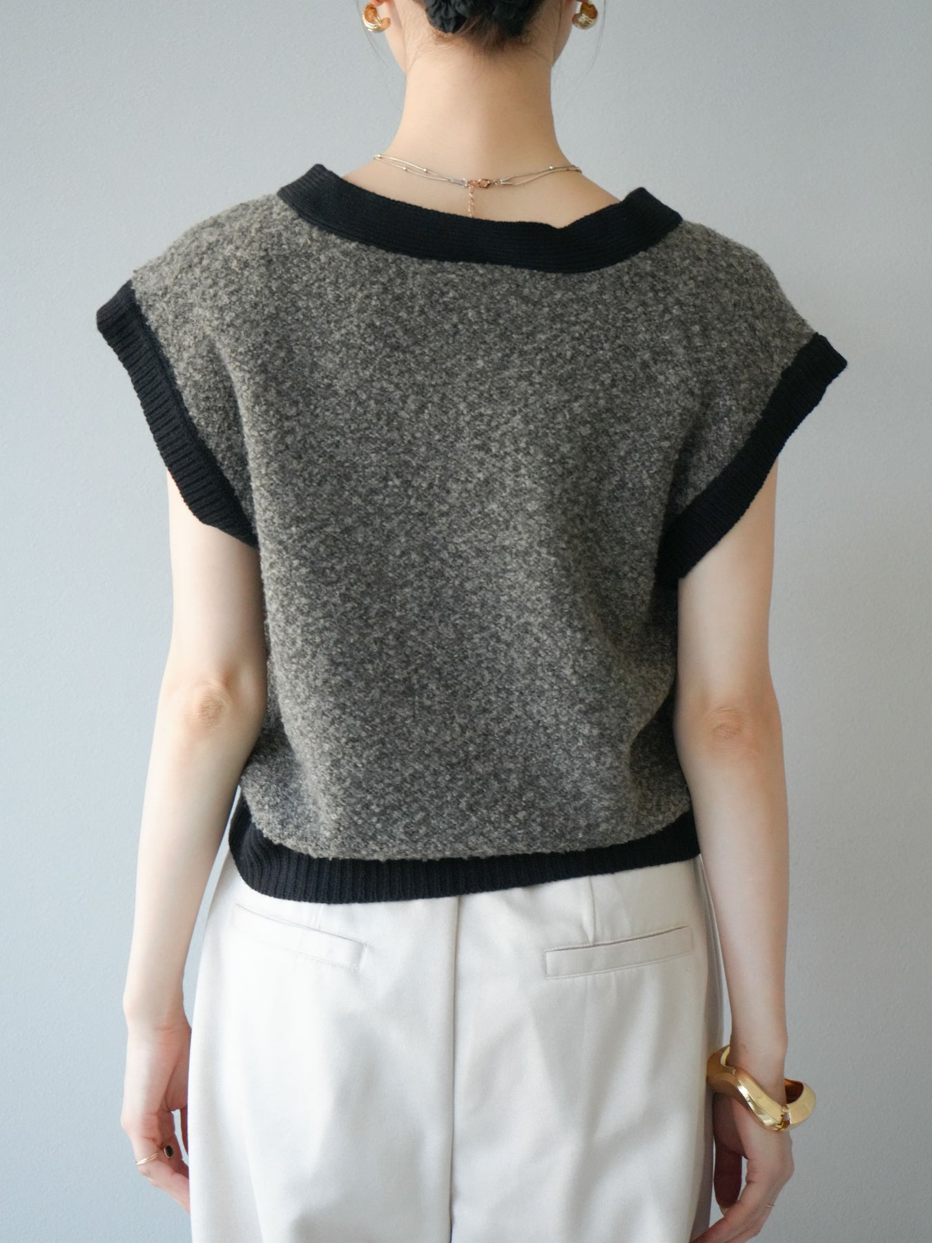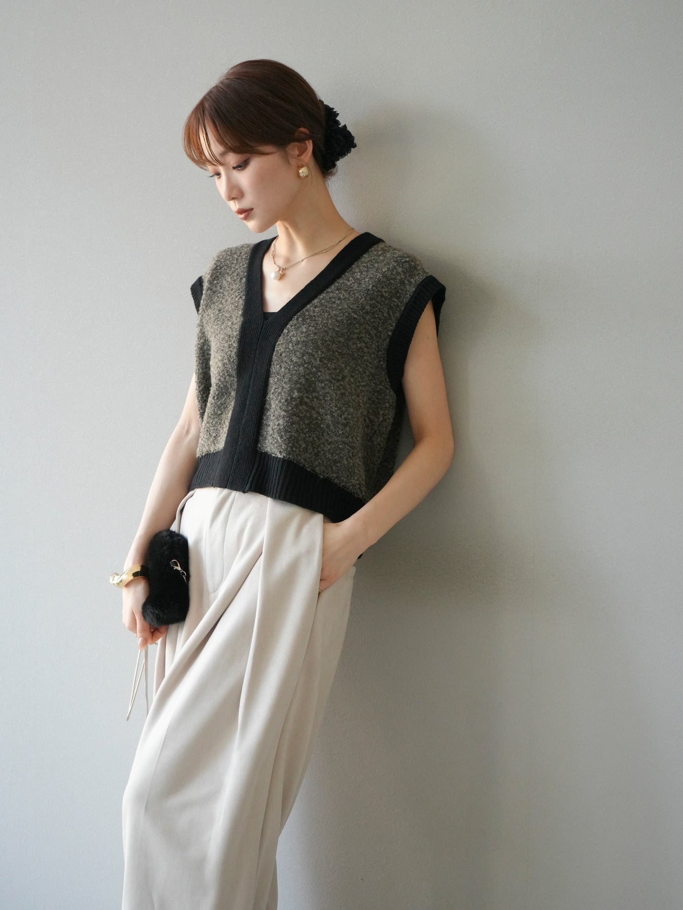 表情豊かなブークレ素材を使用したニットベスト。Vネックのデザインとバイカラーの切り替えがスタイリングにメリハリを与え、シンプルながらも存在感のある仕上がりです。程よい丈感でシャツやカットソーとのレイヤードがしやすく、シーズンを通して幅広く活躍。スカートにもパンツにも合わせやすく、コーディネートのアクセントとして取り入れるだけでこなれ感を演出してくれる万能アイテムです。 ※ボトムス、キャミソール(インナー)以外の商品は一律でインナーは付属していません。