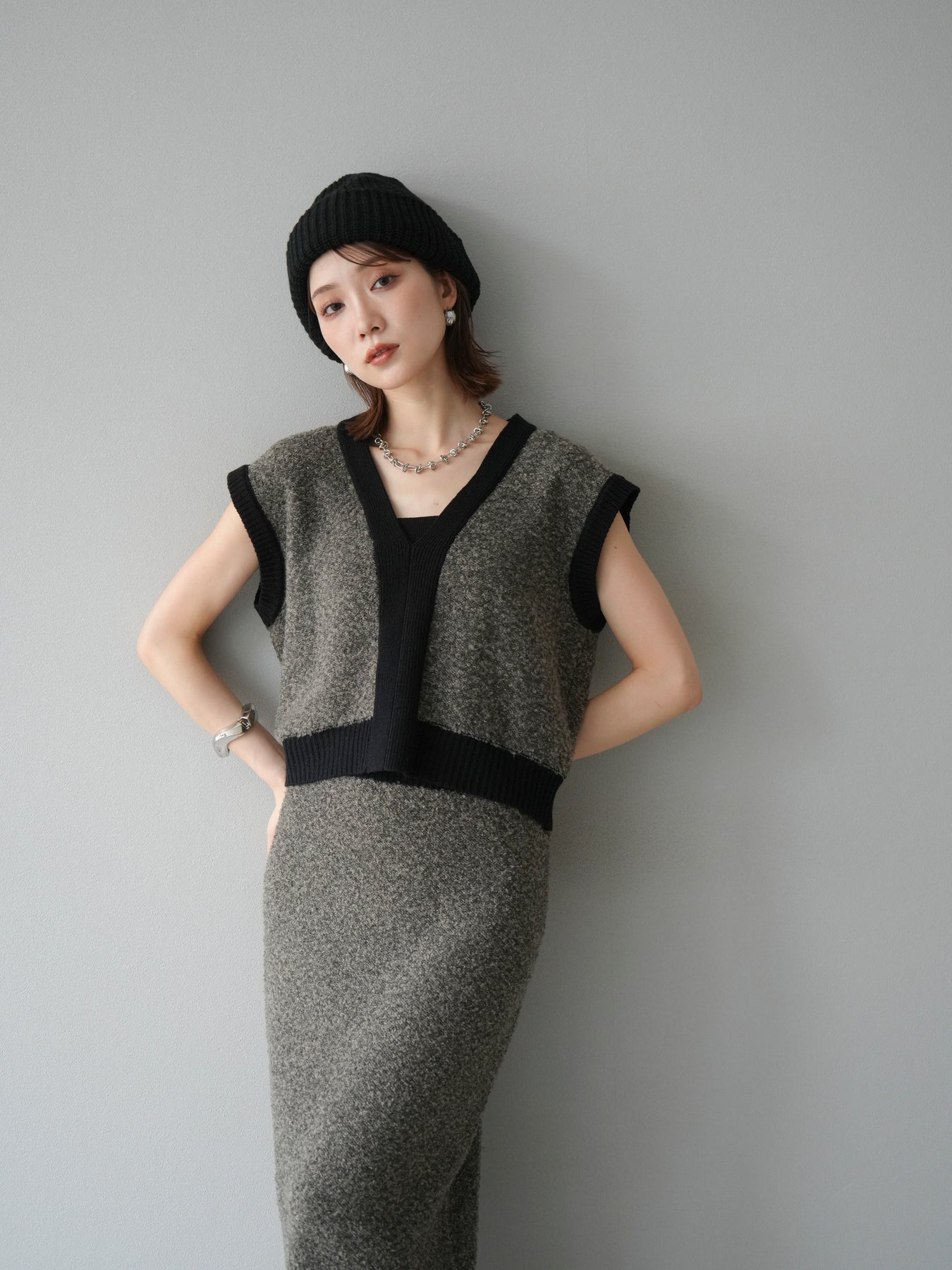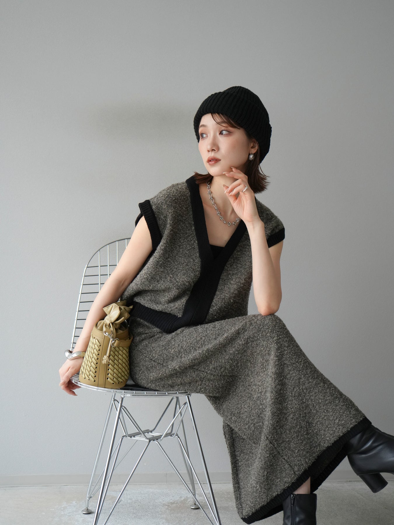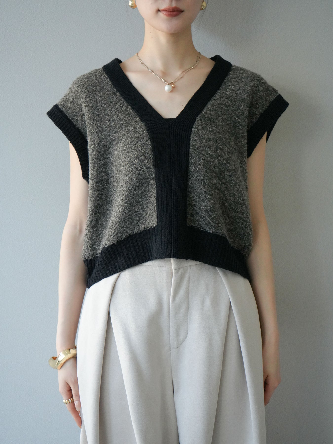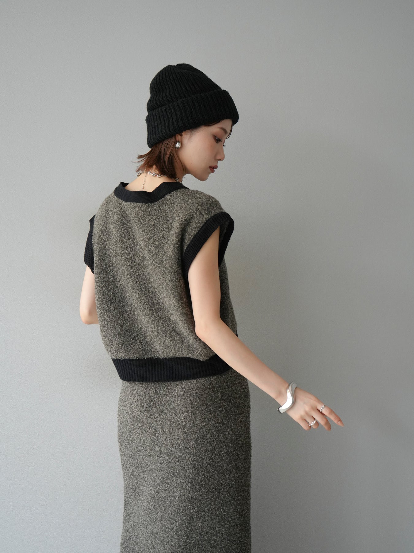 表情豊かなブークレ素材を使用したニットベスト。Vネックのデザインとバイカラーの切り替えがスタイリングにメリハリを与え、シンプルながらも存在感のある仕上がりです。程よい丈感でシャツやカットソーとのレイヤードがしやすく、シーズンを通して幅広く活躍。スカートにもパンツにも合わせやすく、コーディネートのアクセントとして取り入れるだけでこなれ感を演出してくれる万能アイテムです。 ※ボトムス、キャミソール(インナー)以外の商品は一律でインナーは付属していません。