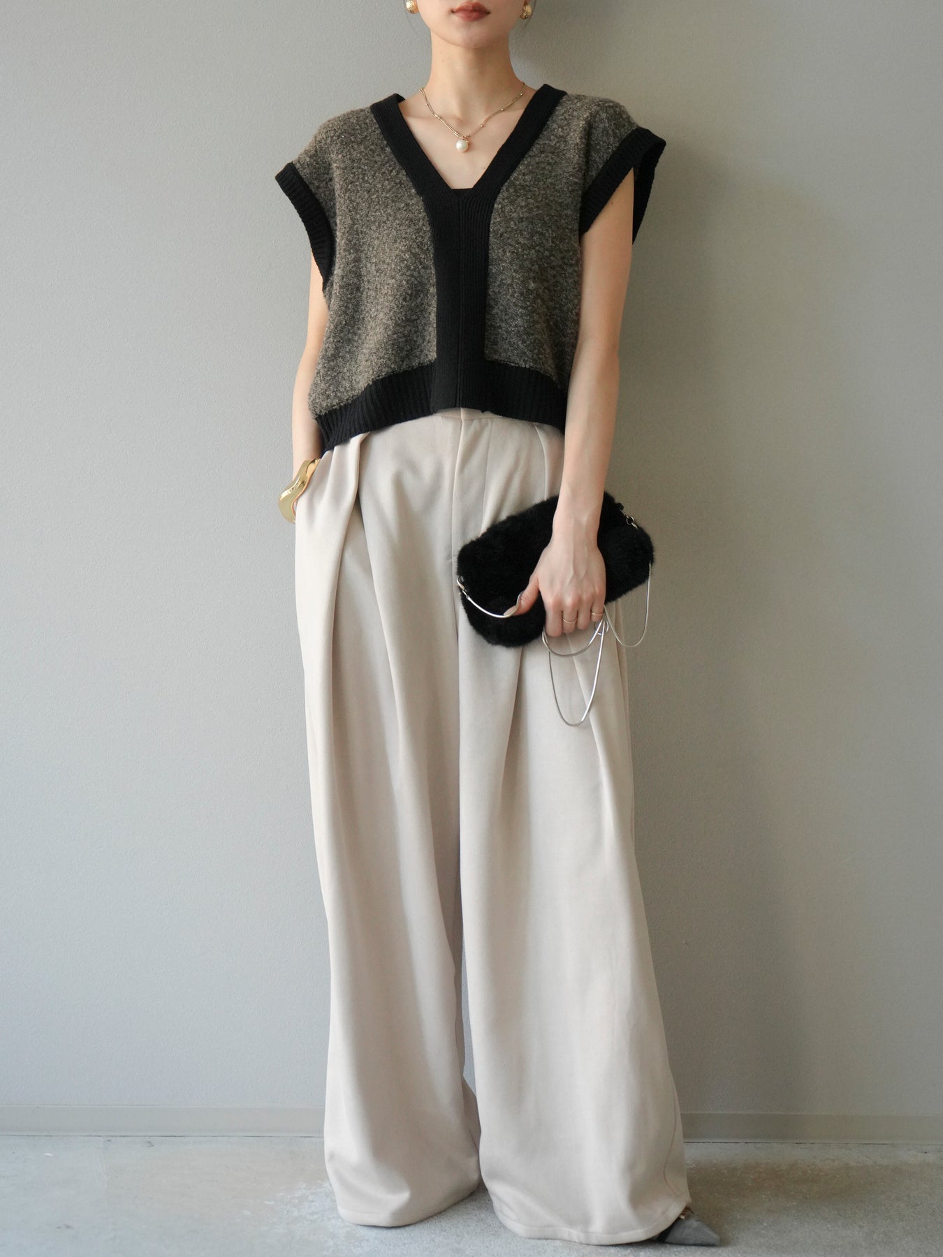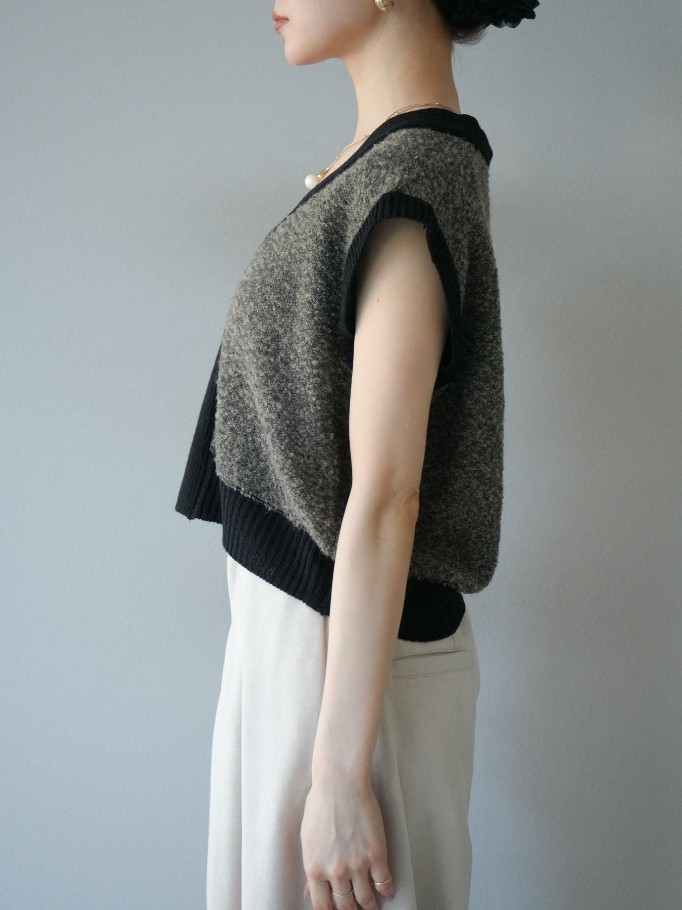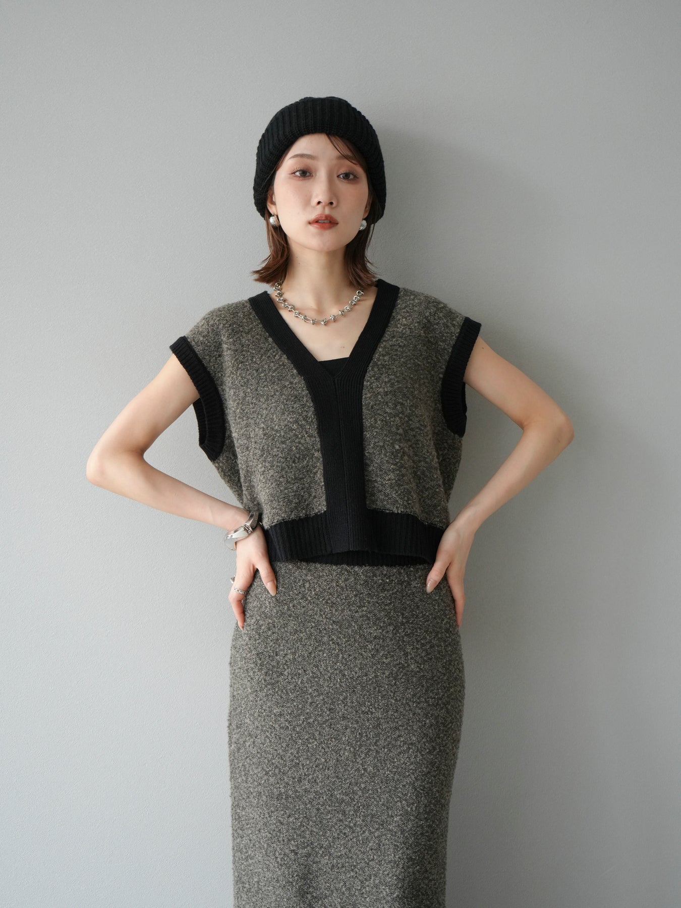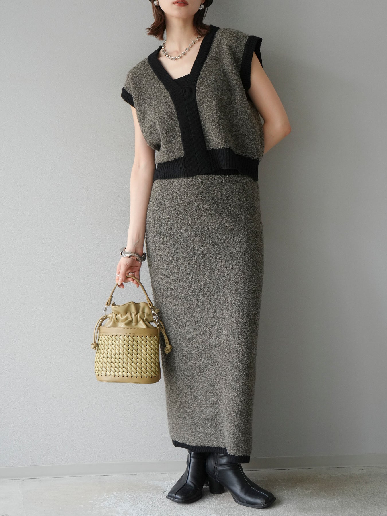 表情豊かなブークレ素材を使用したニットベスト。Vネックのデザインとバイカラーの切り替えがスタイリングにメリハリを与え、シンプルながらも存在感のある仕上がりです。程よい丈感でシャツやカットソーとのレイヤードがしやすく、シーズンを通して幅広く活躍。スカートにもパンツにも合わせやすく、コーディネートのアクセントとして取り入れるだけでこなれ感を演出してくれる万能アイテムです。 ※ボトムス、キャミソール(インナー)以外の商品は一律でインナーは付属していません。