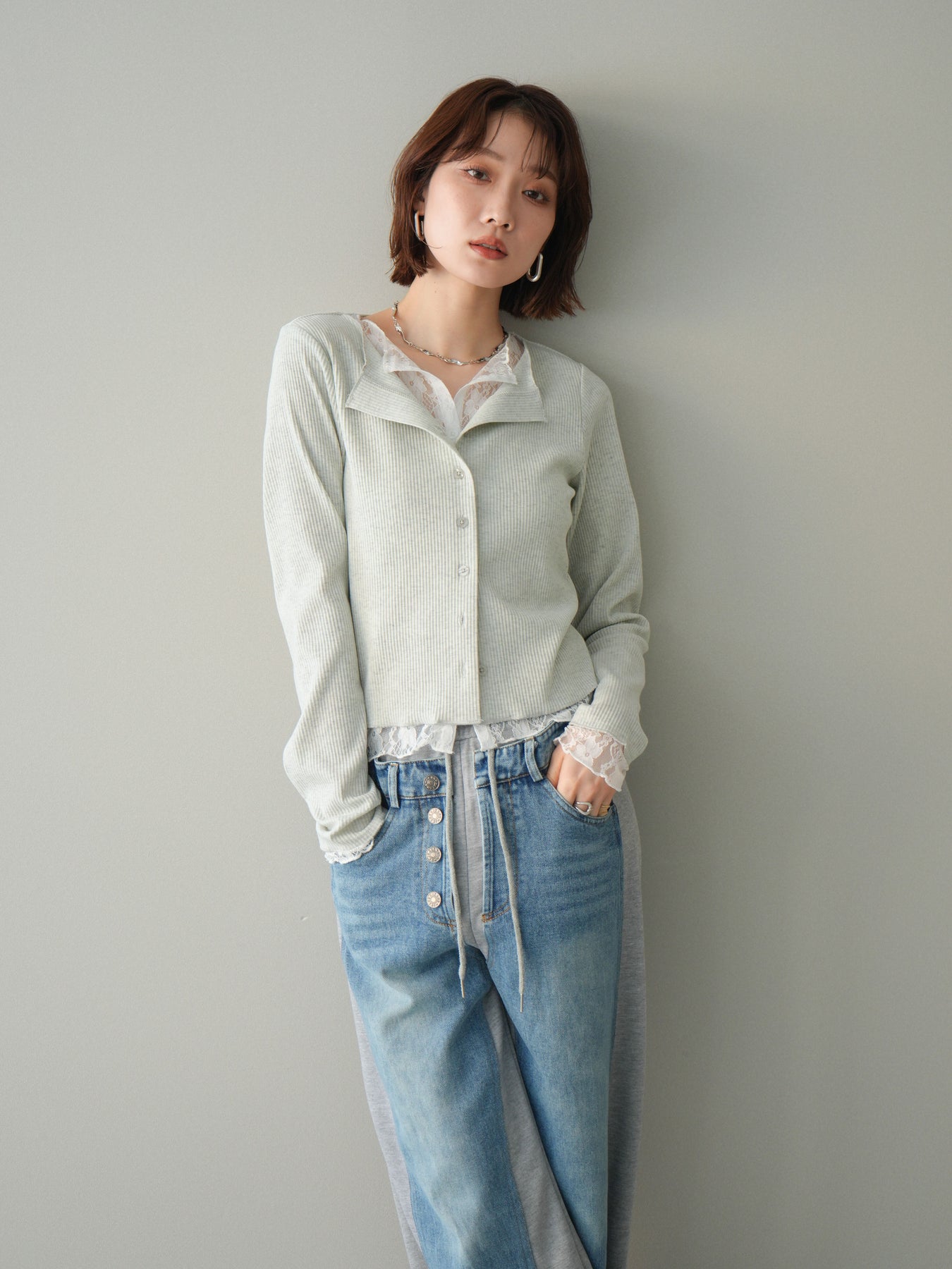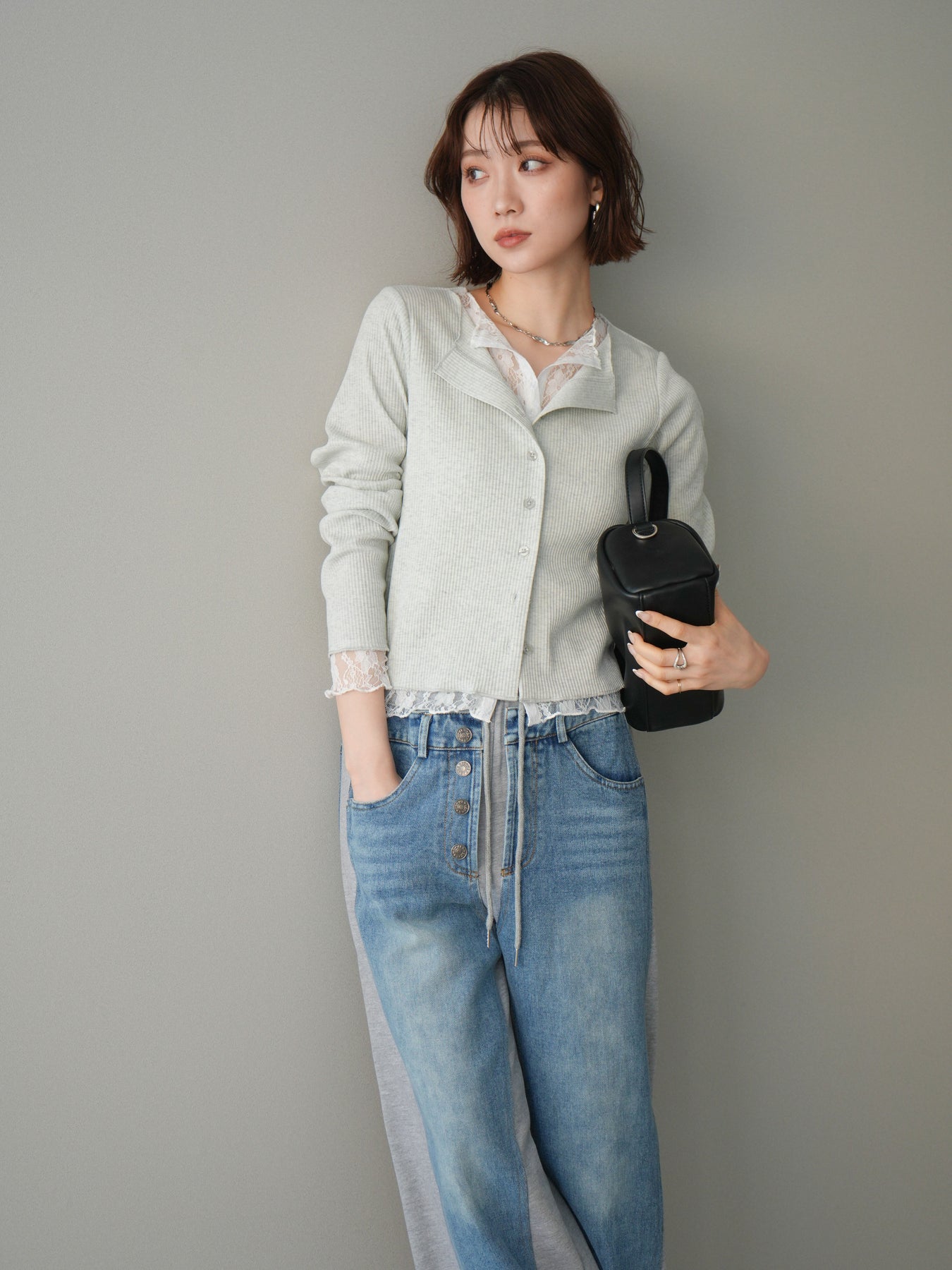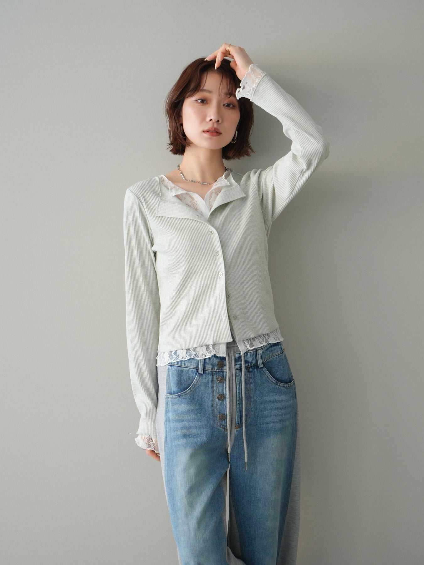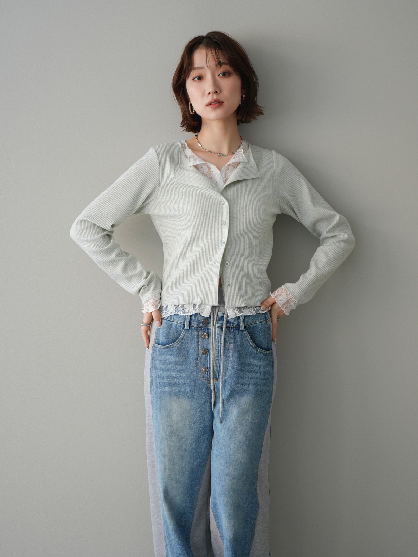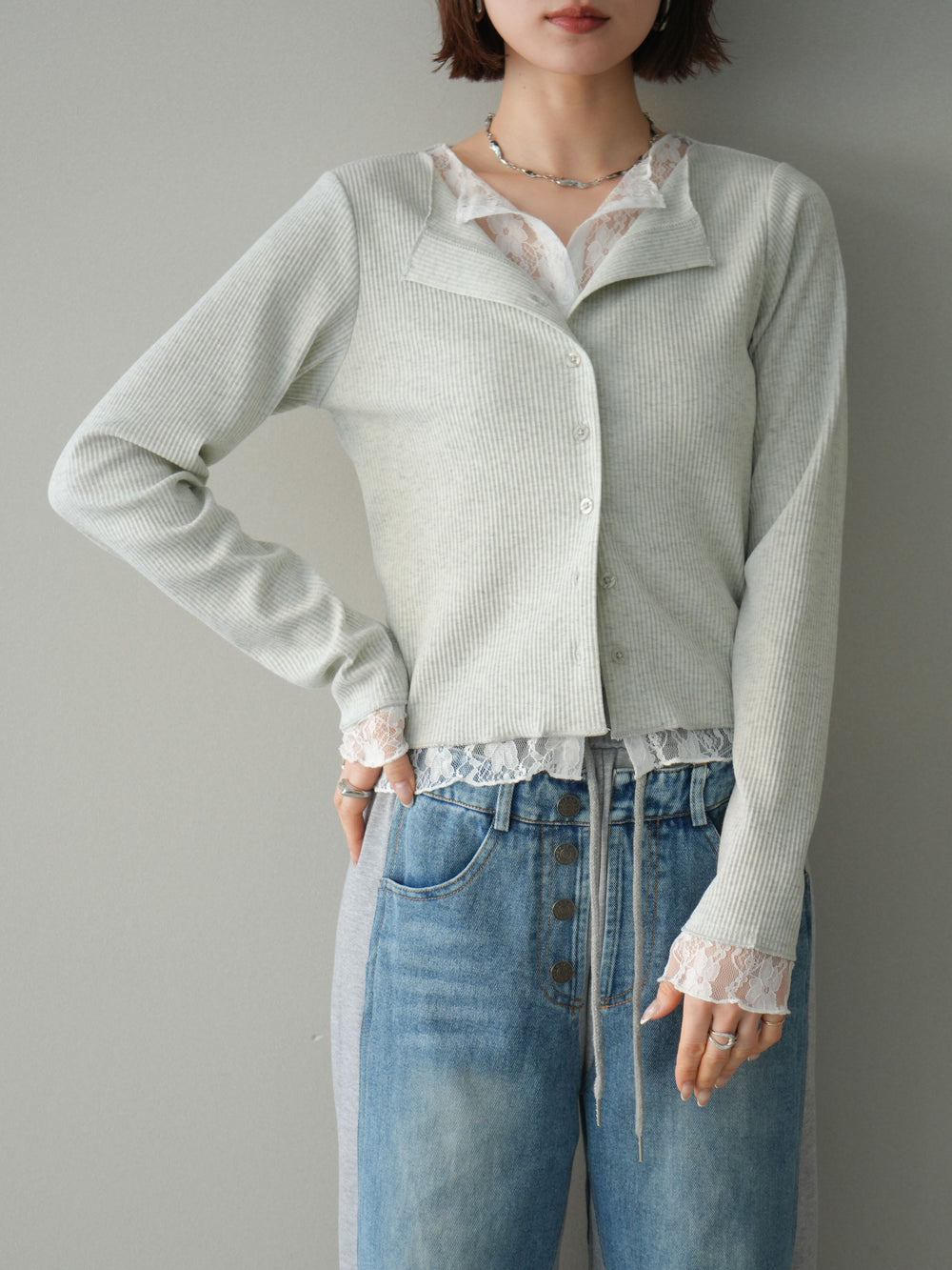 【預購】蕾絲拼接羅紋開襟衫 / 淺灰色