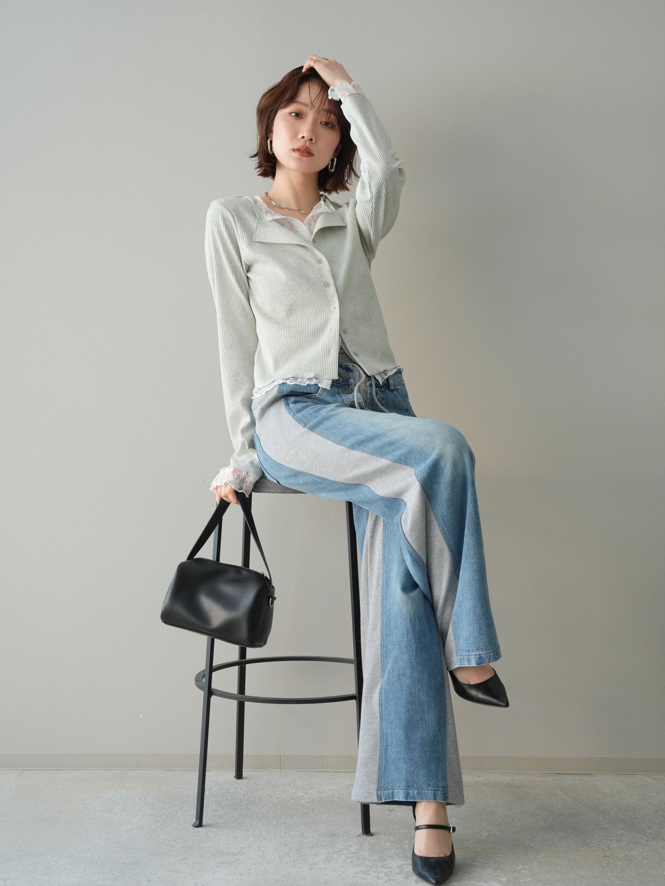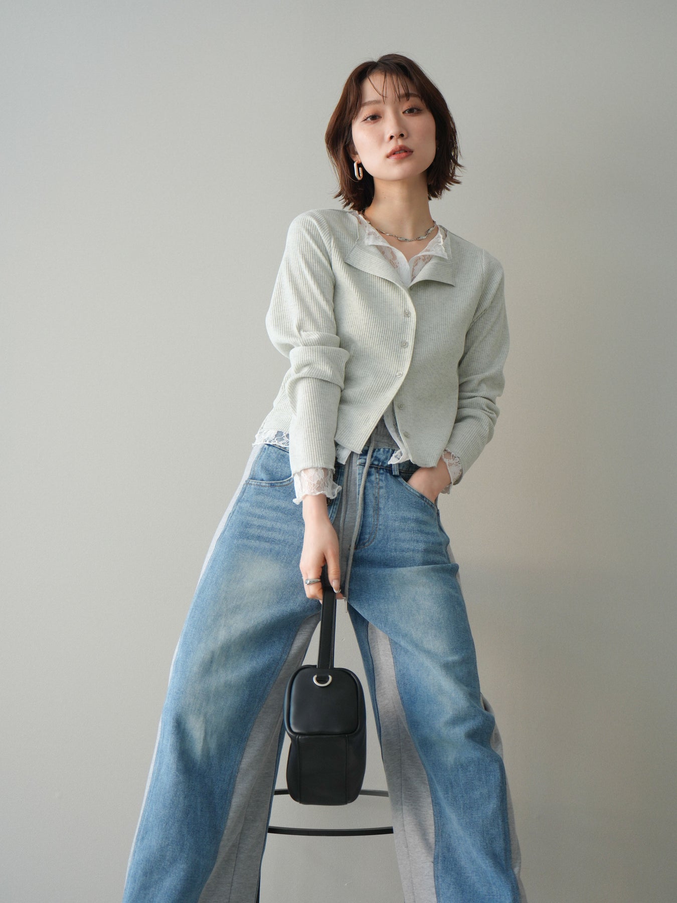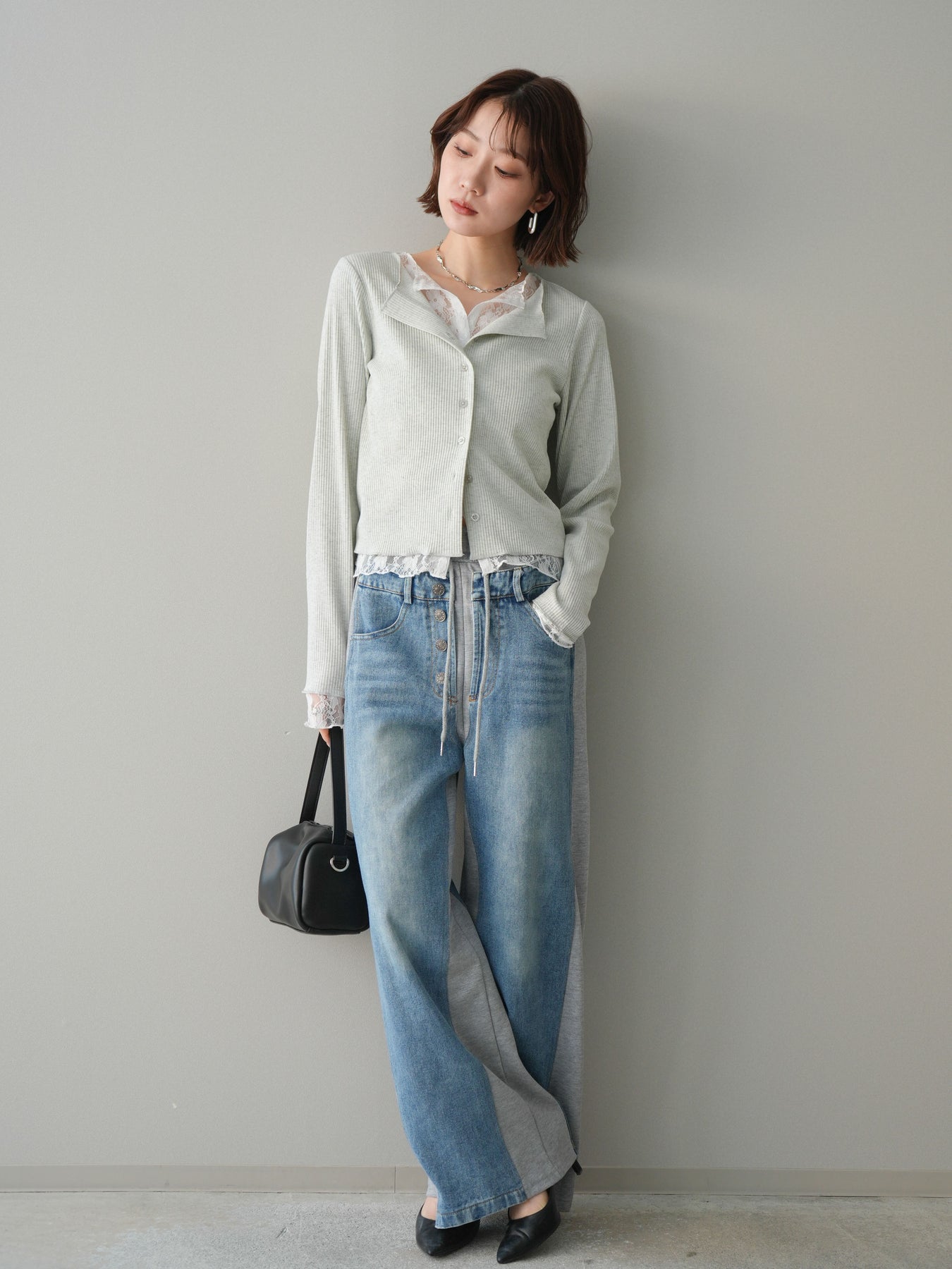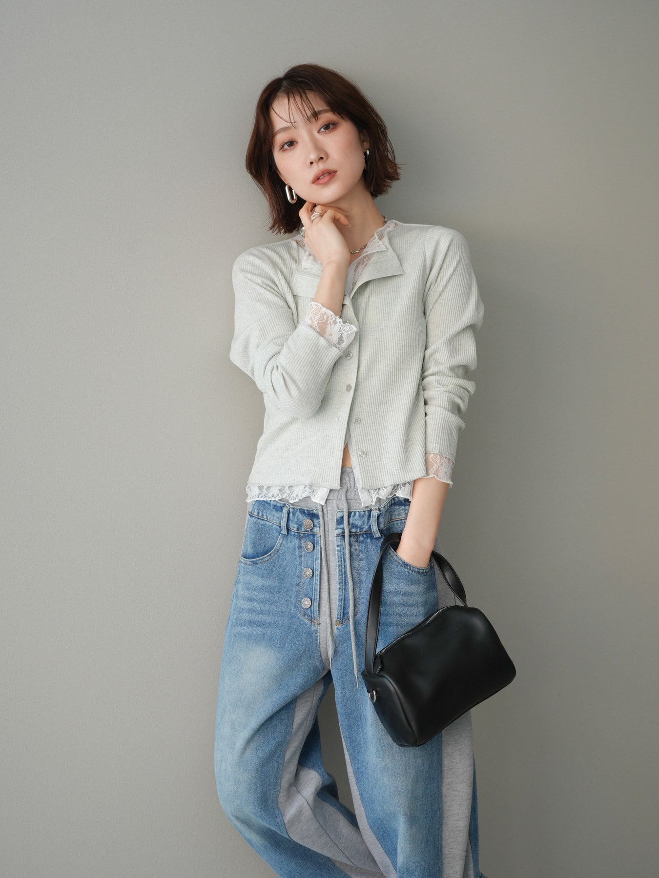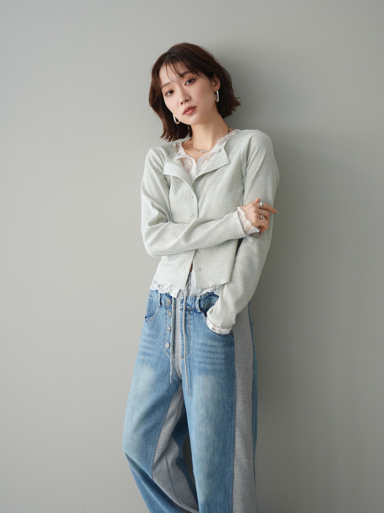 【預購】蕾絲拼接羅紋開襟衫 / 淺灰色