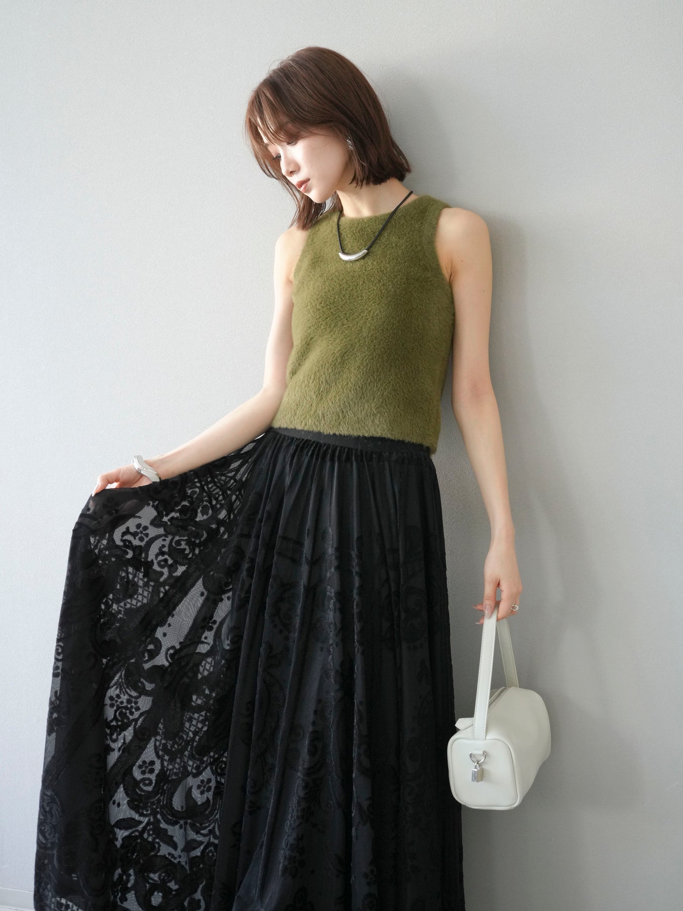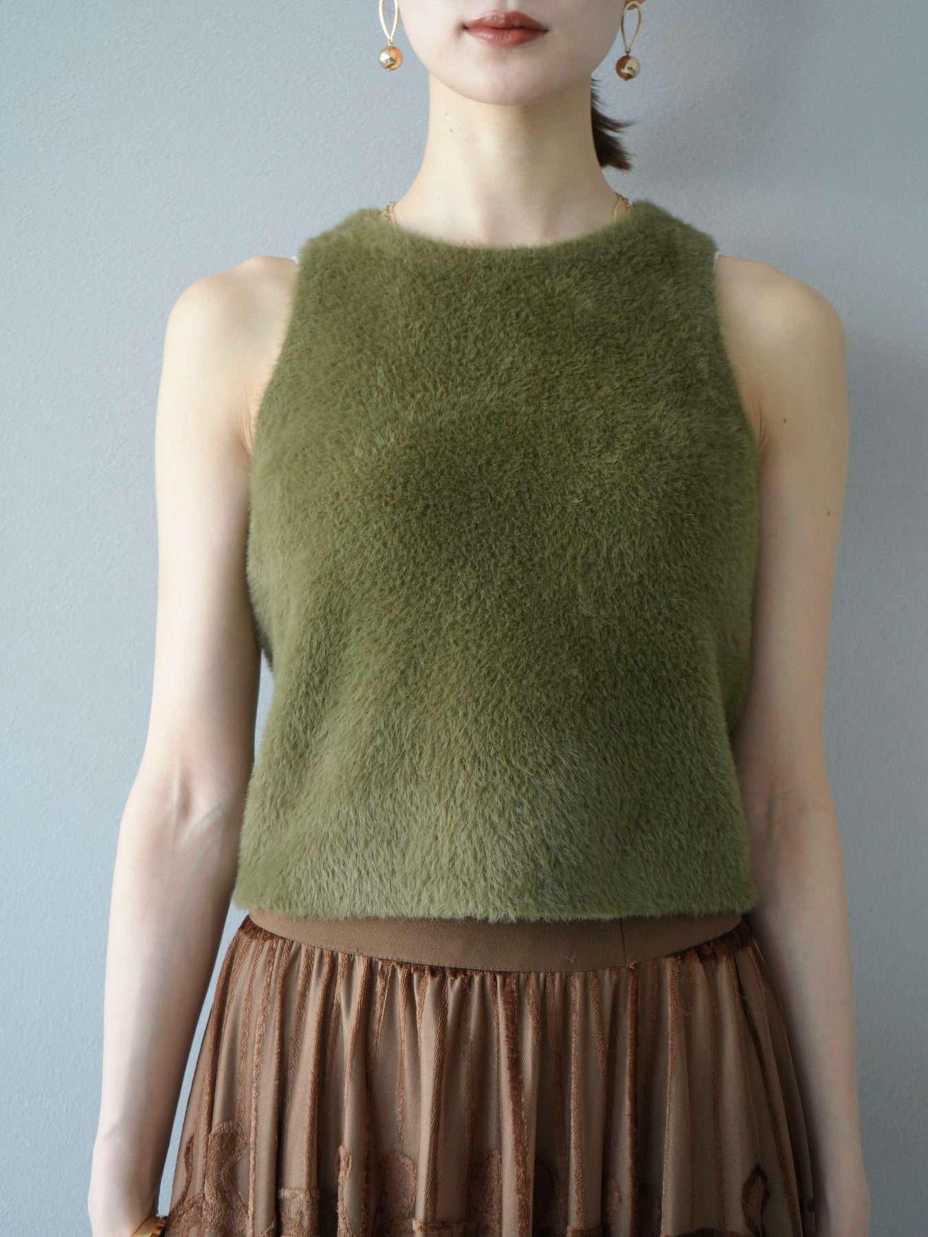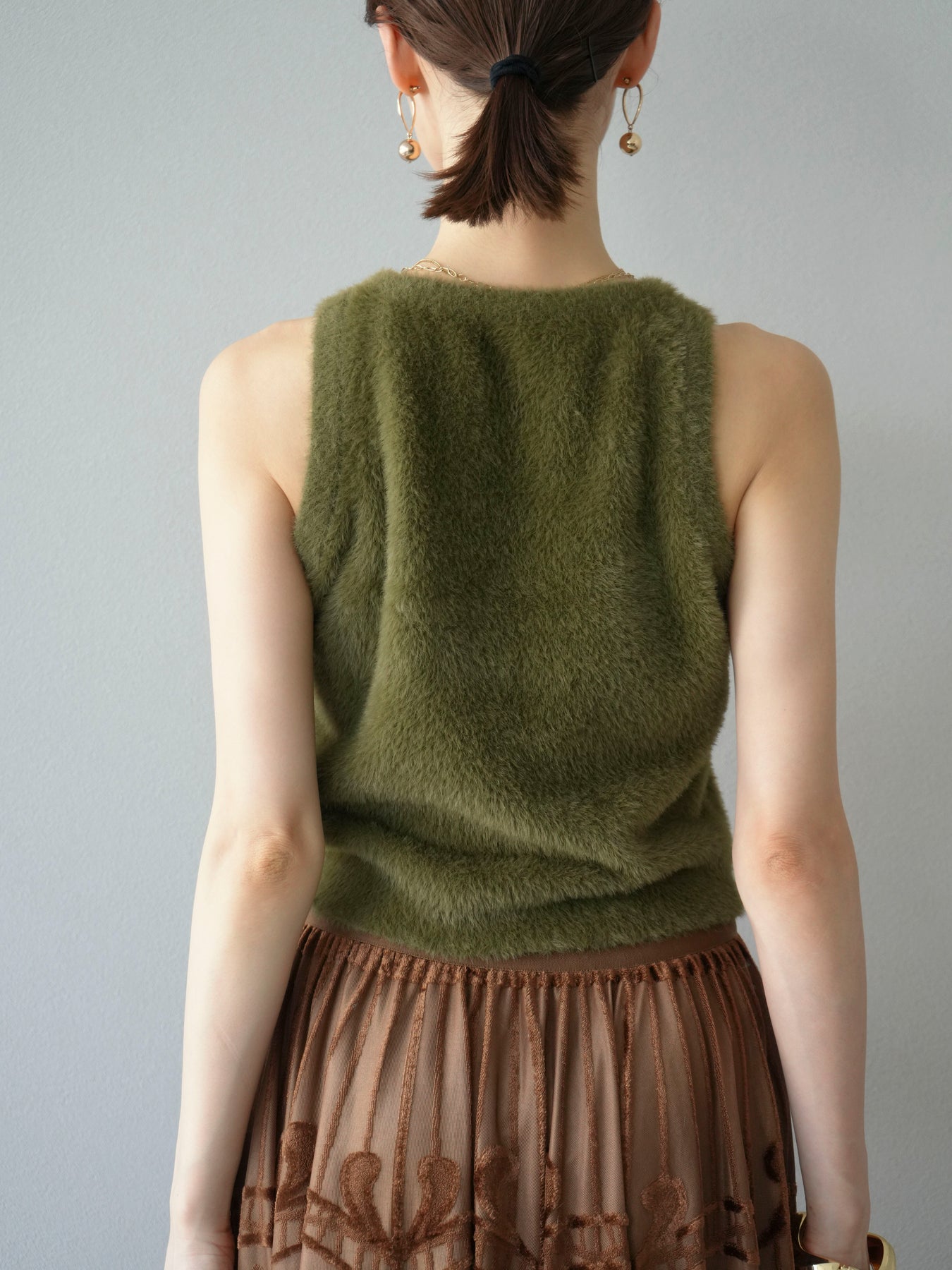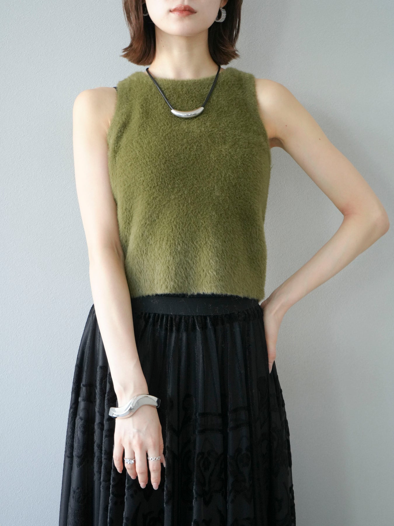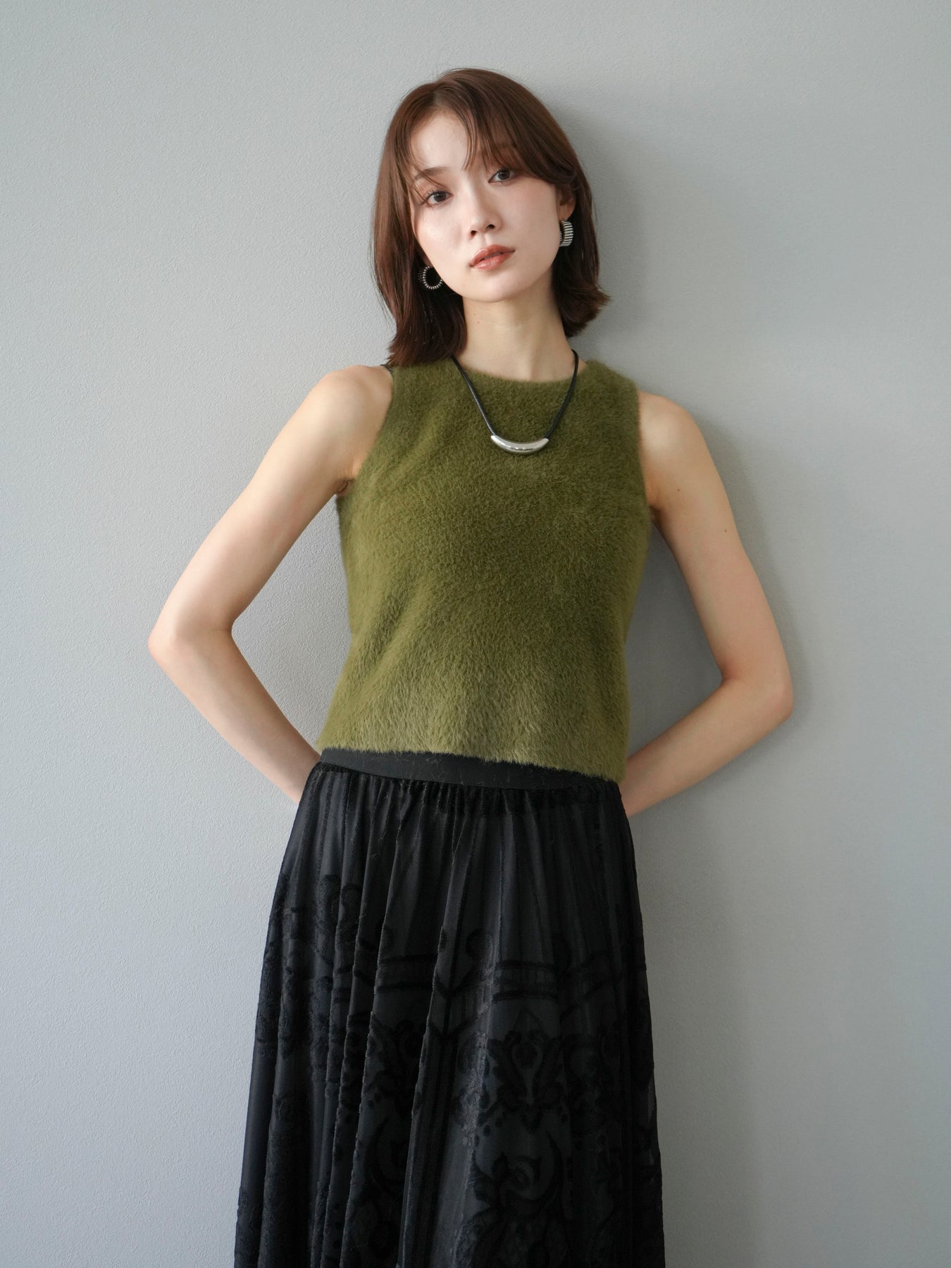 ふんわりとしたシャギー素材を使用したニットタンクトップ。毛足のある柔らかな風合いがシーズンムードを高め、1枚でもレイヤードでも着映えするアイテムです。程よくコンパクトなシルエットで、ボトムスとのバランスが取りやすく、スカートにもパンツにも好相性。シンプルながらも素材感で存在感を放ち、アクセサリーを合わせればより華やかな印象に。インナーにシャツやシアートップスを重ねることで、季節を問わずロングシーズン活躍します。 ※ボトムス、キャミソール(インナー)以外の商品は一律でインナーは付属していません。