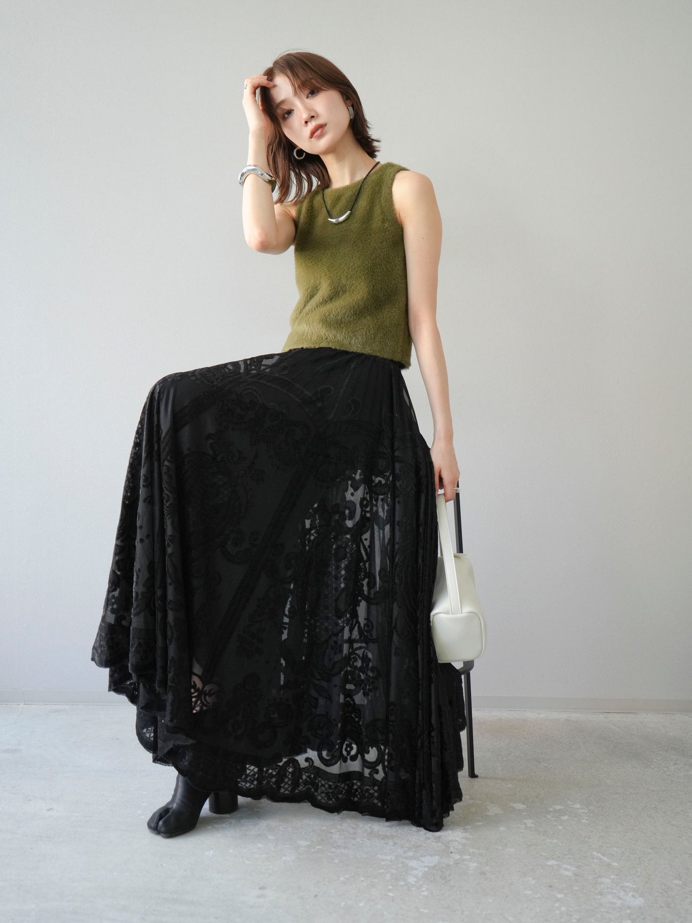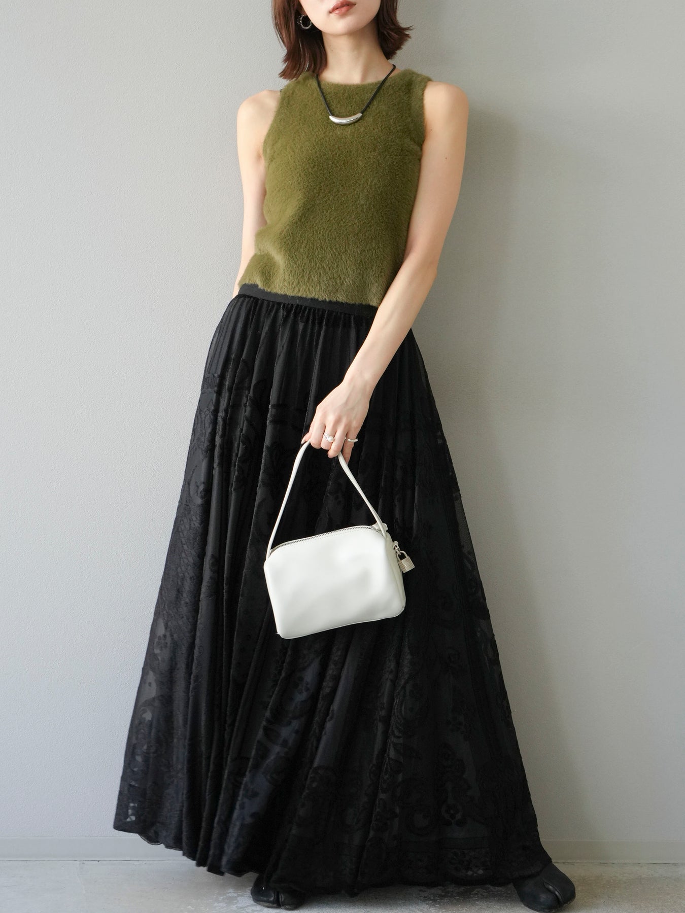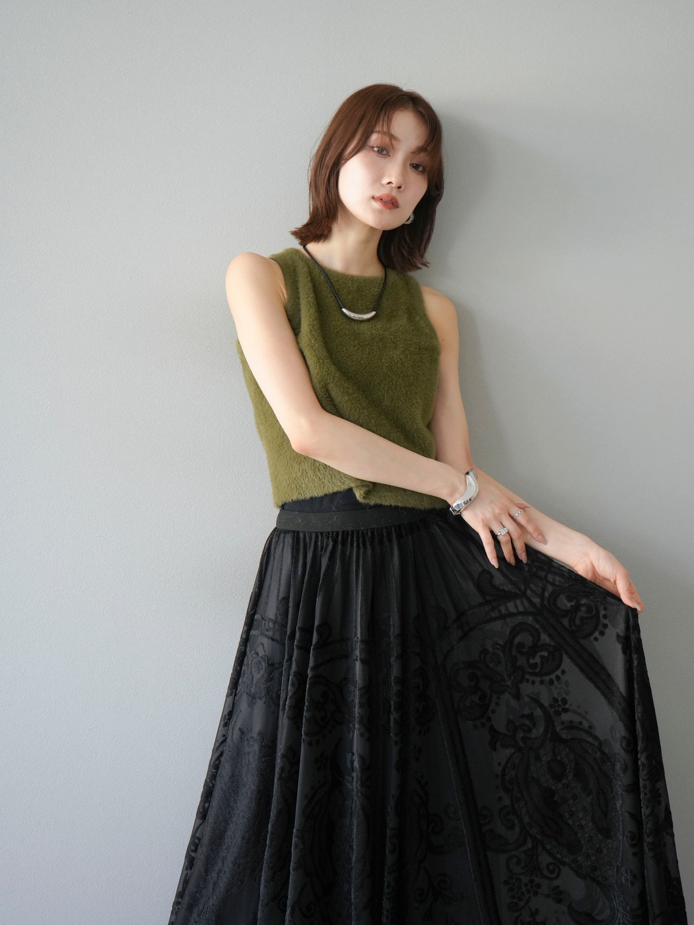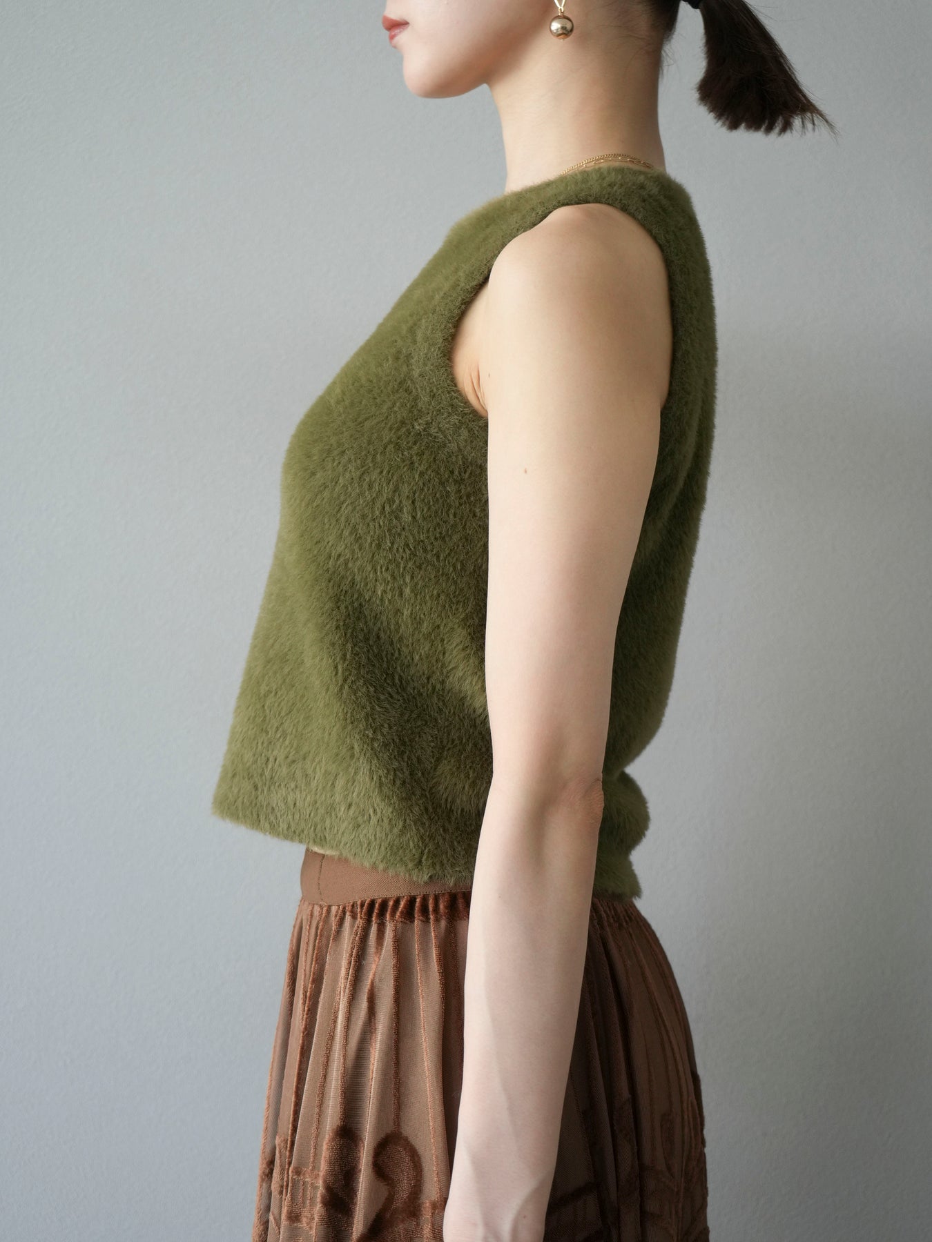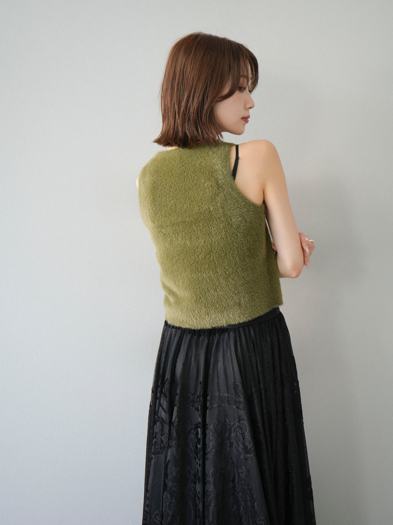 ふんわりとしたシャギー素材を使用したニットタンクトップ。毛足のある柔らかな風合いがシーズンムードを高め、1枚でもレイヤードでも着映えするアイテムです。程よくコンパクトなシルエットで、ボトムスとのバランスが取りやすく、スカートにもパンツにも好相性。シンプルながらも素材感で存在感を放ち、アクセサリーを合わせればより華やかな印象に。インナーにシャツやシアートップスを重ねることで、季節を問わずロングシーズン活躍します。 ※ボトムス、キャミソール(インナー)以外の商品は一律でインナーは付属していません。