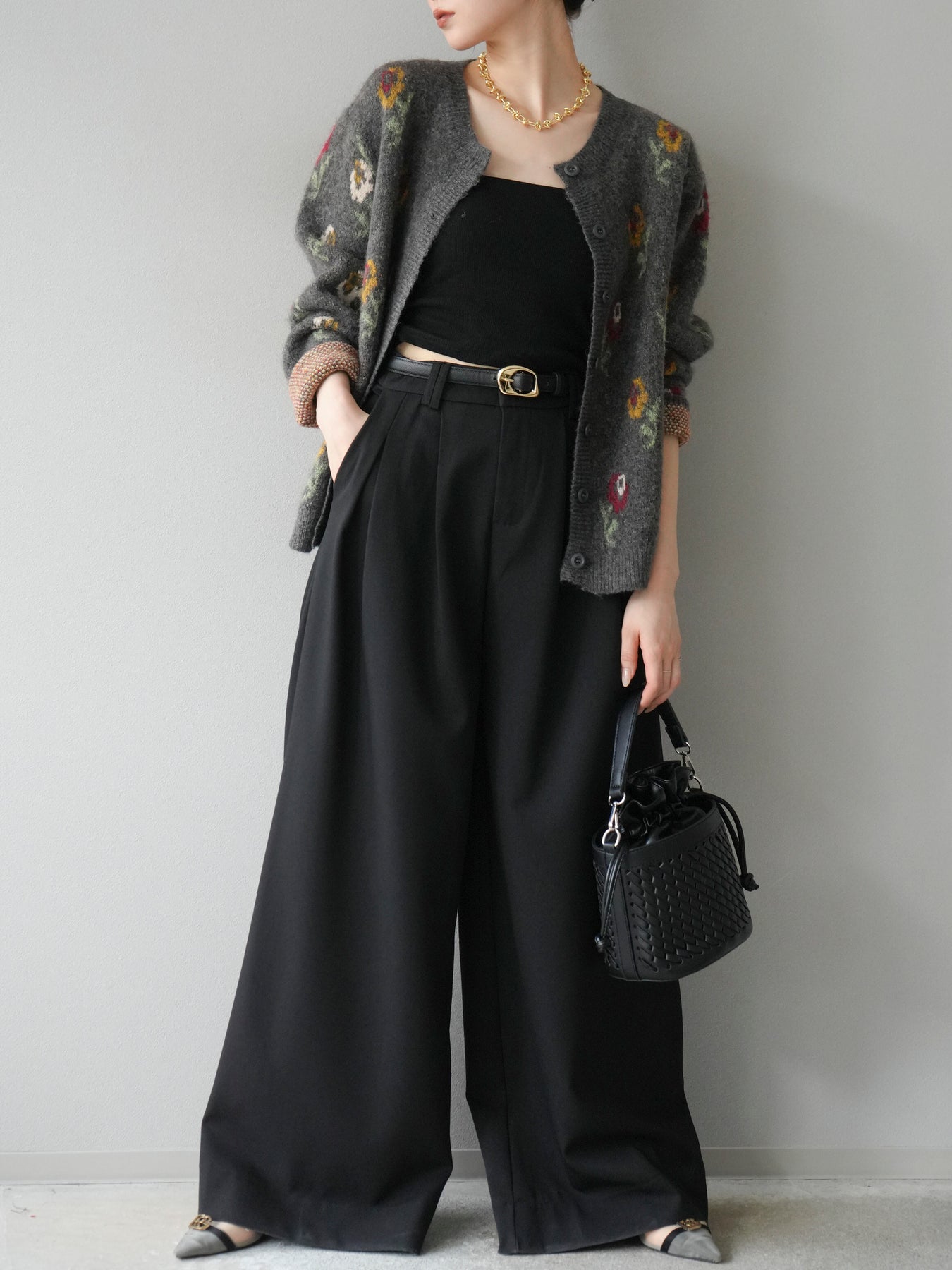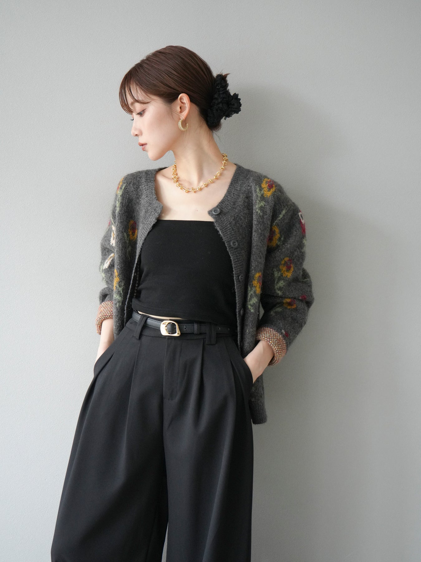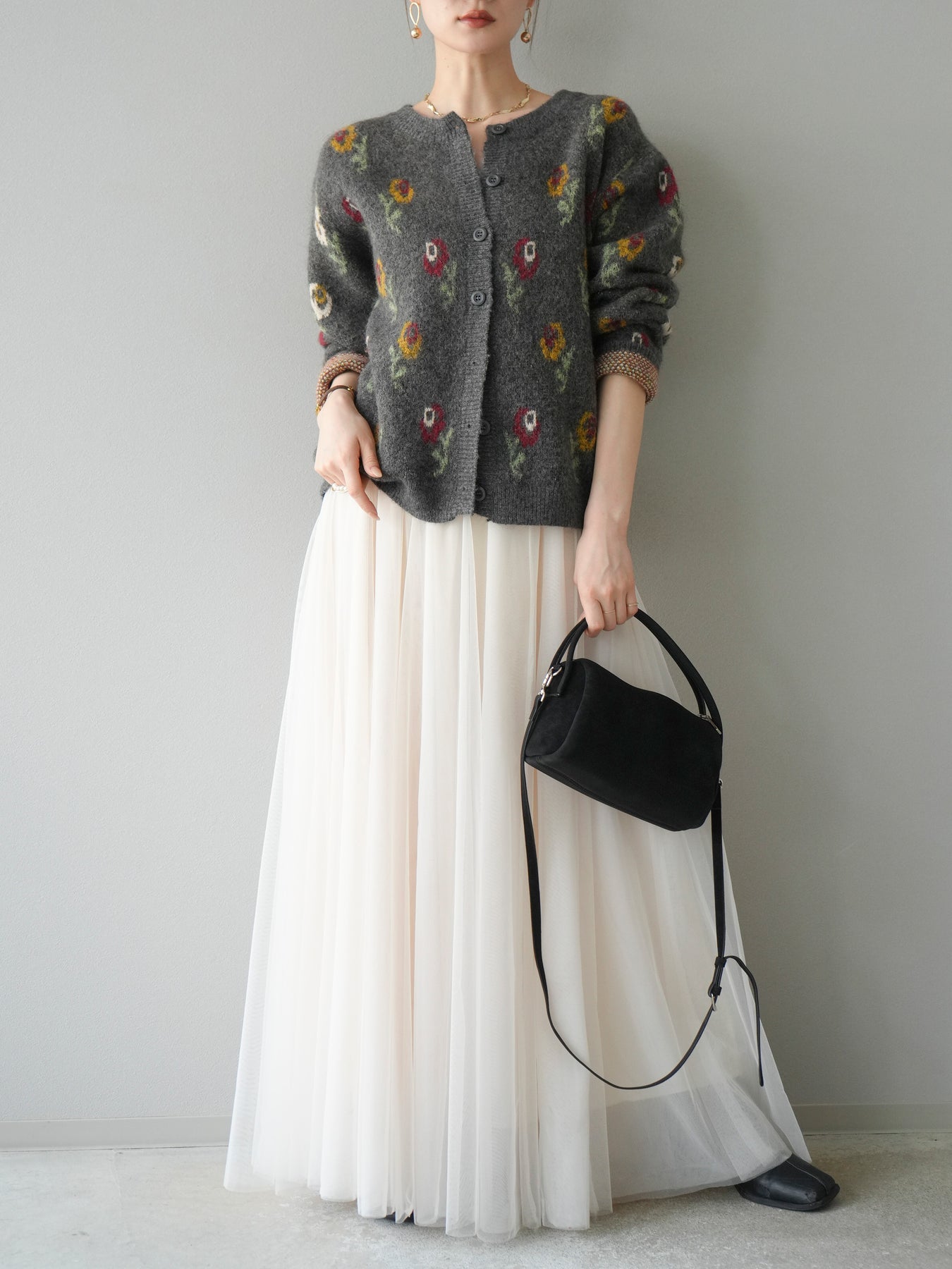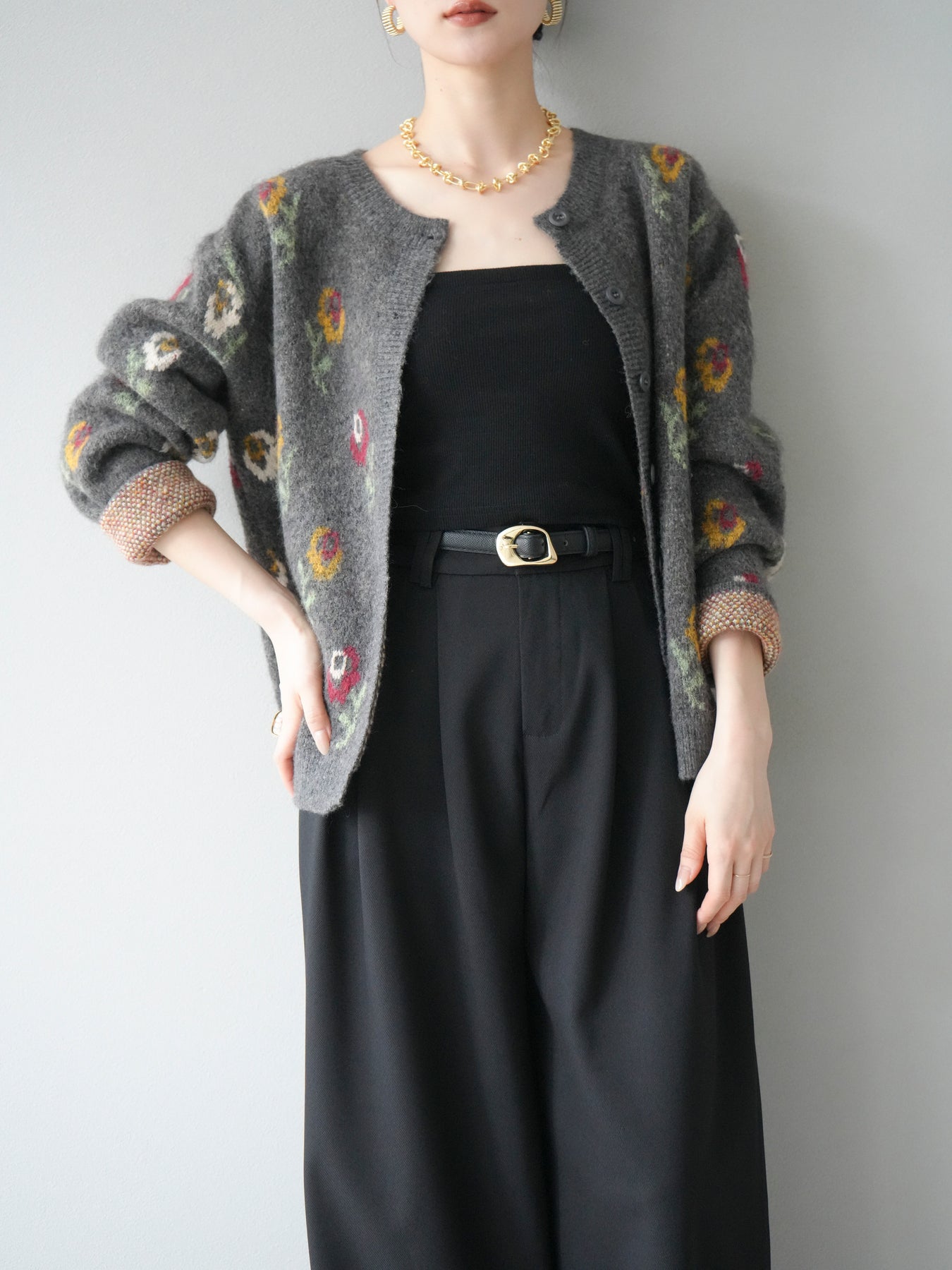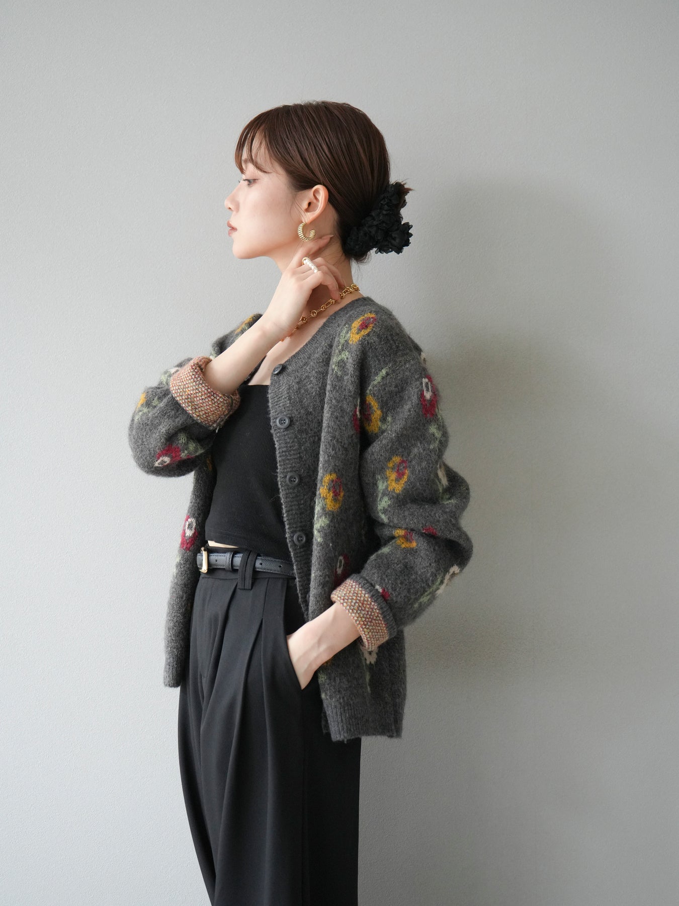 [予約]ウールタッチフラワーニットカーディガン/チャコール