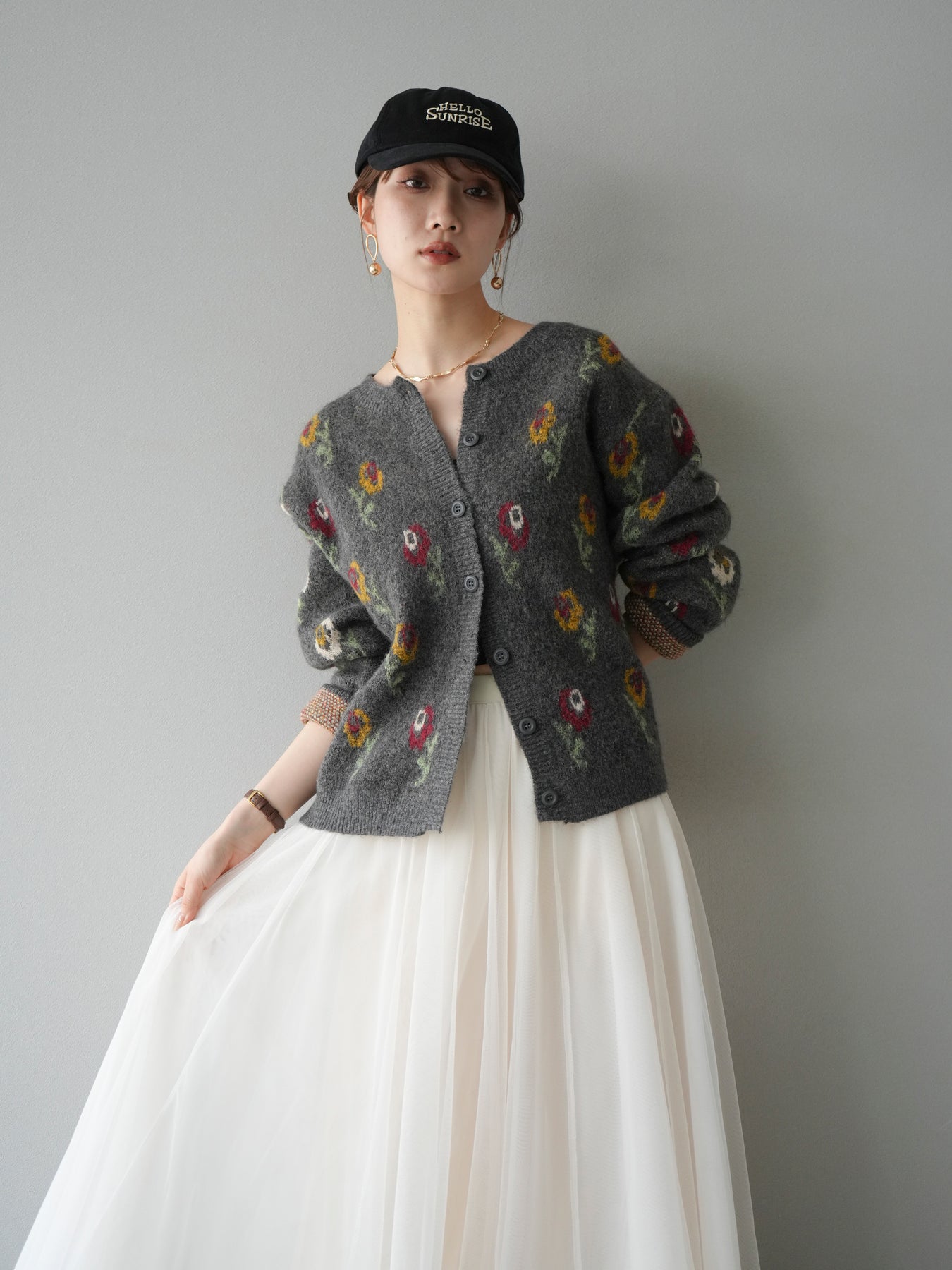 ウールライクな柔らかな風合いにフラワーモチーフをあしらった、シーズンムードたっぷりのニットカーディガン。程よくゆとりのあるシルエットでリラックス感がありながら、愛らしい花柄がスタイリングに華やかさをプラスします。羽織りとしてはもちろん、ボタンを留めてトップス風に着てもサマになる万能アイテム。デイリーからお出かけまで幅広く活躍する一着です。 ※ボトムス、キャミソール(インナー)以外の商品は一律でインナーは付属していません。