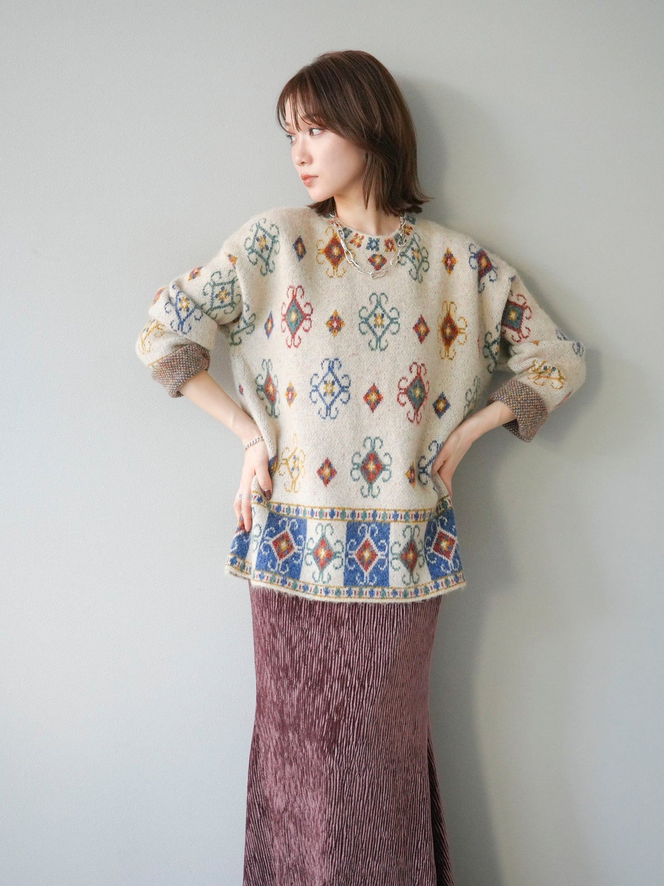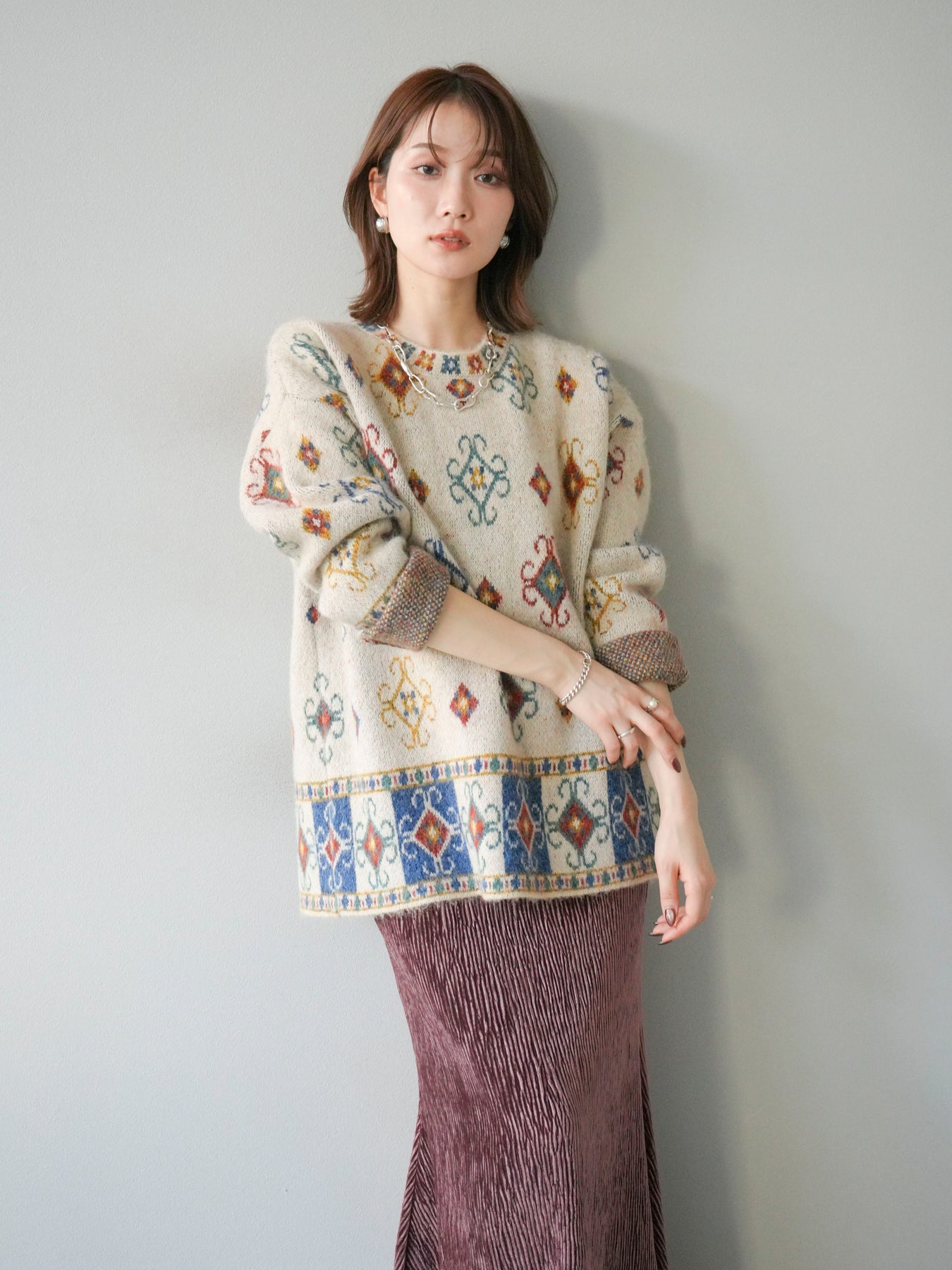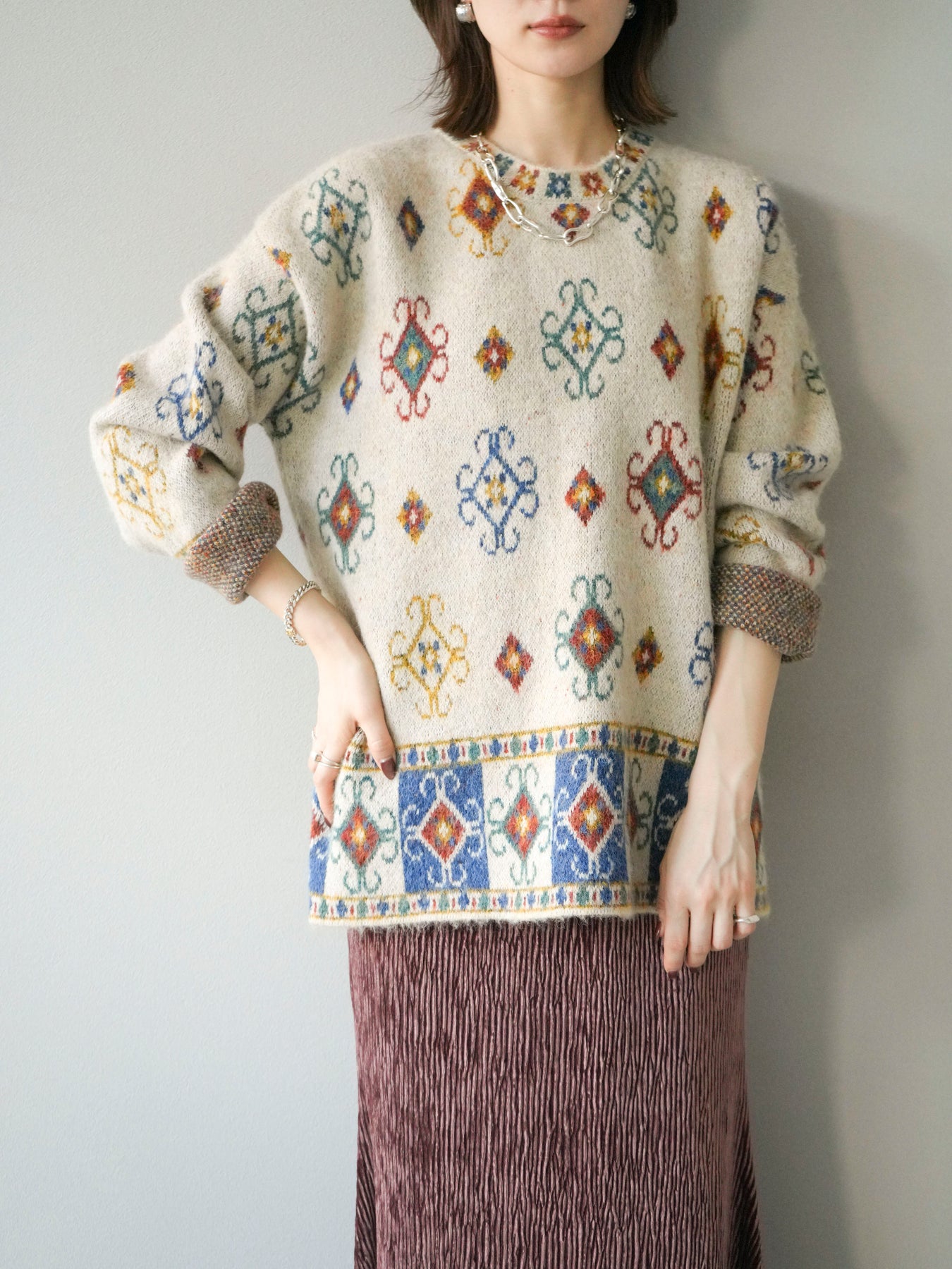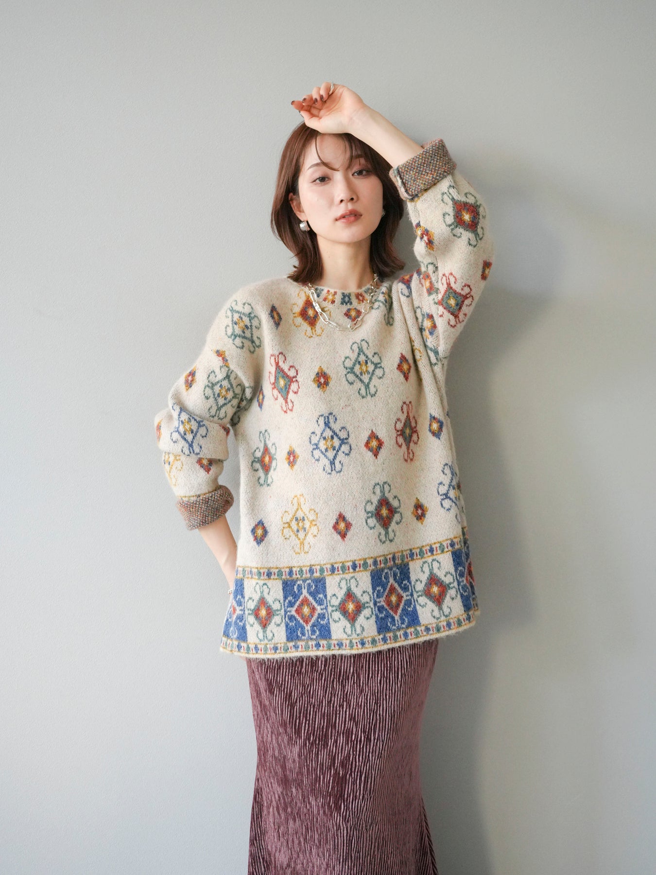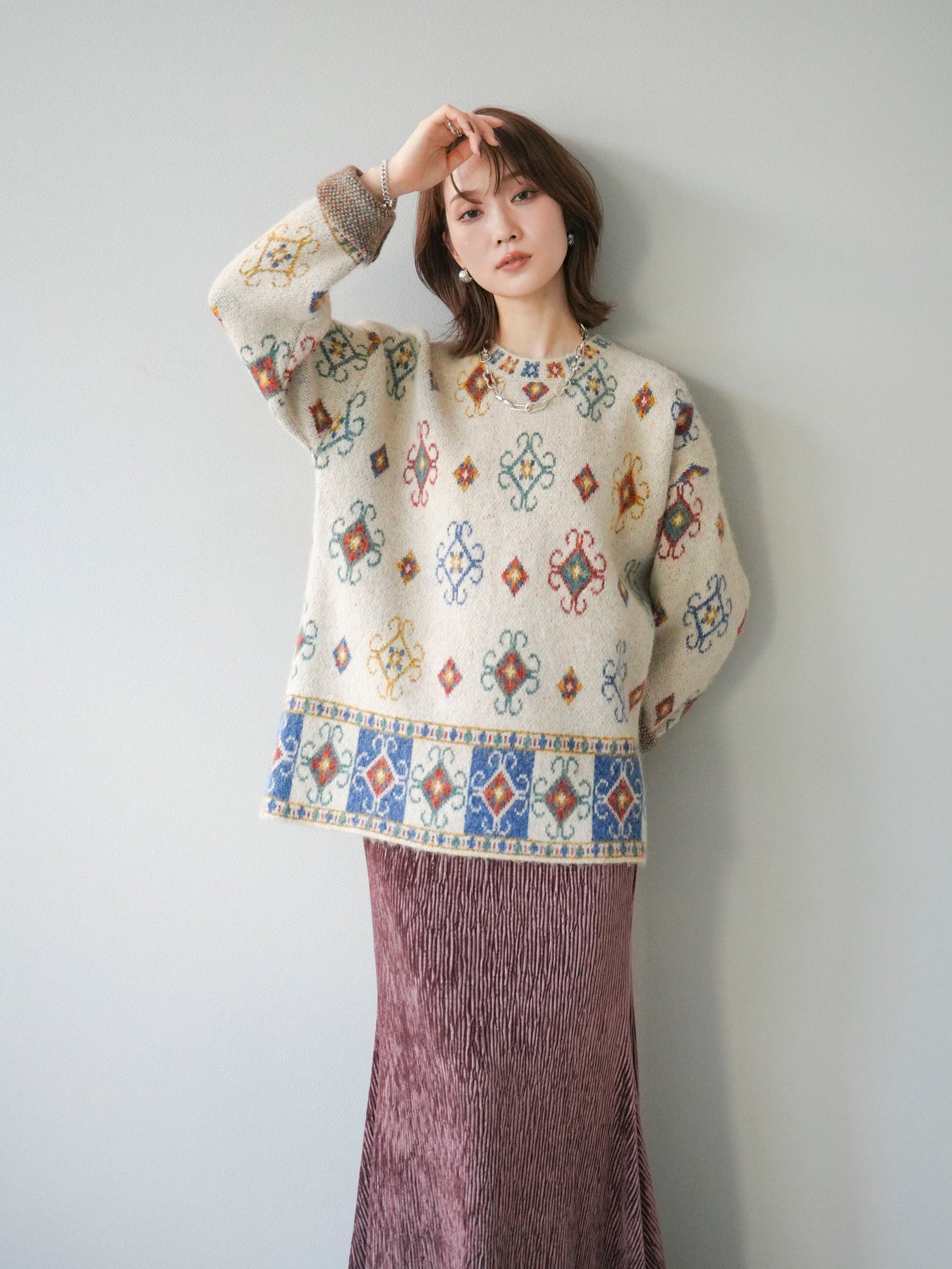 ノスタルジックな雰囲気漂うヴィンテージライクな柄が印象的なオーバーニットプルオーバー。カラフルな配色ながらも落ち着いたトーンで、スタイリングに上品なアクセントを添えます。ゆったりとしたシルエットでリラクシーな着心地を叶えつつ、程よい厚みがシーズンらしい温もりを感じさせる一枚。デニムやスカートなど、どんなボトムスとも相性が良く、1枚で存在感のあるスタイルを楽しめます。 ※ボトムス、キャミソール(インナー)以外の商品は一律でインナーは付属していません。