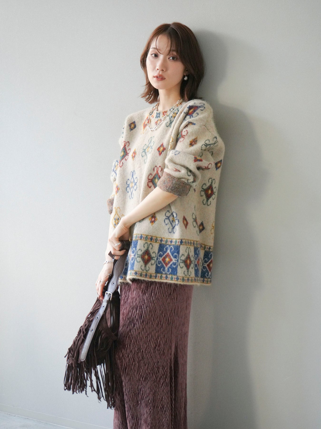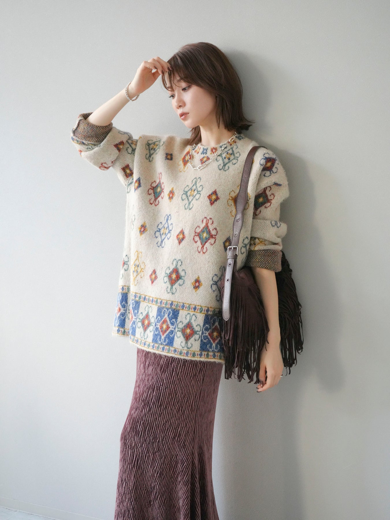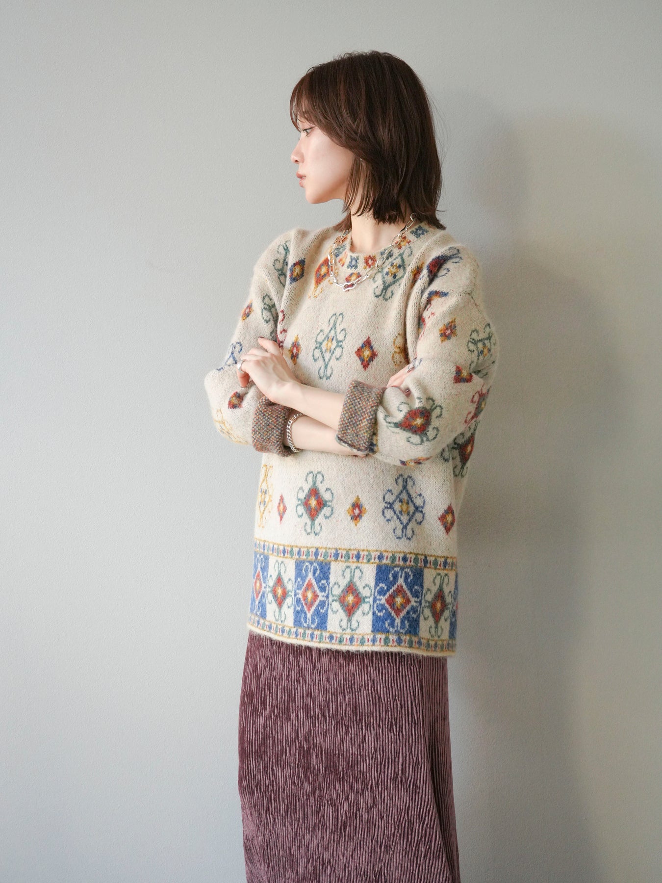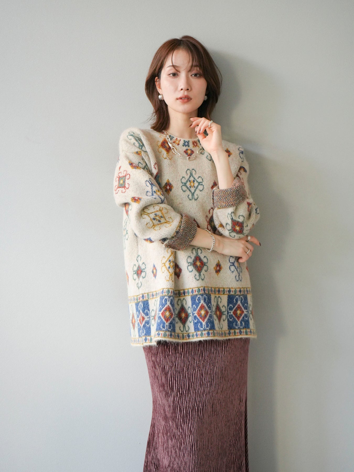 ノスタルジックな雰囲気漂うヴィンテージライクな柄が印象的なオーバーニットプルオーバー。カラフルな配色ながらも落ち着いたトーンで、スタイリングに上品なアクセントを添えます。ゆったりとしたシルエットでリラクシーな着心地を叶えつつ、程よい厚みがシーズンらしい温もりを感じさせる一枚。デニムやスカートなど、どんなボトムスとも相性が良く、1枚で存在感のあるスタイルを楽しめます。 ※ボトムス、キャミソール(インナー)以外の商品は一律でインナーは付属していません。