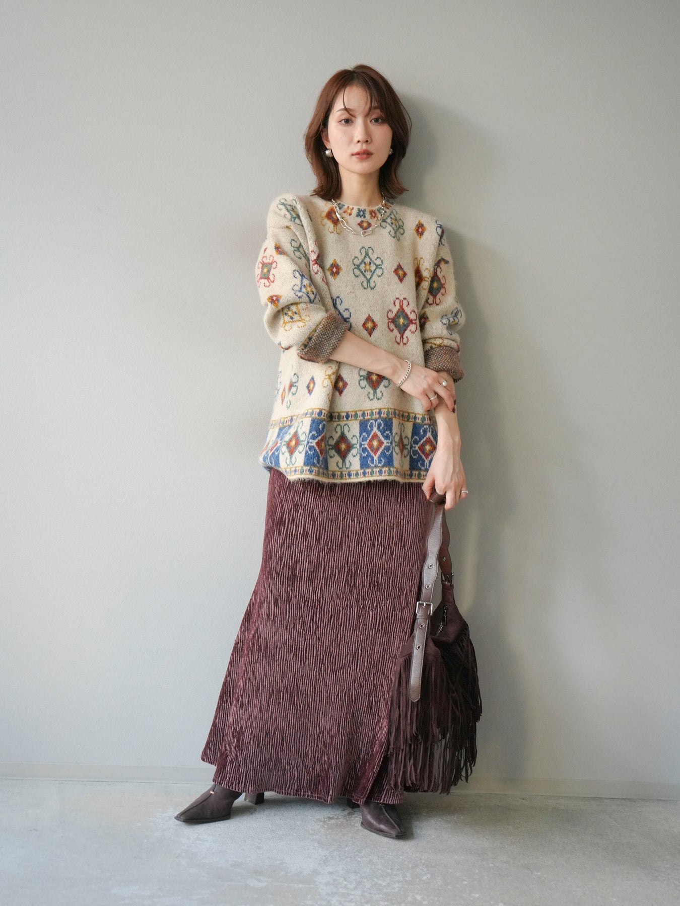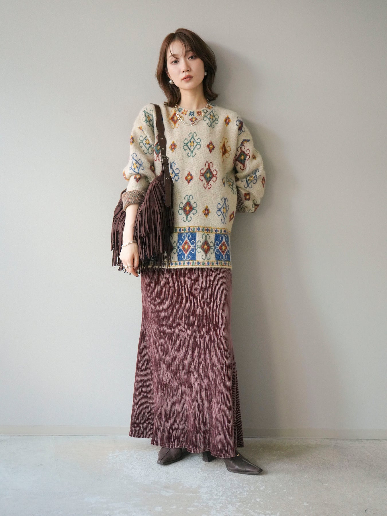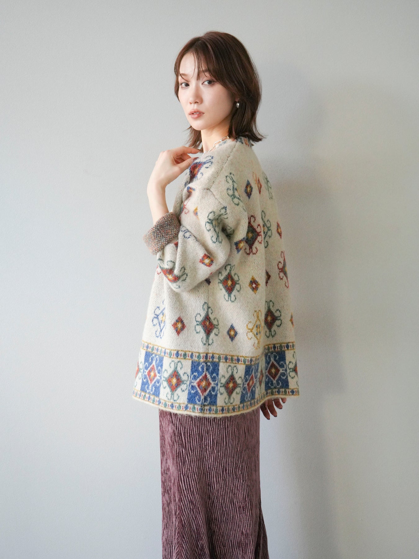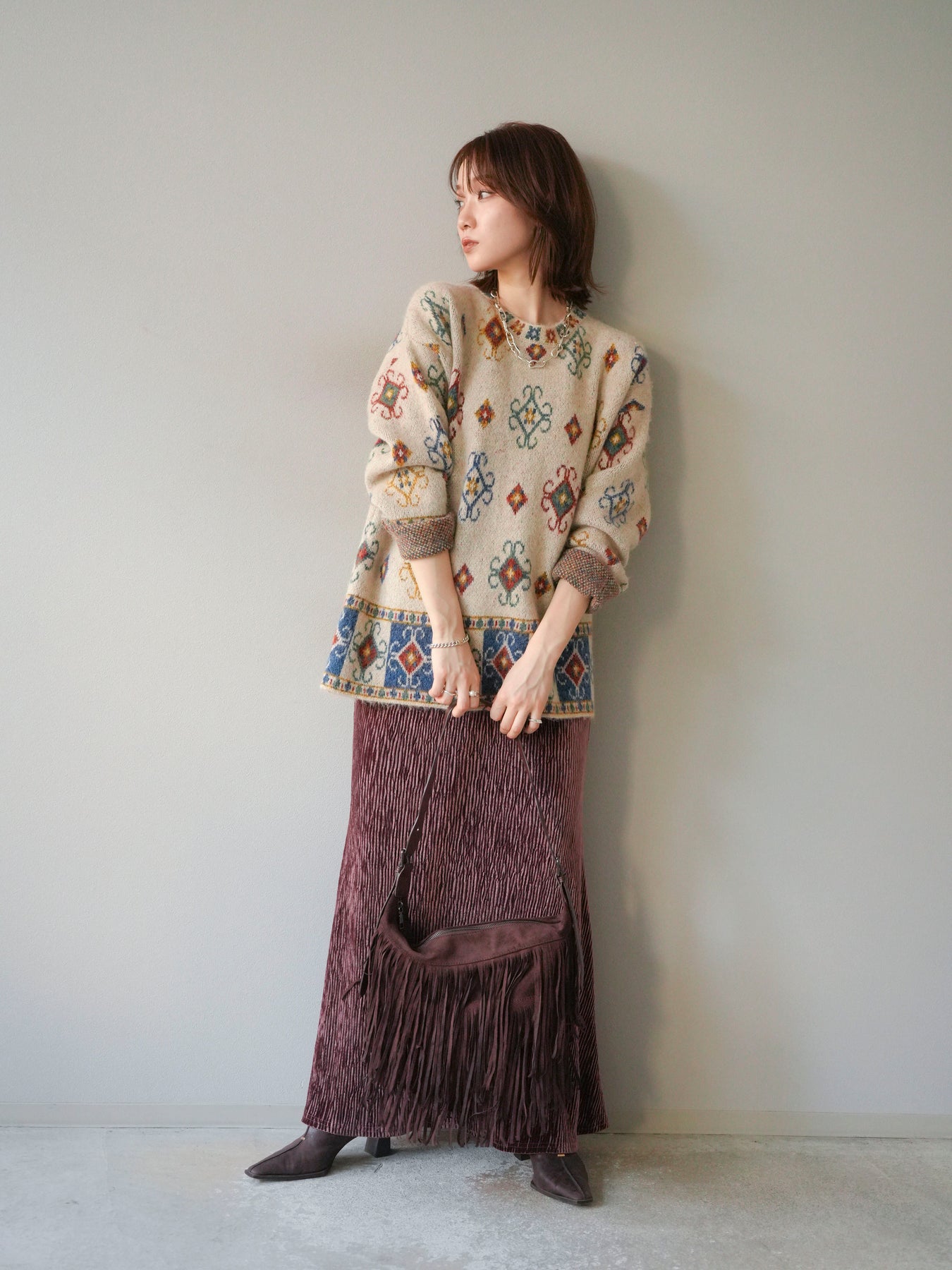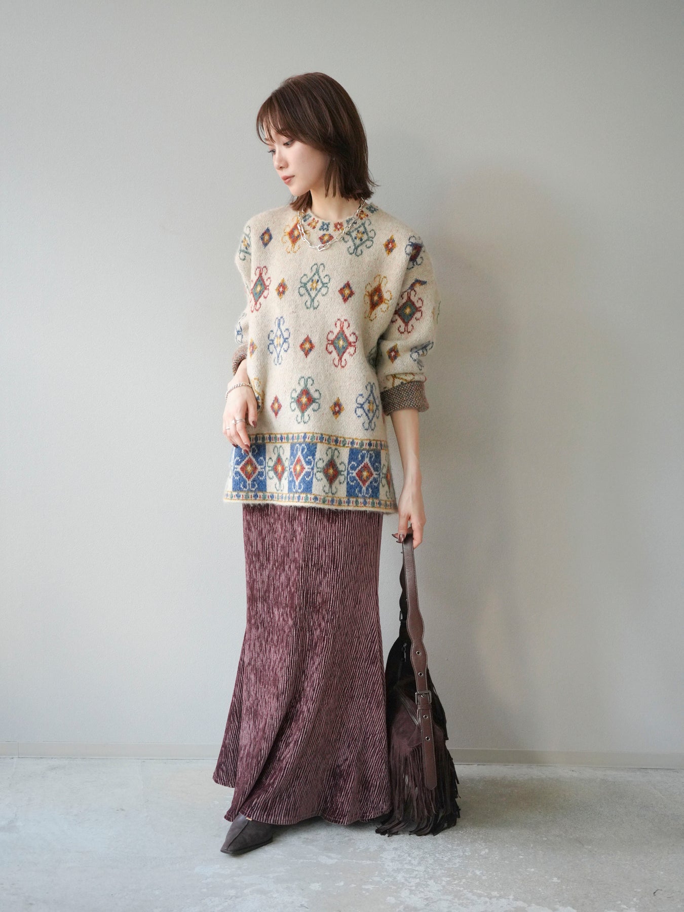 ノスタルジックな雰囲気漂うヴィンテージライクな柄が印象的なオーバーニットプルオーバー。カラフルな配色ながらも落ち着いたトーンで、スタイリングに上品なアクセントを添えます。ゆったりとしたシルエットでリラクシーな着心地を叶えつつ、程よい厚みがシーズンらしい温もりを感じさせる一枚。デニムやスカートなど、どんなボトムスとも相性が良く、1枚で存在感のあるスタイルを楽しめます。 ※ボトムス、キャミソール(インナー)以外の商品は一律でインナーは付属していません。