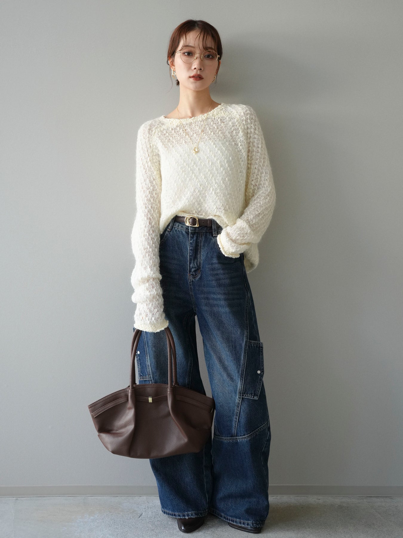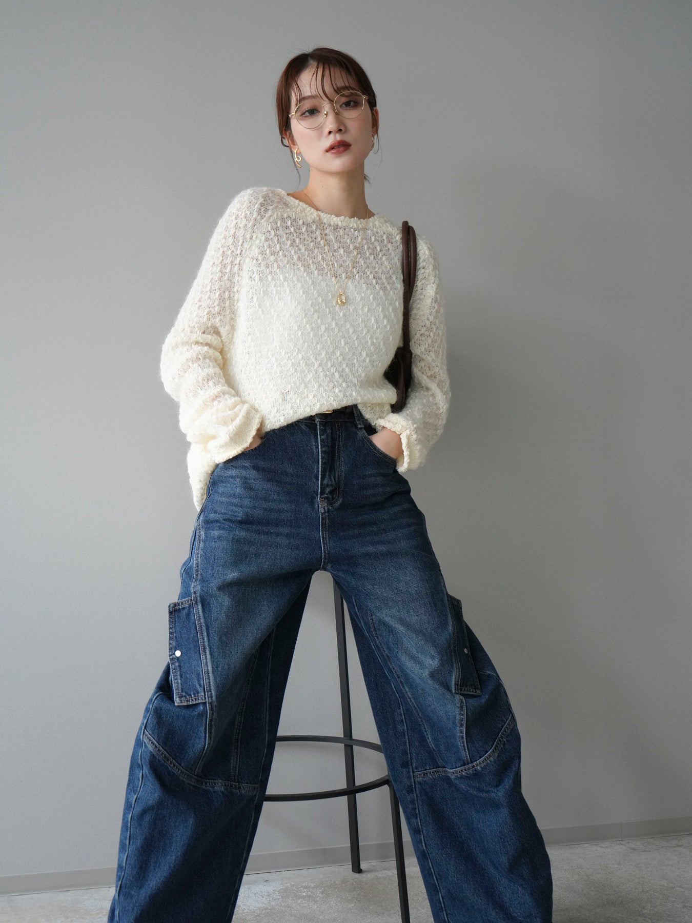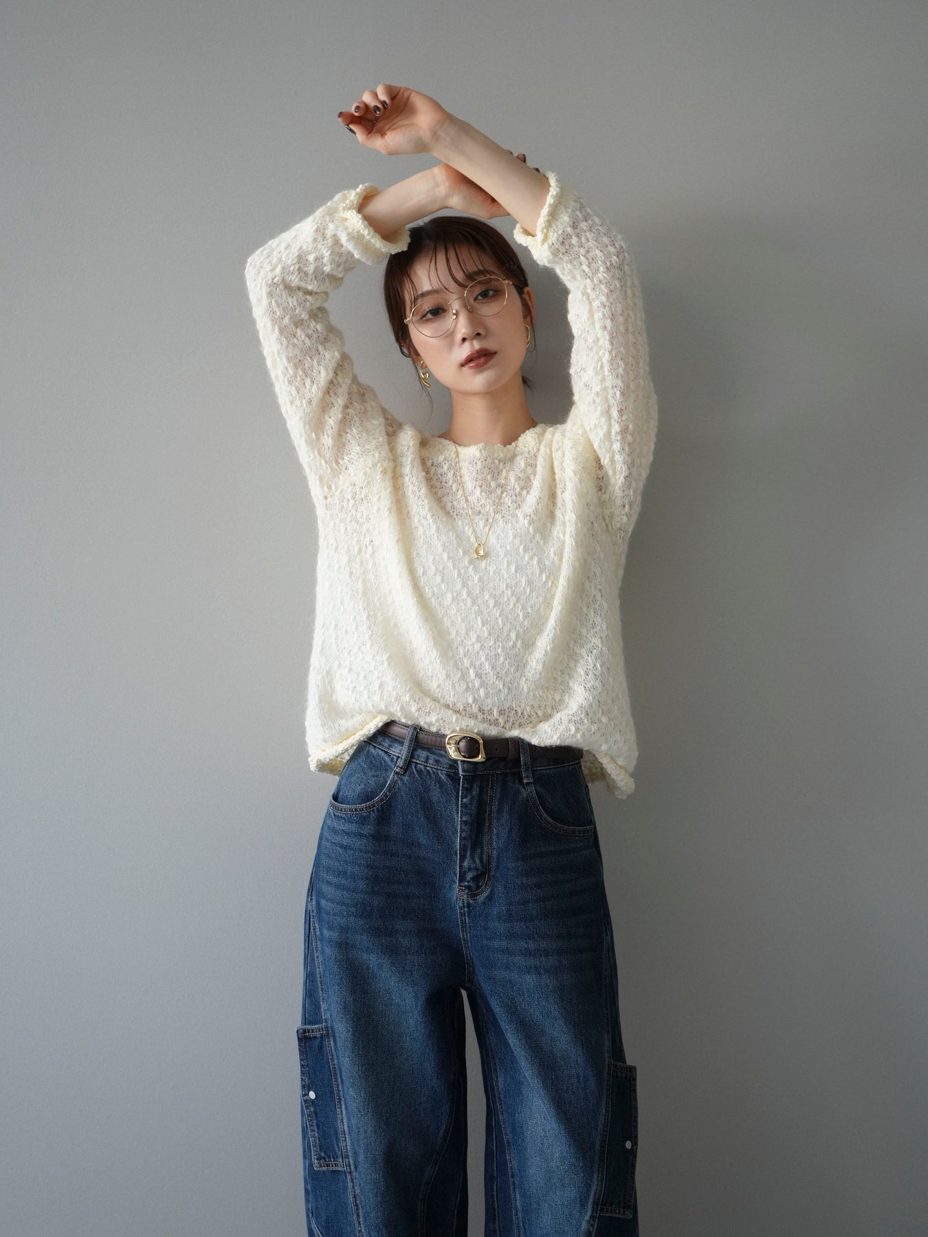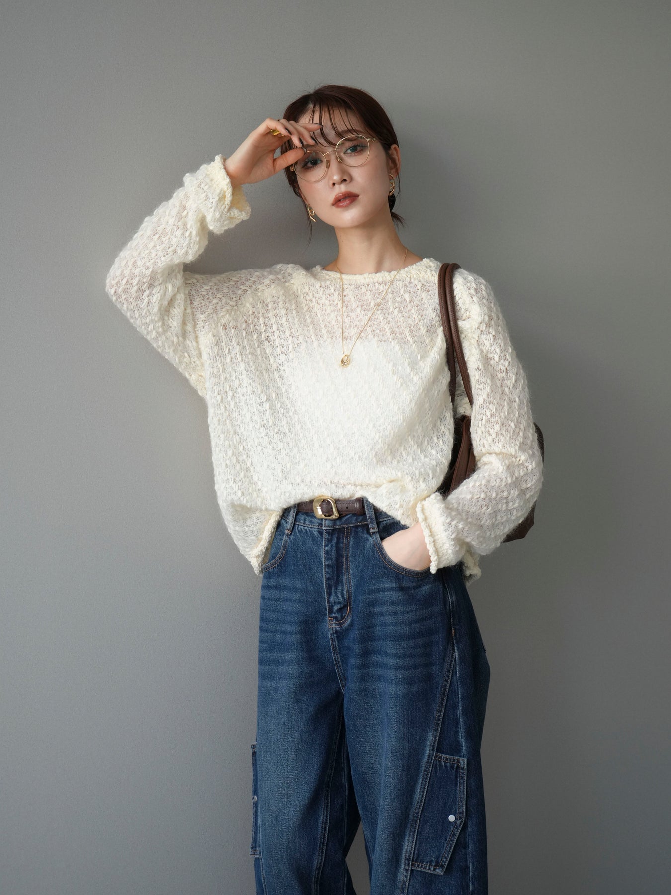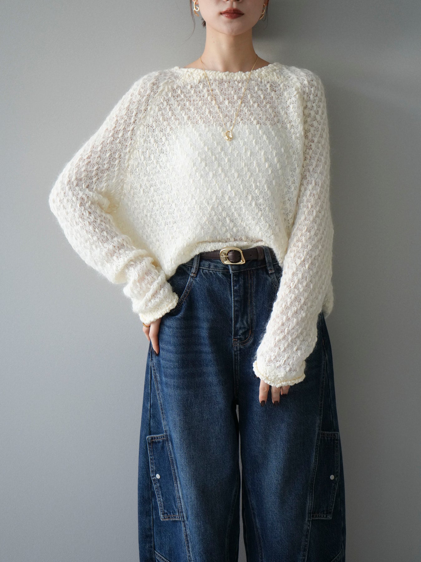 ふんわりとしたモヘアタッチ素材で仕立てた、女性らしいニュアンス漂うニットプルオーバー。 ポコポコとした表面感と繊細な透かし編みが、シンプルながらも立体的で印象的な一枚です。 軽やかな着心地で、程よい透け感が抜け感のあるスタイルを演出。 デニムやスカートと合わせるだけでバランスの取れたコーディネートに仕上がります。 シーズンムードを高めながら、柔らかな雰囲気を纏える大人のリラックスニットです。