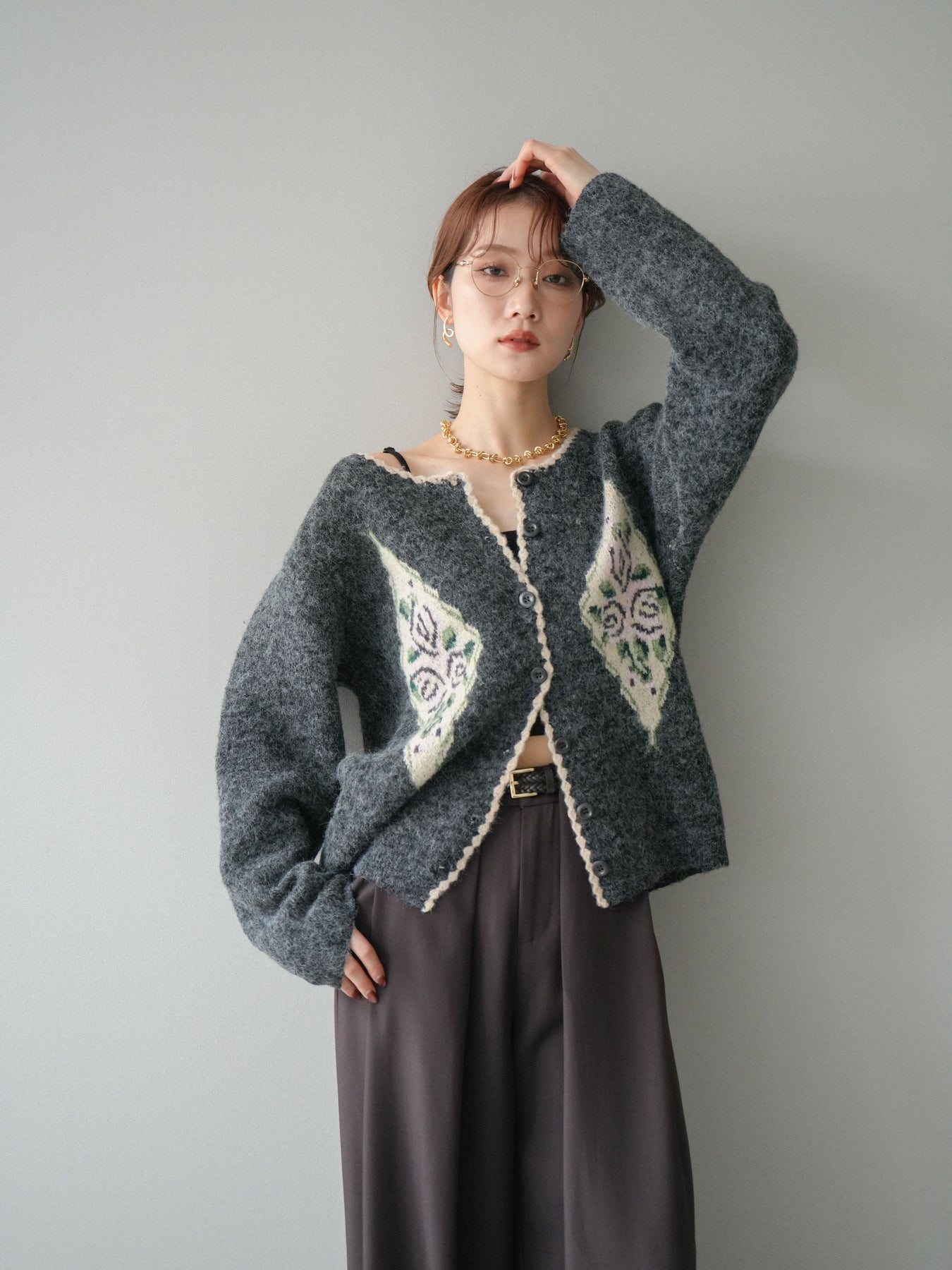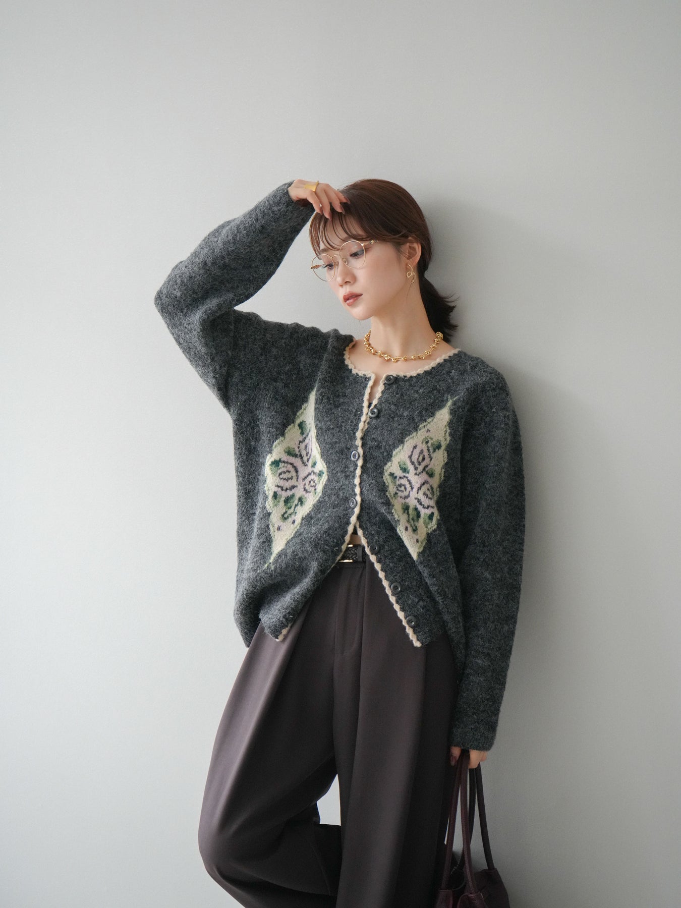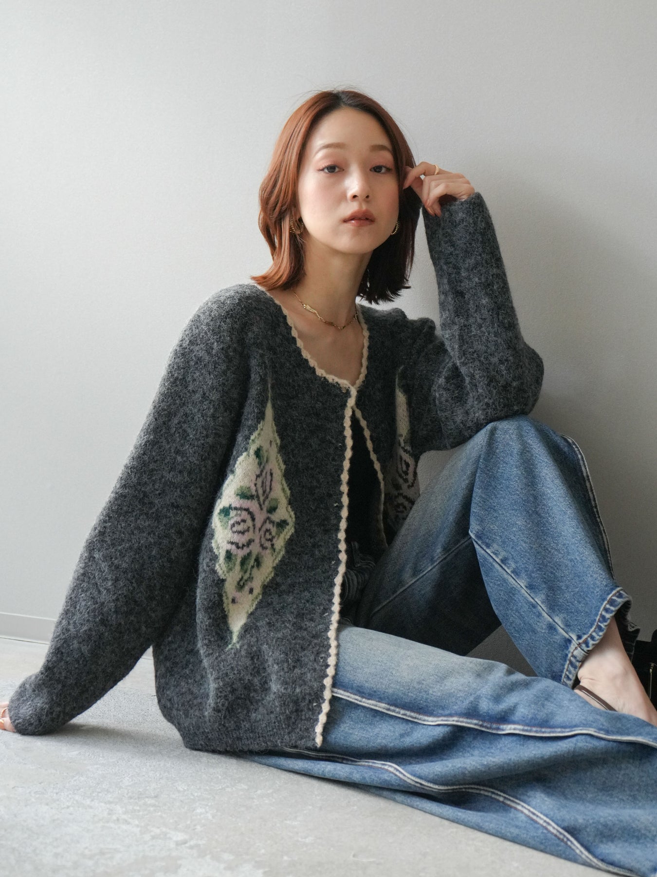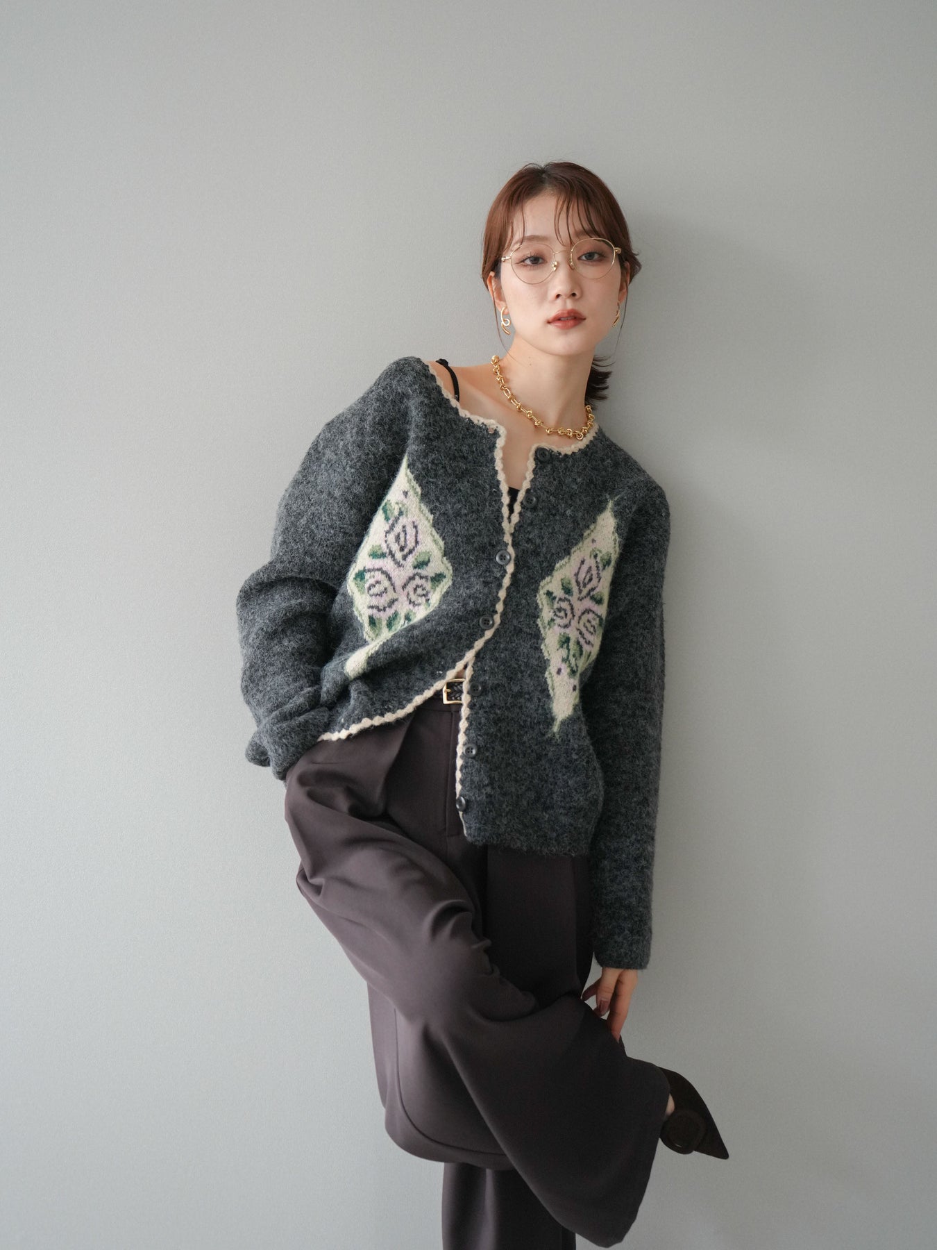 [予約]アンティークフラワージャガードニットカーディガン/charcoal