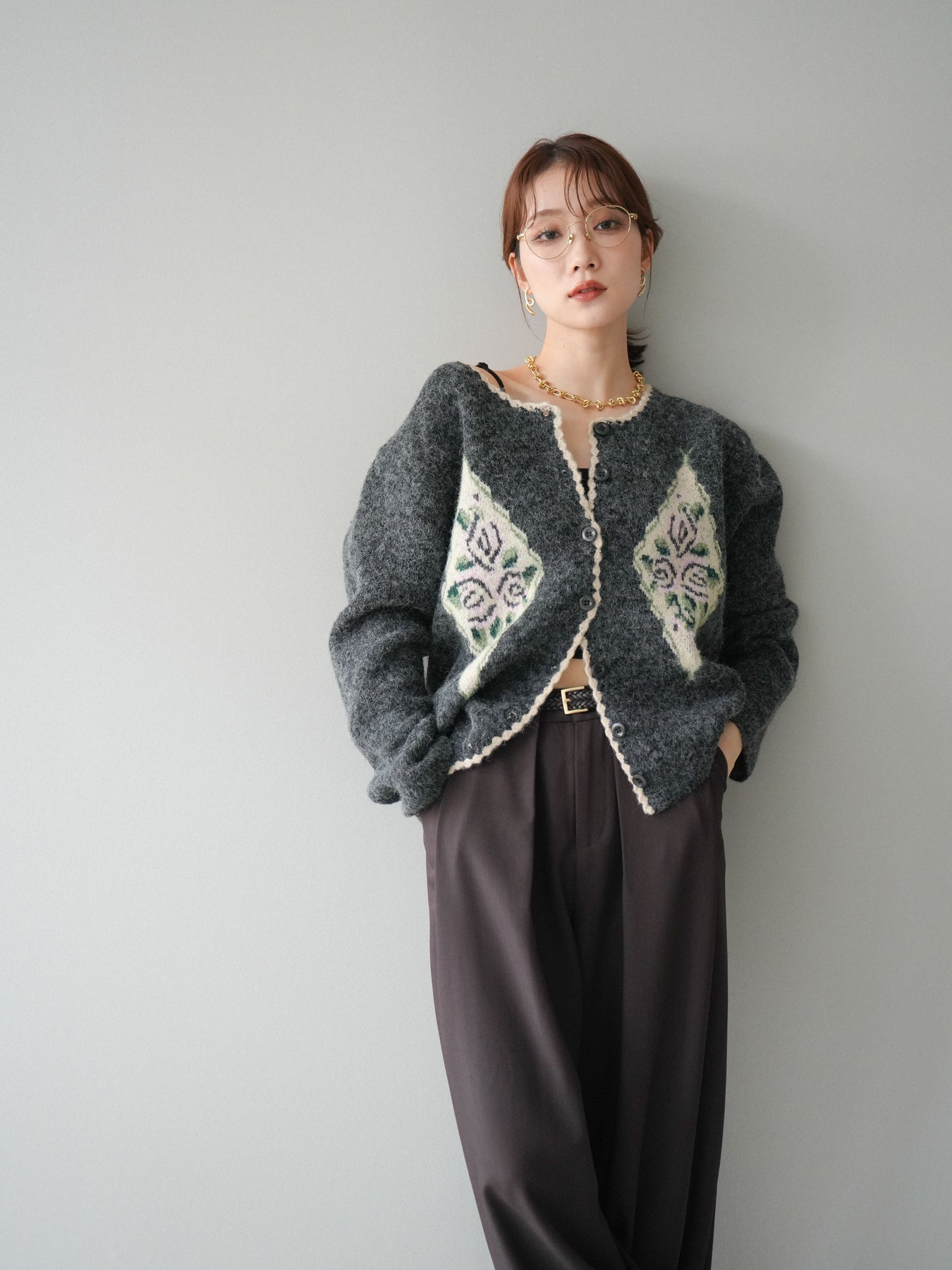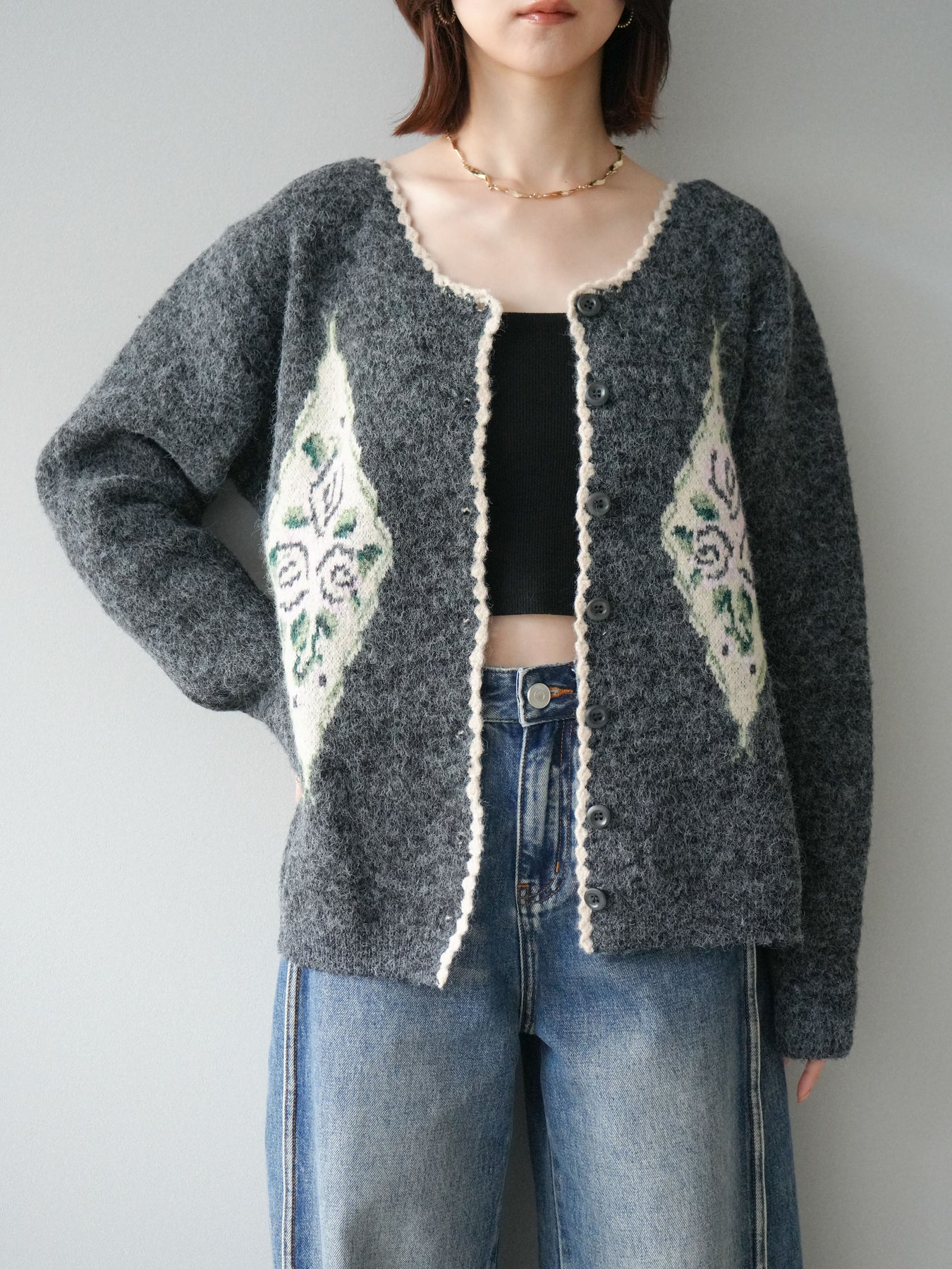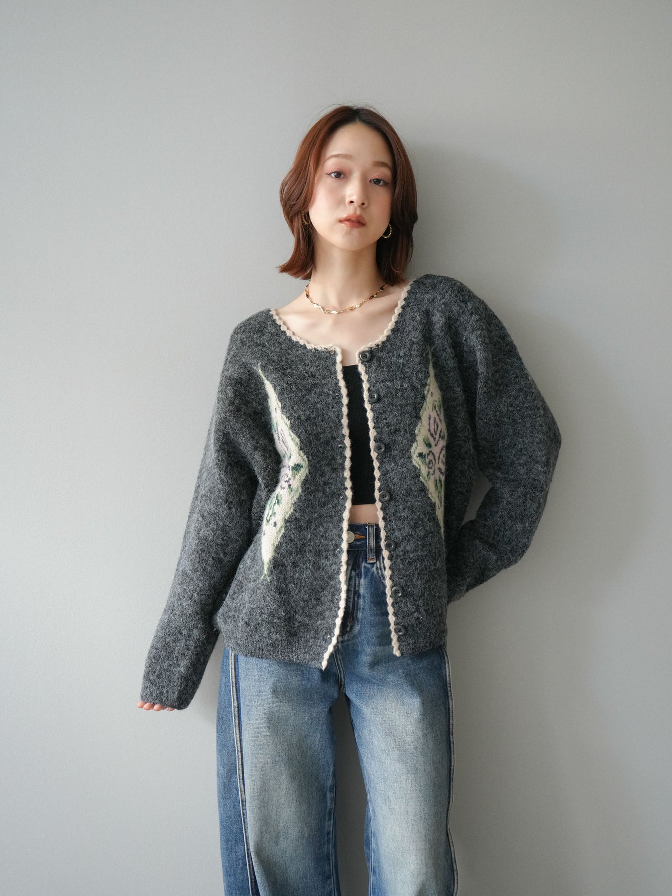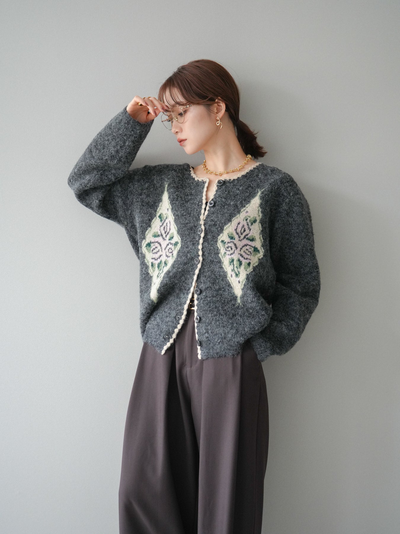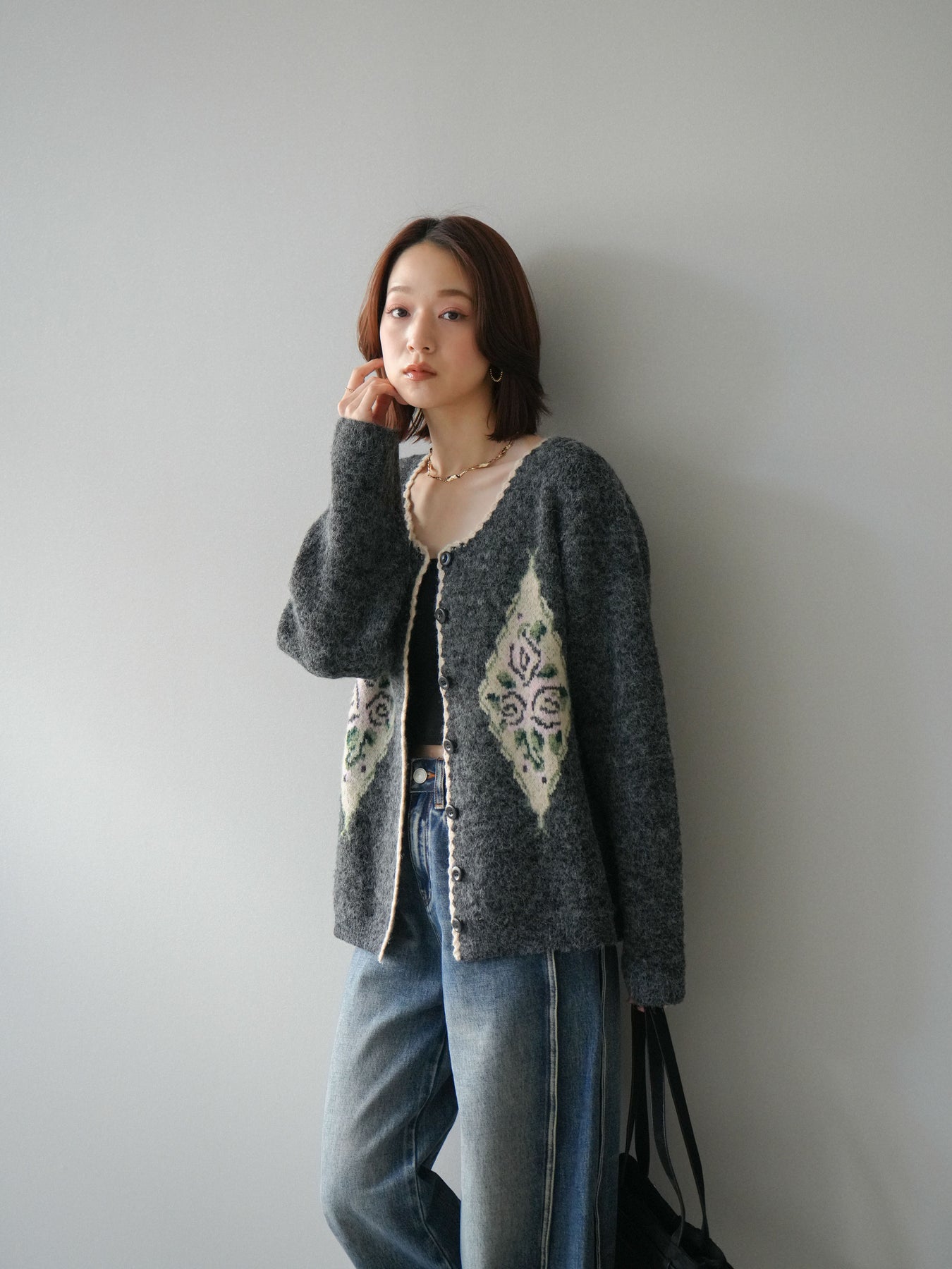 [予約]アンティークフラワージャガードニットカーディガン/charcoal
