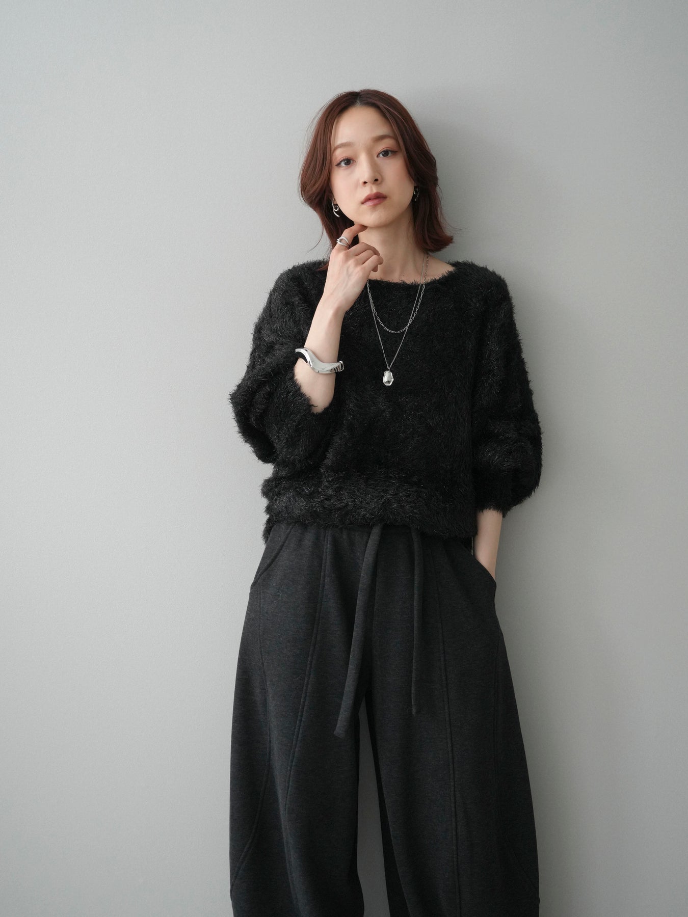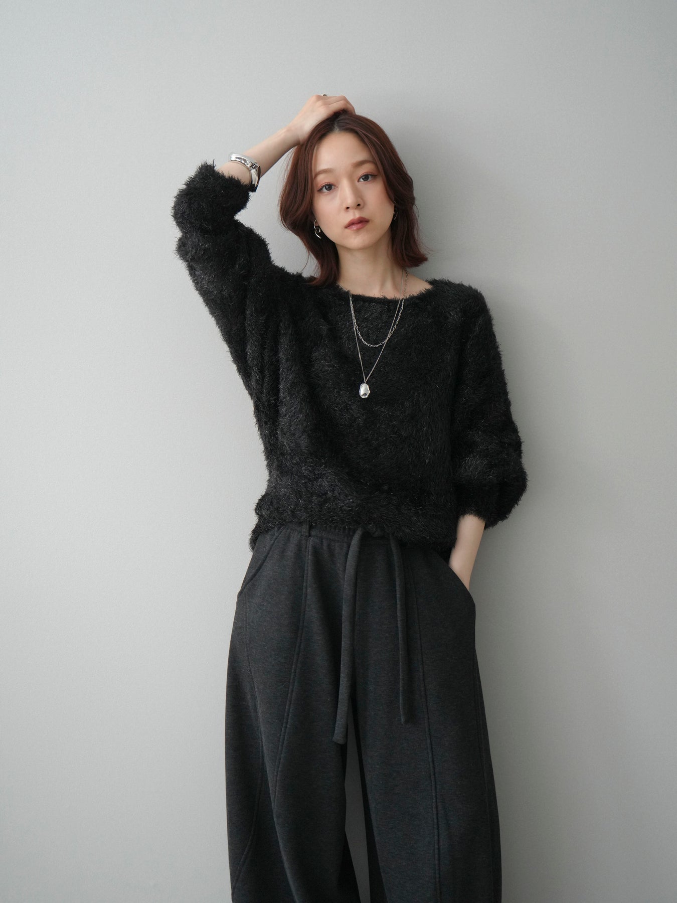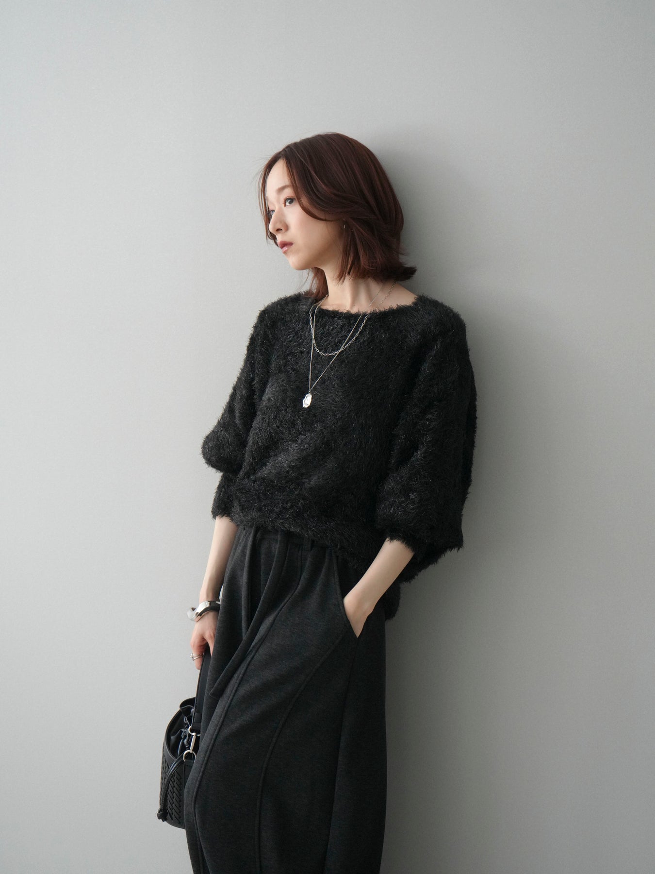 毛足のあるシャギー素材に、さりげなくラメを織り交ぜたニットプルオーバー。 動くたびにほのかにきらめく表情が、シンプルながらも華やかさを演出します。 ゆったりとしたドルマンシルエットで、リラックス感がありつつ自然に体のラインをカバー。 柔らかな素材感がシーズンムードを高め、1枚でコーディネートの主役になる一着です。 デイリーにはもちろん、少し特別感のあるスタイリングにも取り入れやすいニットです。