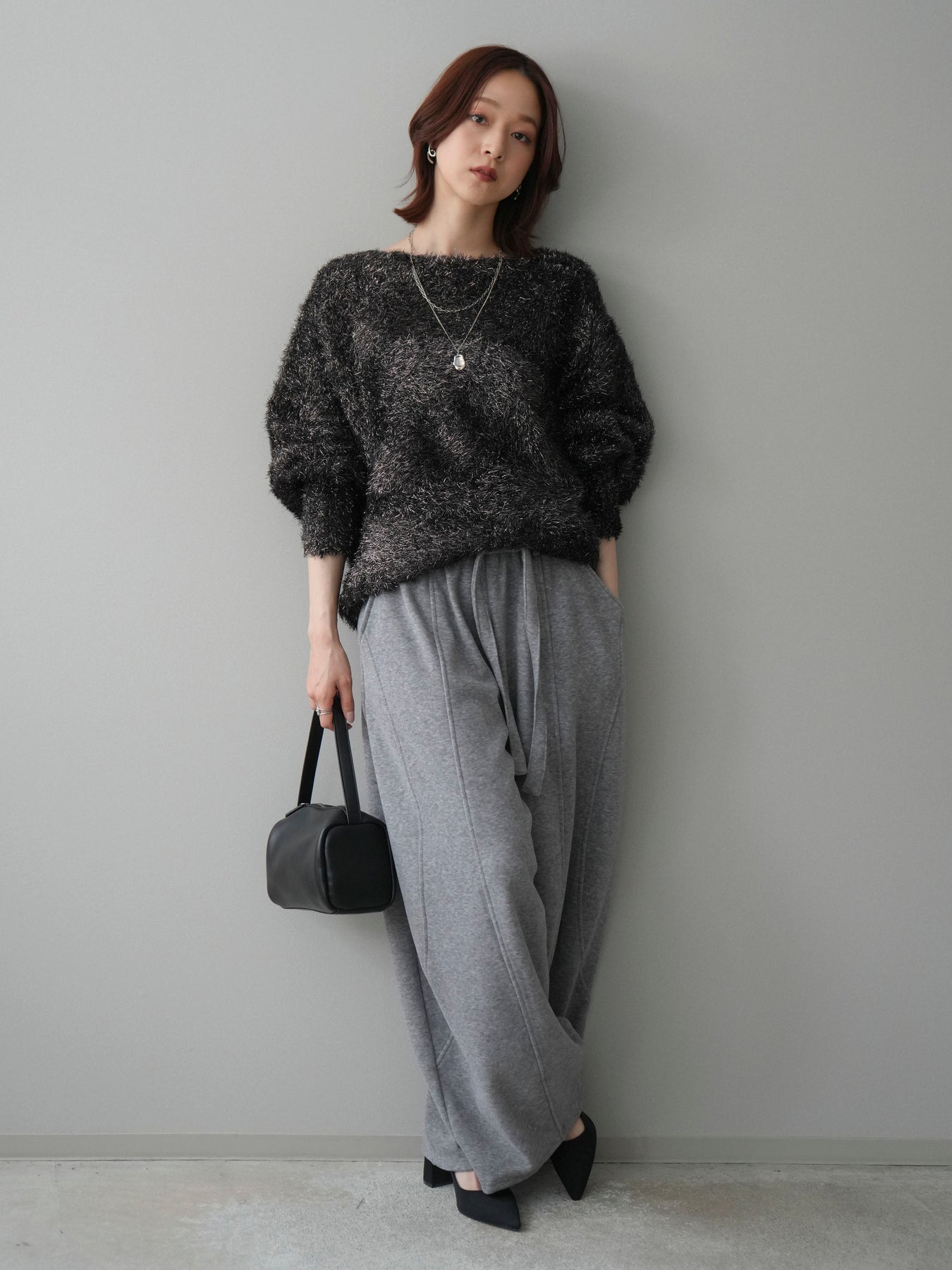毛足のあるシャギー素材に、さりげなくラメを織り交ぜたニットプルオーバー。 動くたびにほのかにきらめく表情が、シンプルながらも華やかさを演出します。 ゆったりとしたドルマンシルエットで、リラックス感がありつつ自然に体のラインをカバー。 柔らかな素材感がシーズンムードを高め、1枚でコーディネートの主役になる一着です。 デイリーにはもちろん、少し特別感のあるスタイリングにも取り入れやすいニットです。
