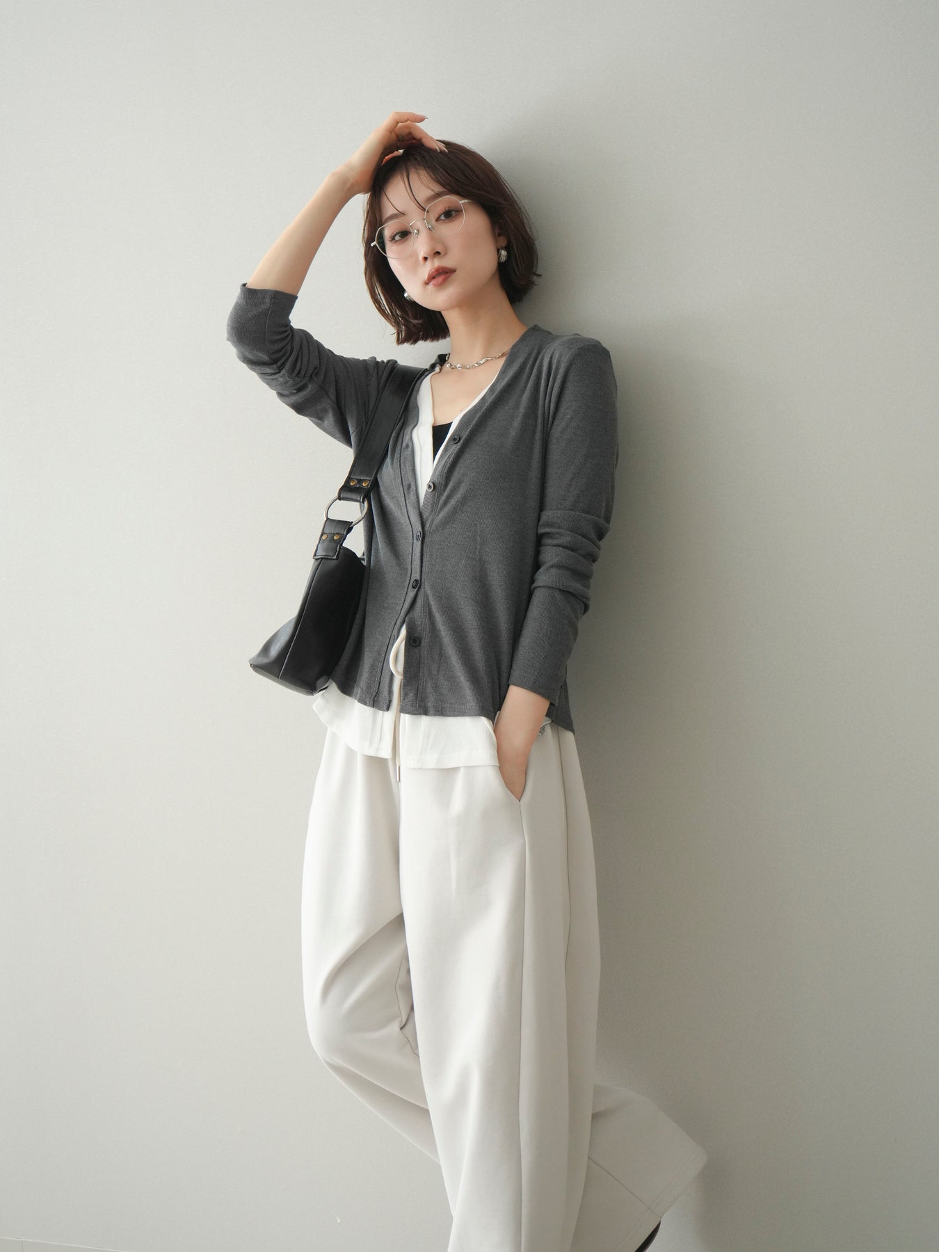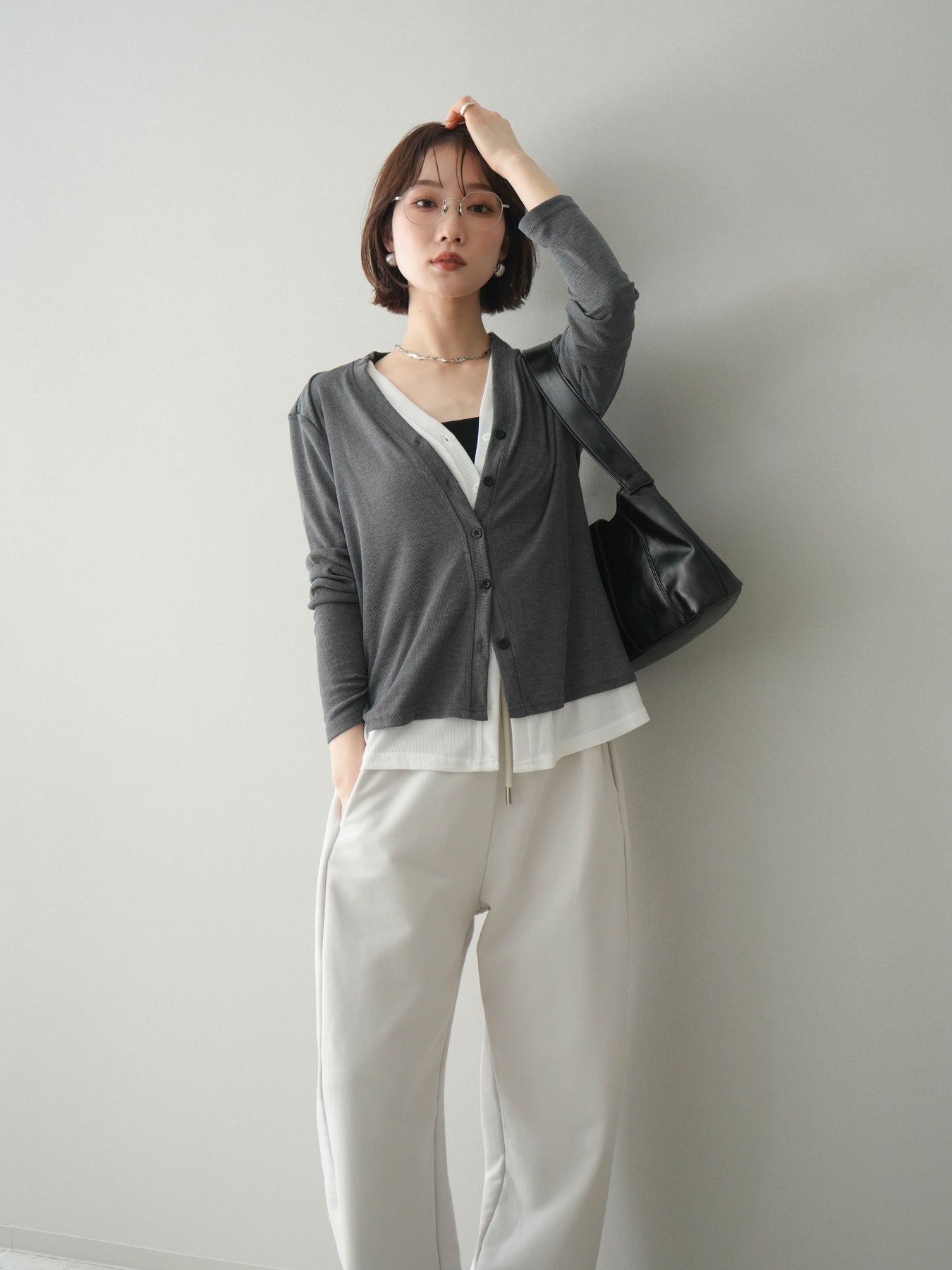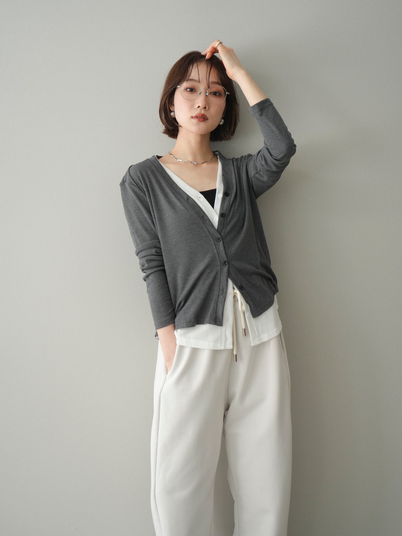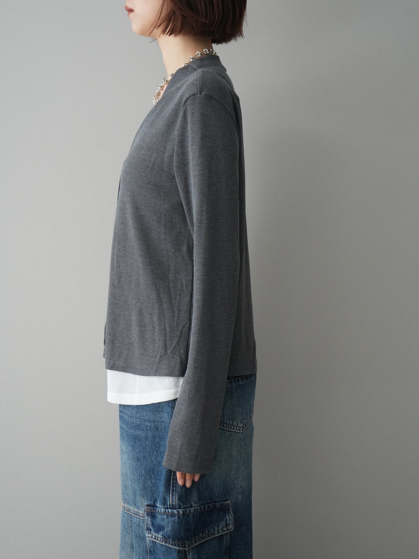 [予約]配色レイヤードカットリブカーディガン/gray