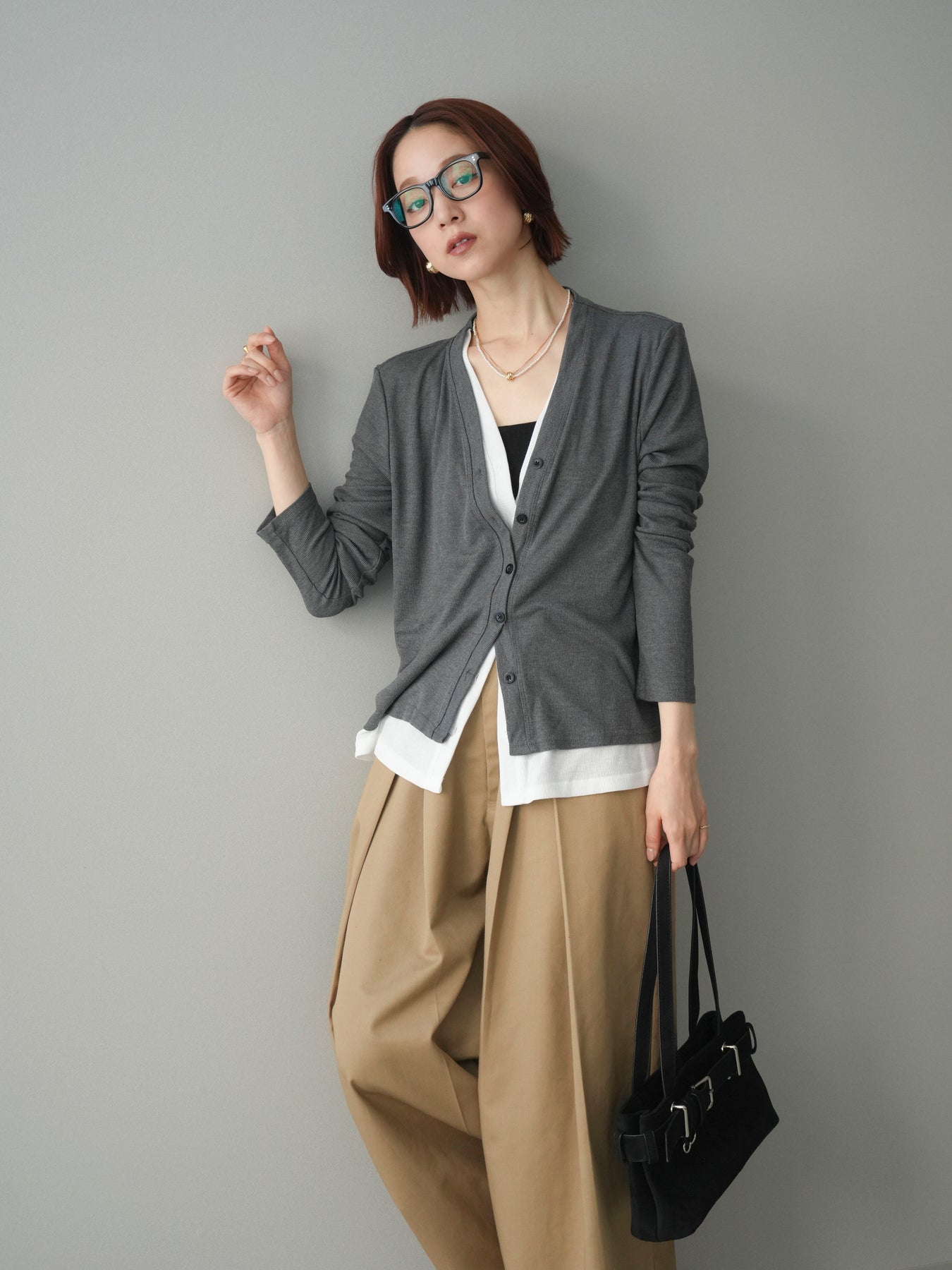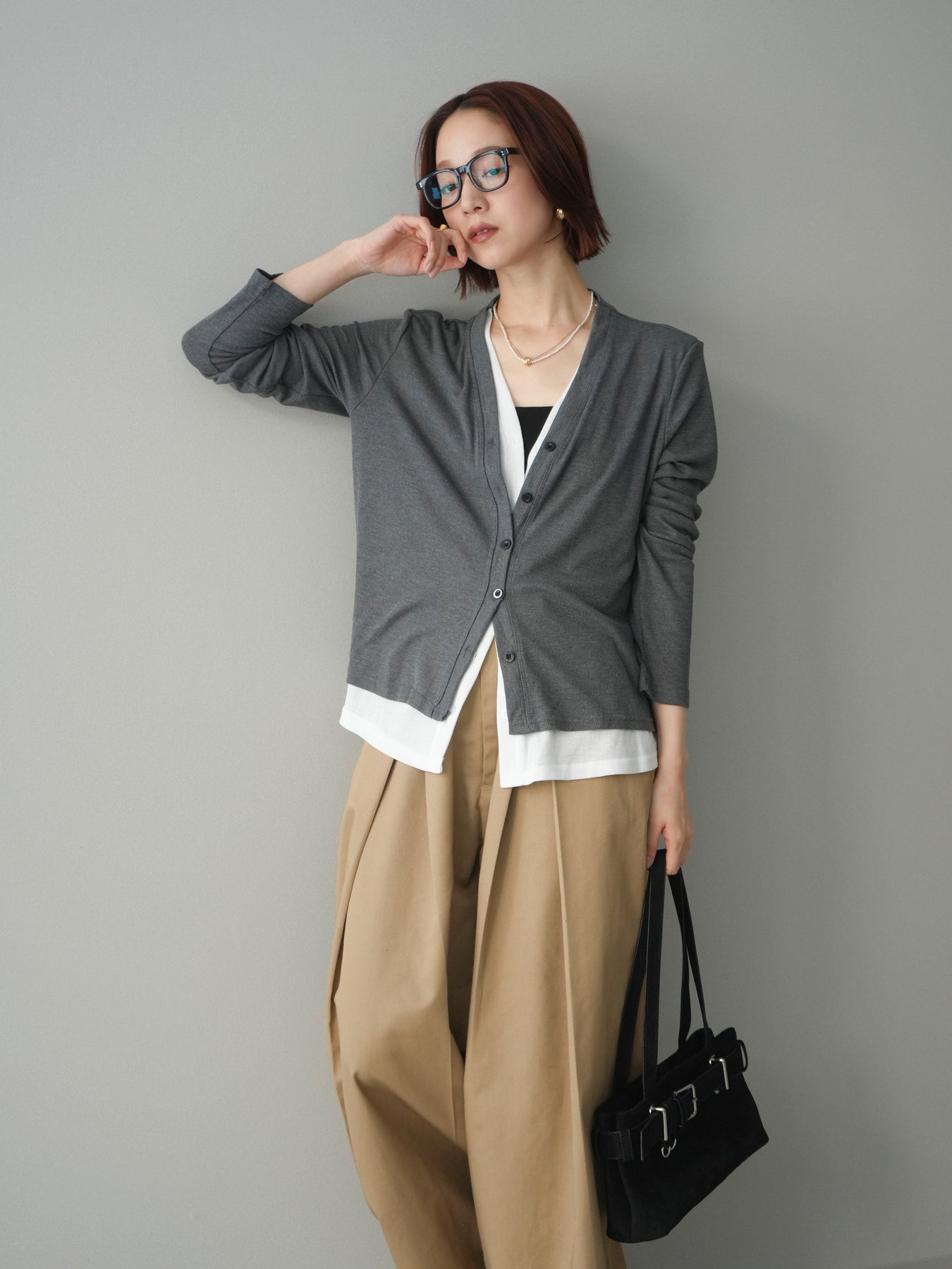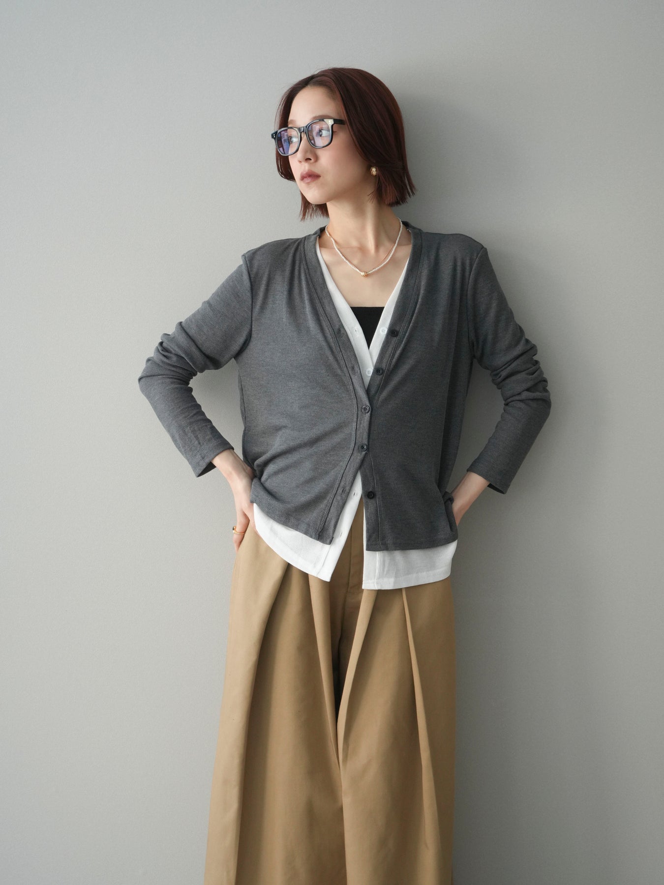 配色のレイヤードデザインがポイントの、カットリブ素材カーディガン。シンプルなVネックに、裾から覗くレイヤード風ディテールを加えることで、1枚で奥行きのあるスタイリングが完成します。程よく伸縮性のあるリブ素材で着心地が良く、すっきりとしたシルエットながら体のラインを拾いにくいのも魅力。前を留めてトップス感覚でも、羽織りとしても活躍し、デイリーからきれいめまで幅広いコーディネートに取り入れやすい一着です。 ※ボトムス、キャミソール(インナー)以外の商品は一律でインナーは付属していません。
