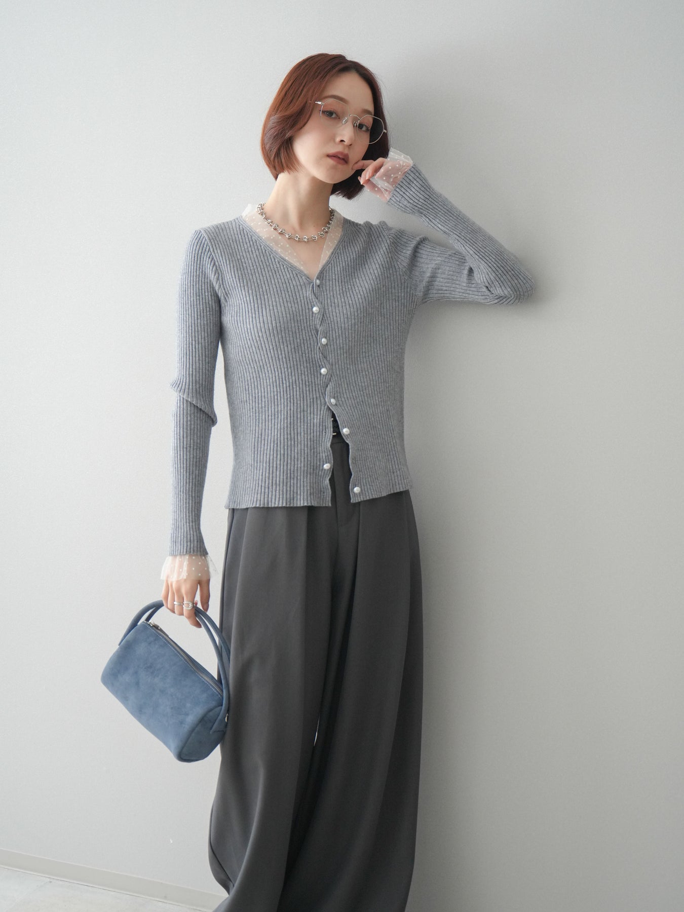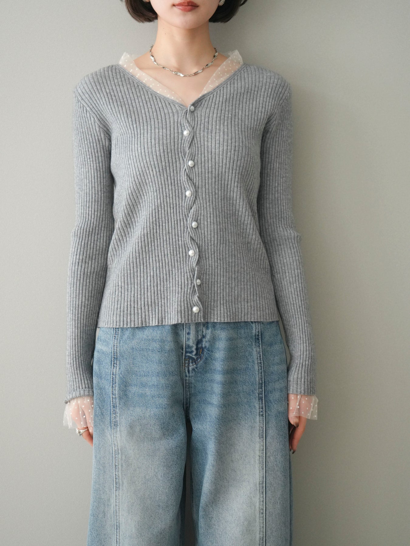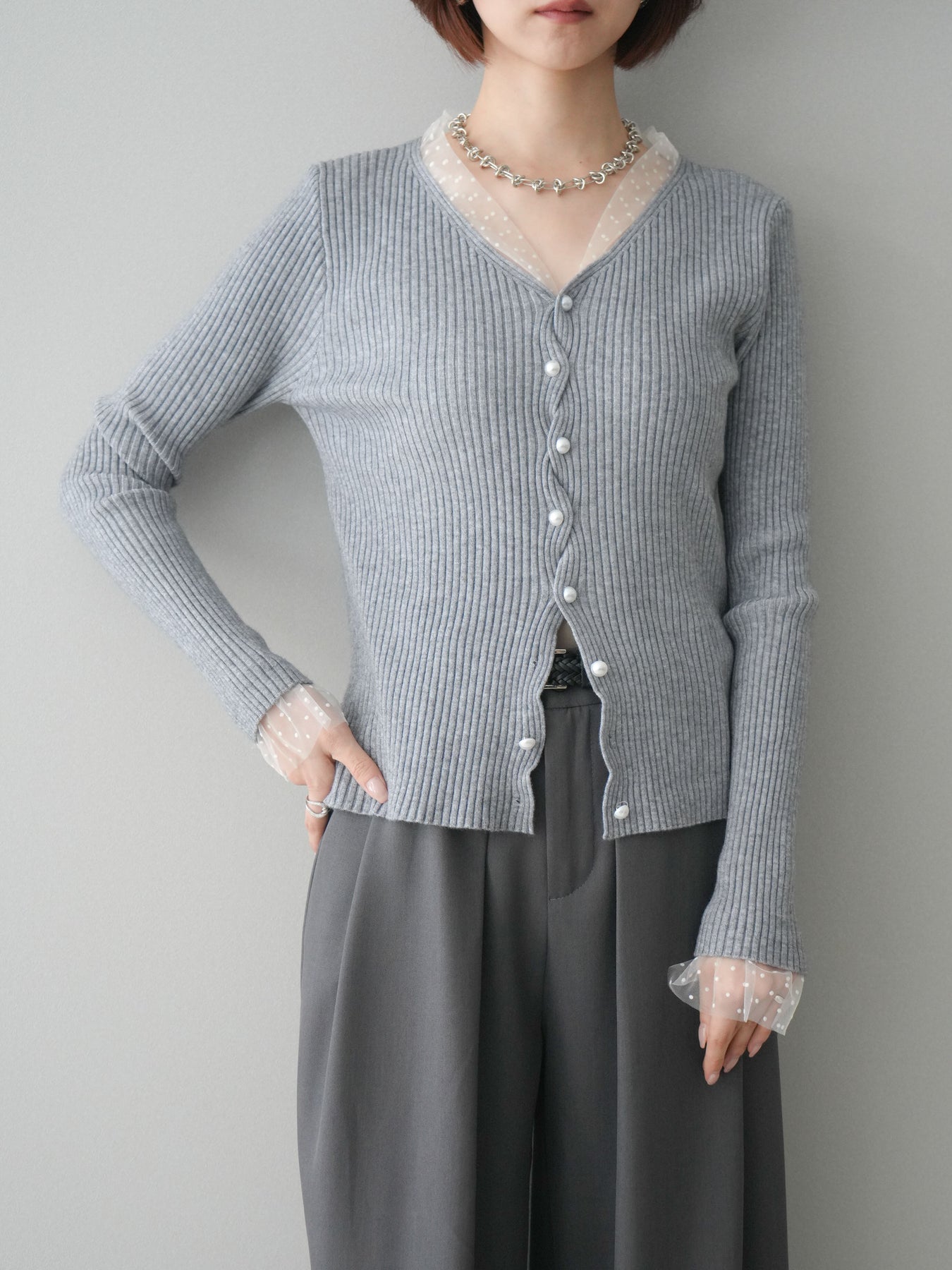 [予約]チュールドッキングパールボタンニットカーディガン/gray