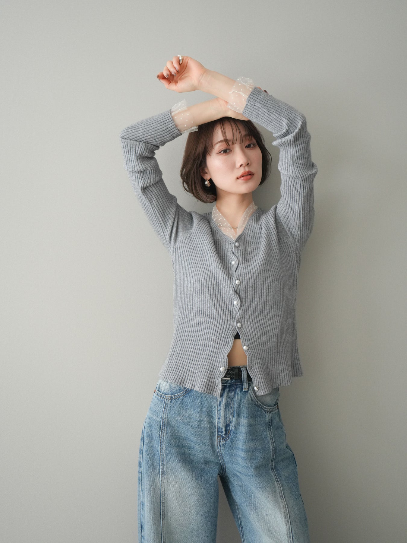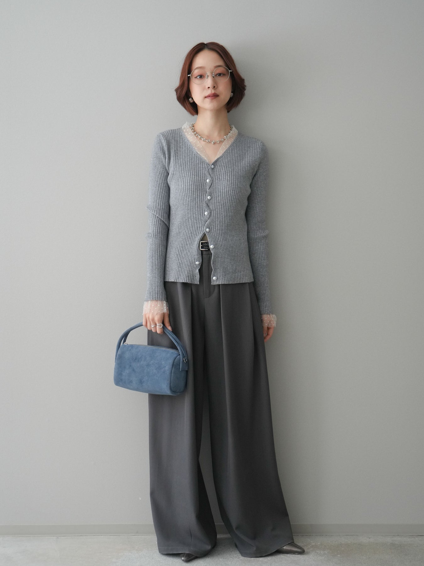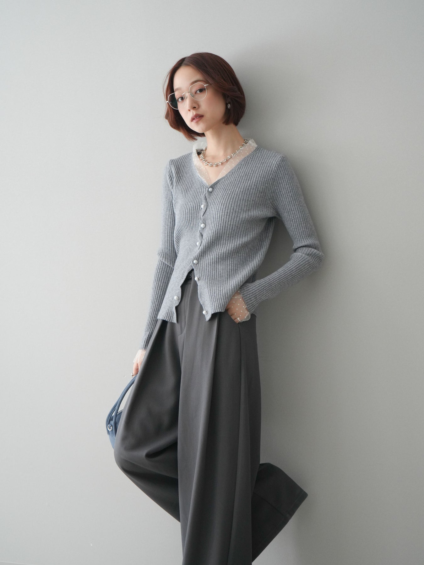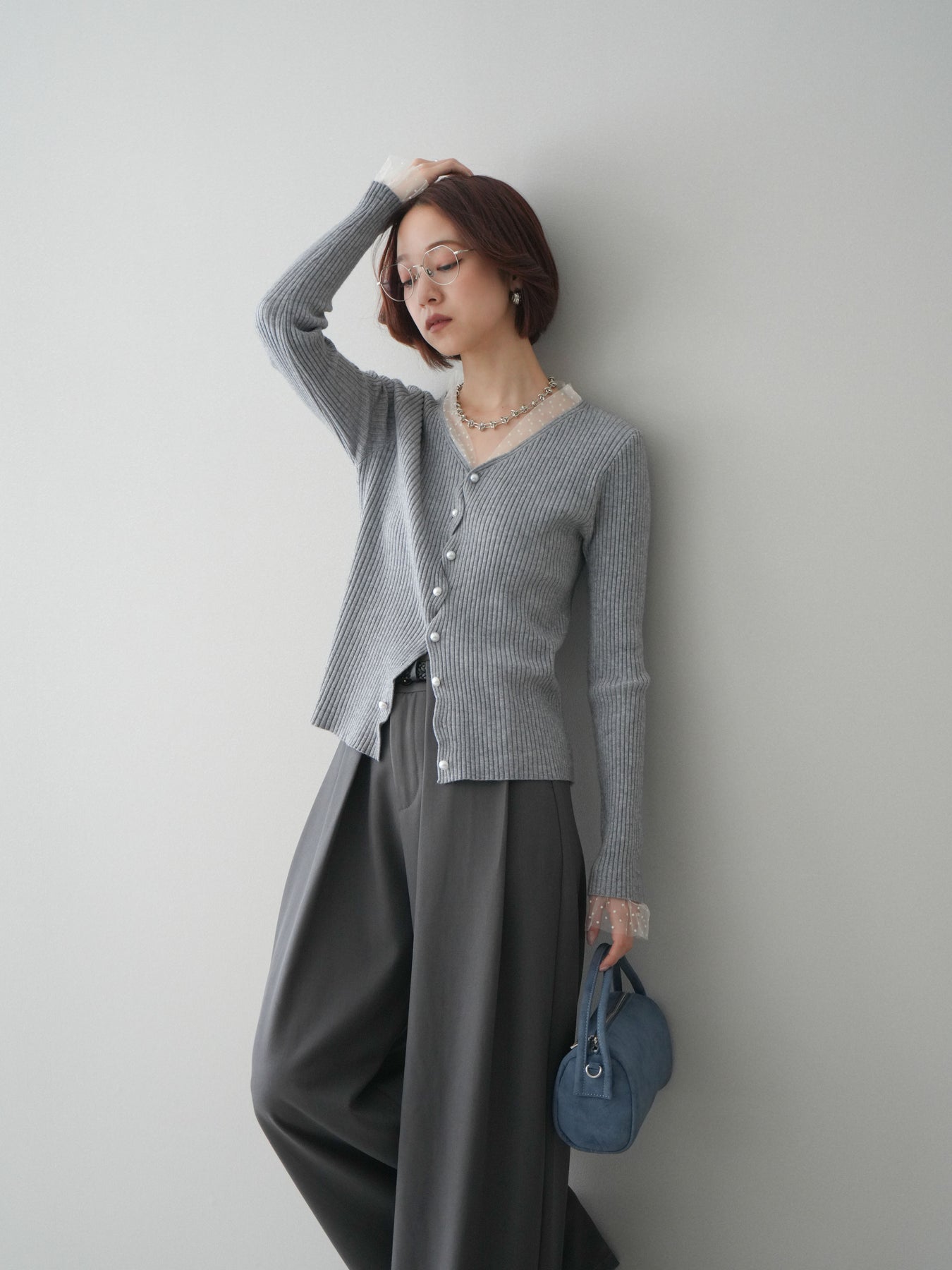 [予約]チュールドッキングパールボタンニットカーディガン/gray