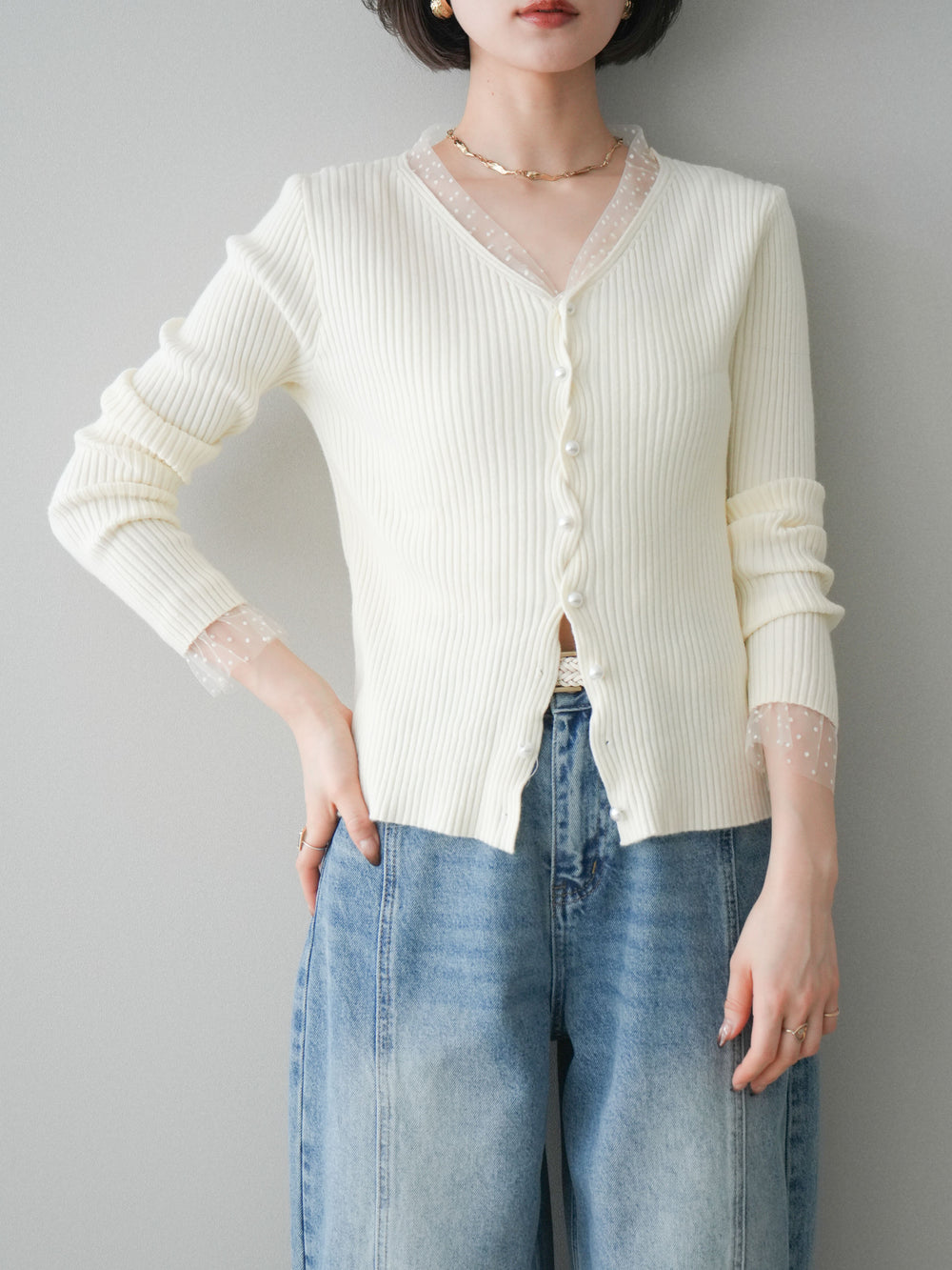 【預購】薄紗拼接珍珠紐扣針織開襟衫 / 象牙色