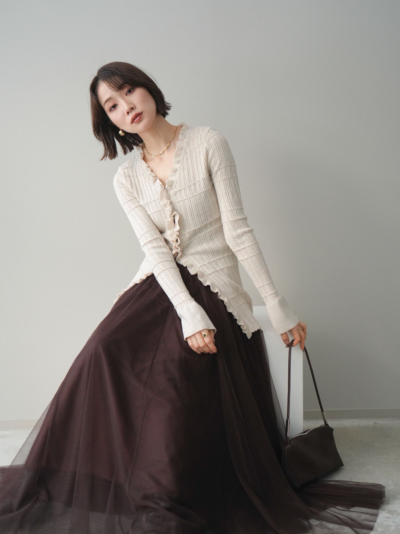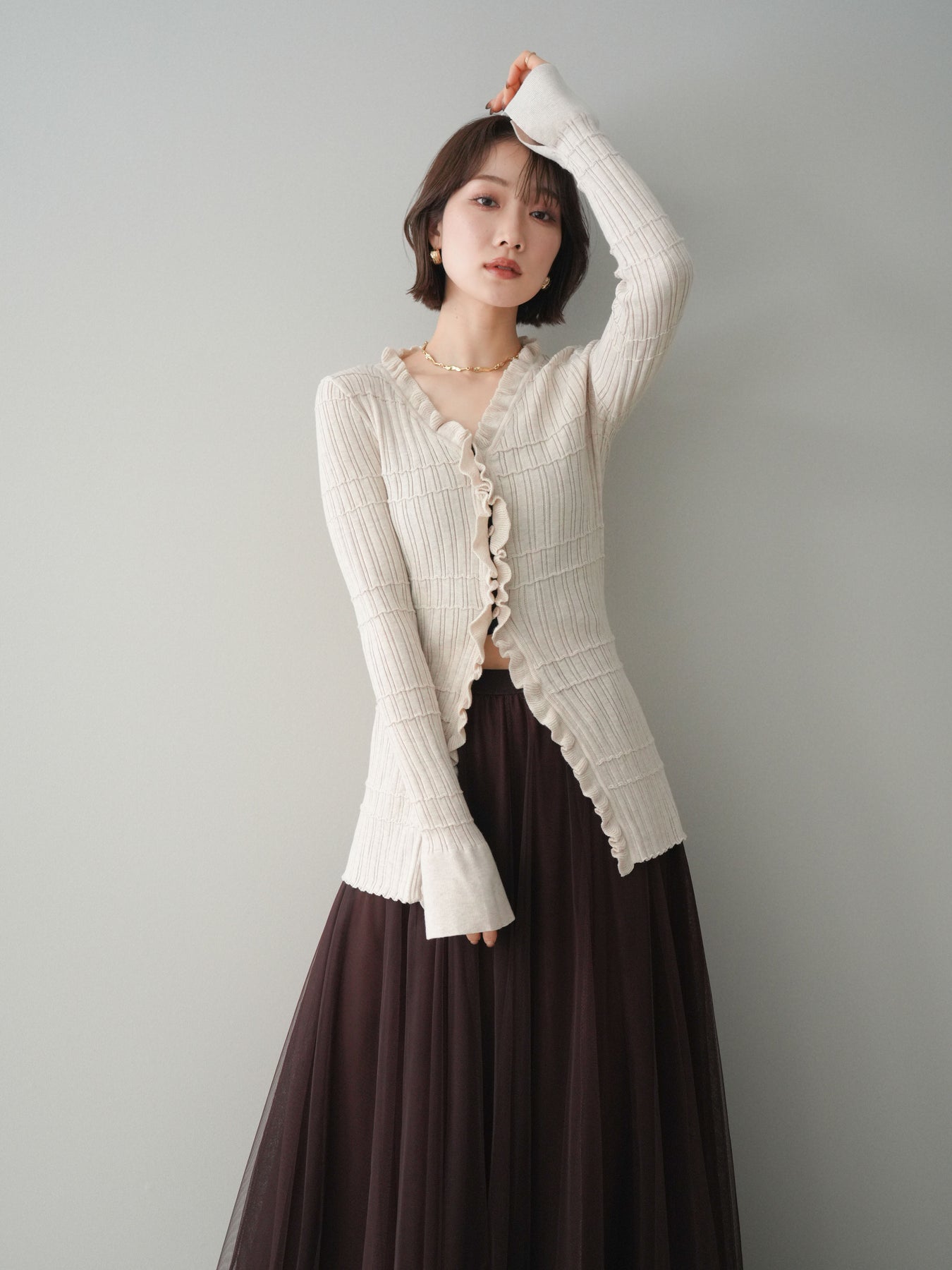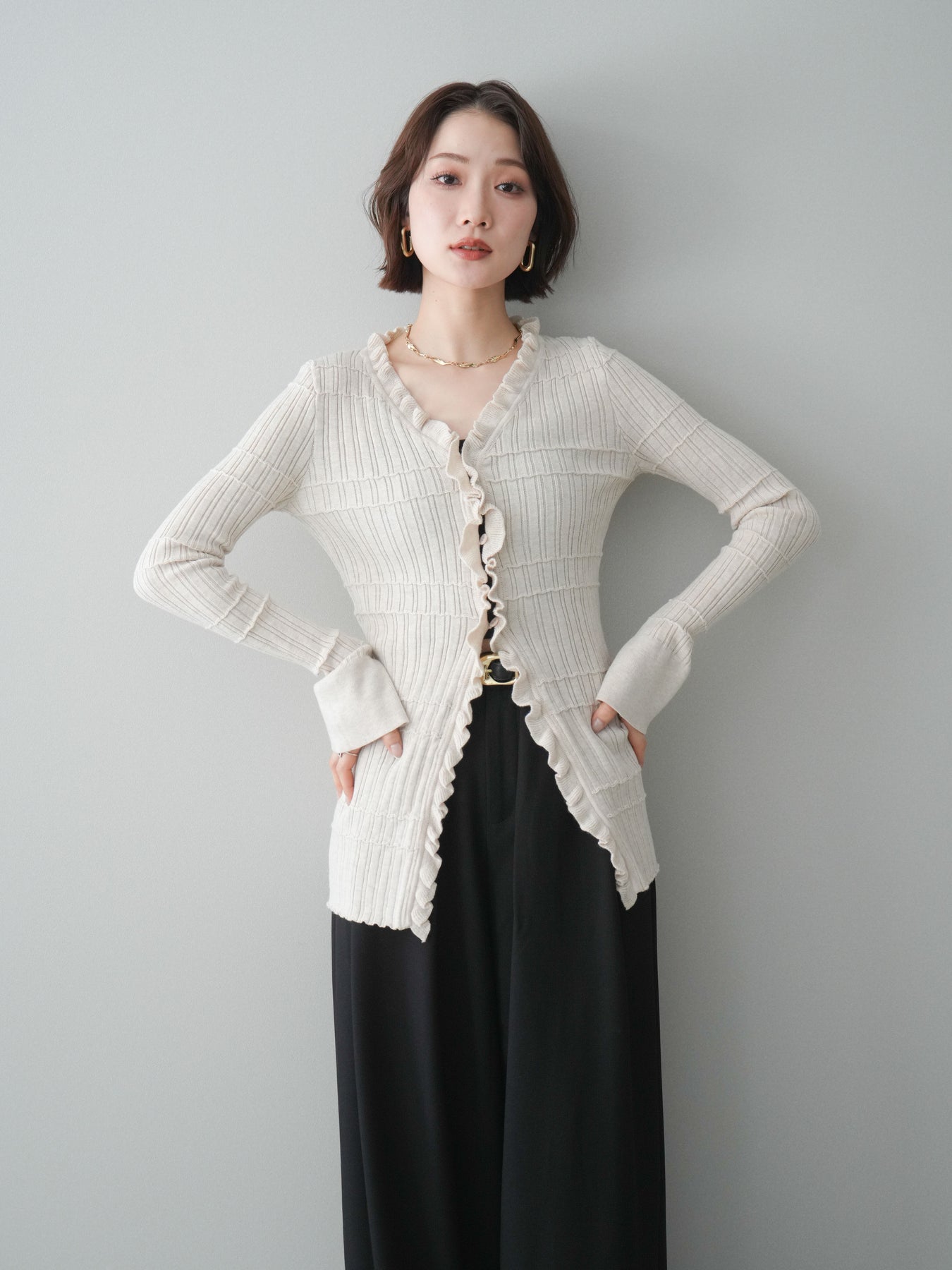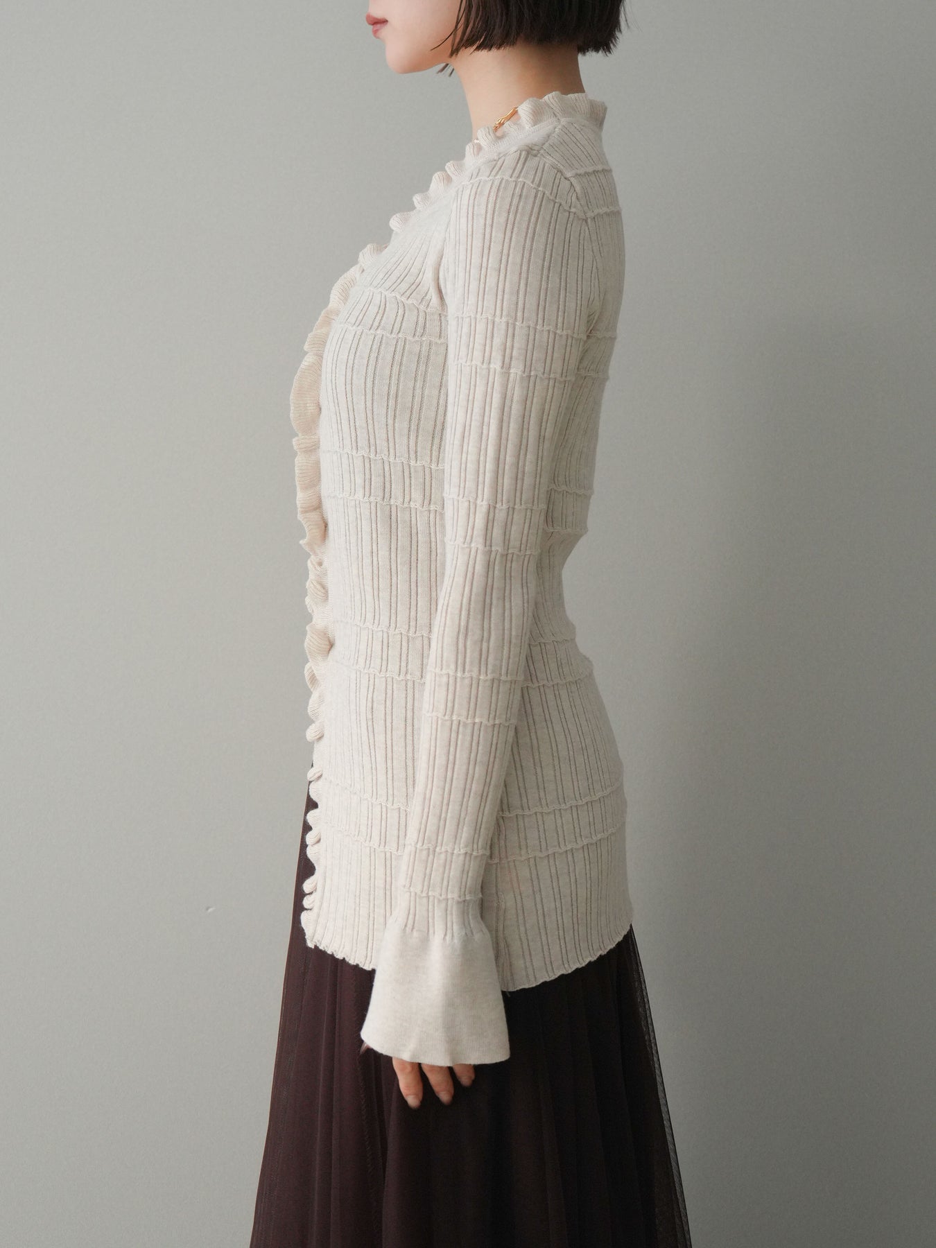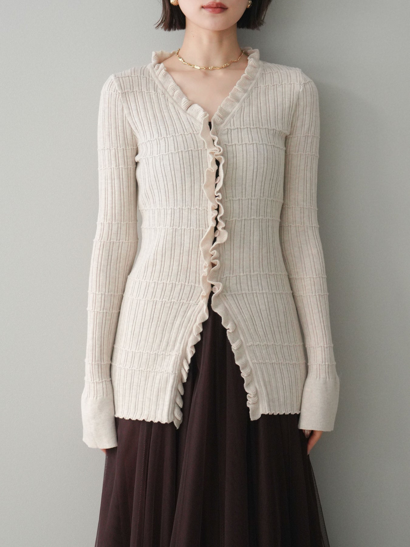[予約]フロントフリルリブニットカーディガン/beige
