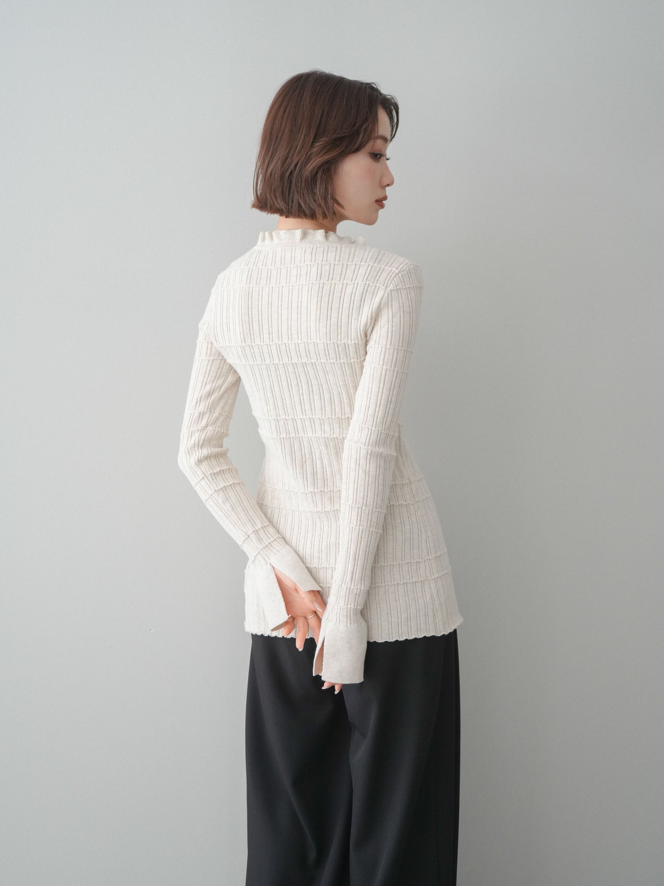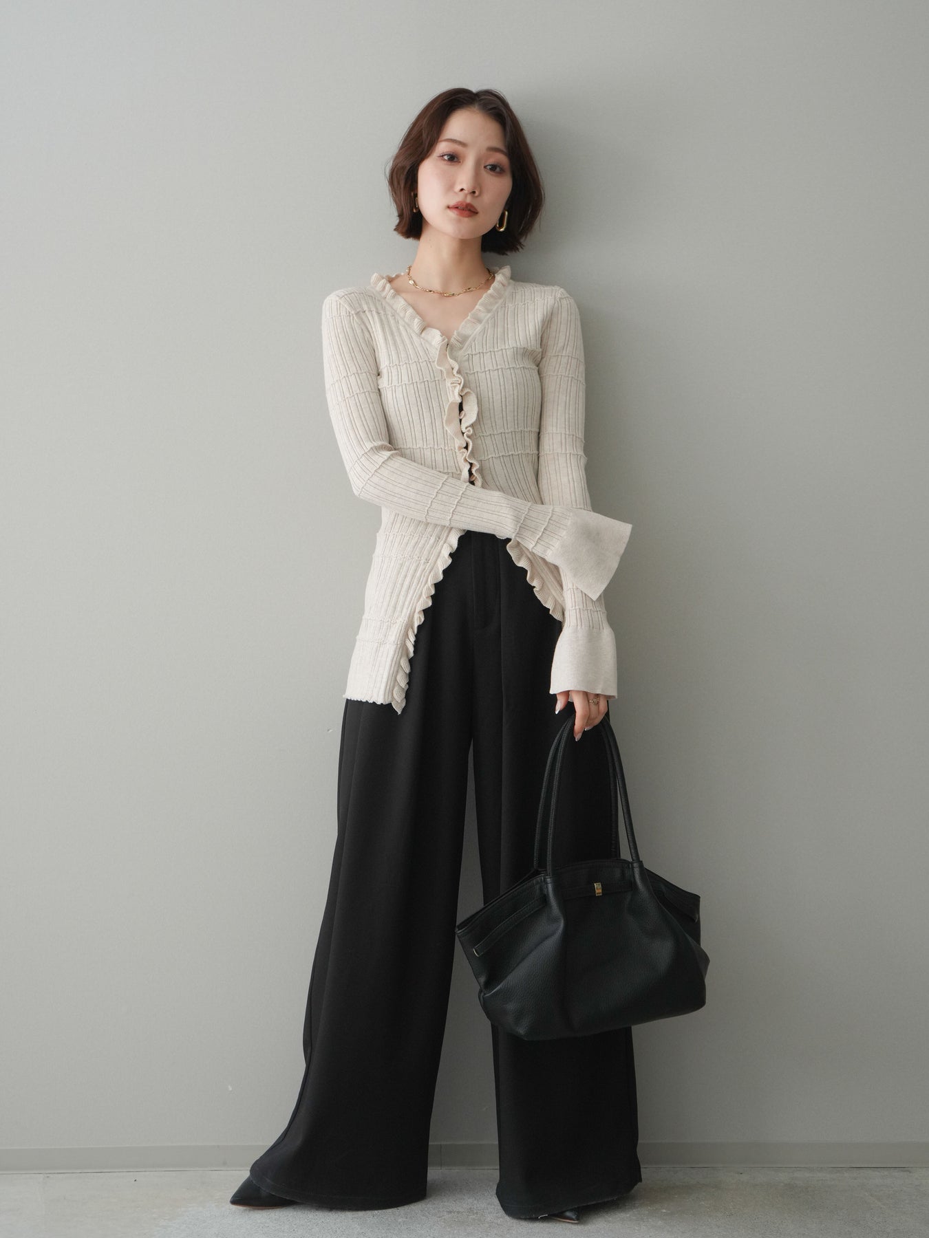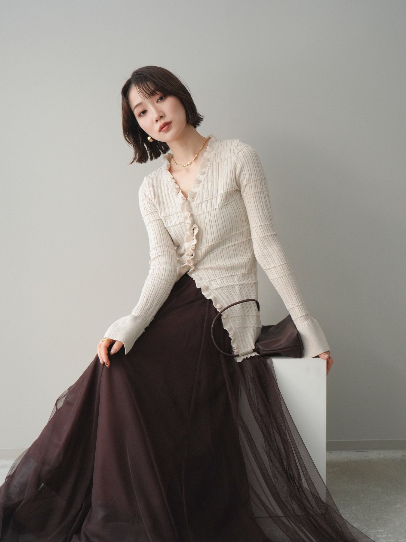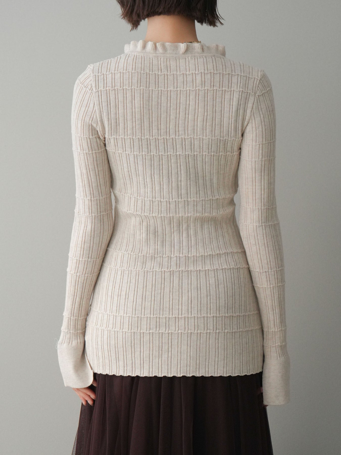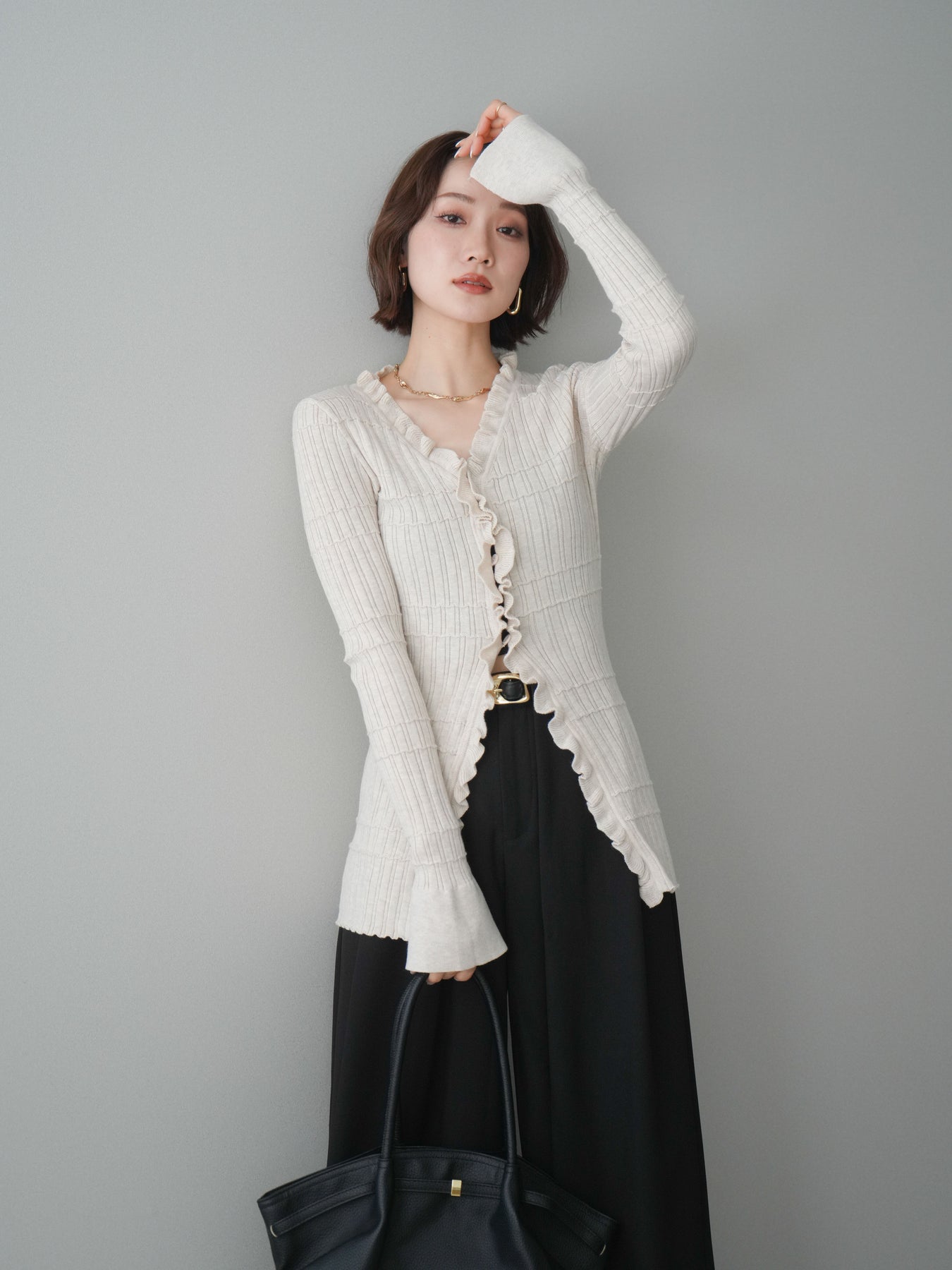 [予約]フロントフリルリブニットカーディガン/beige