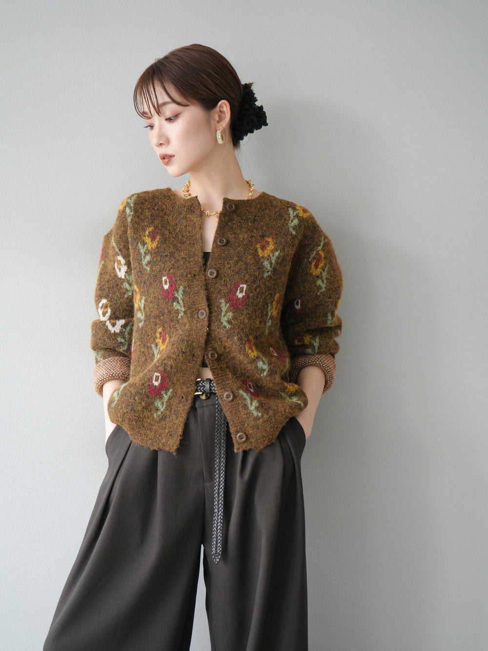 [予約]ウールタッチフラワーニットカーディガン/ブラウン