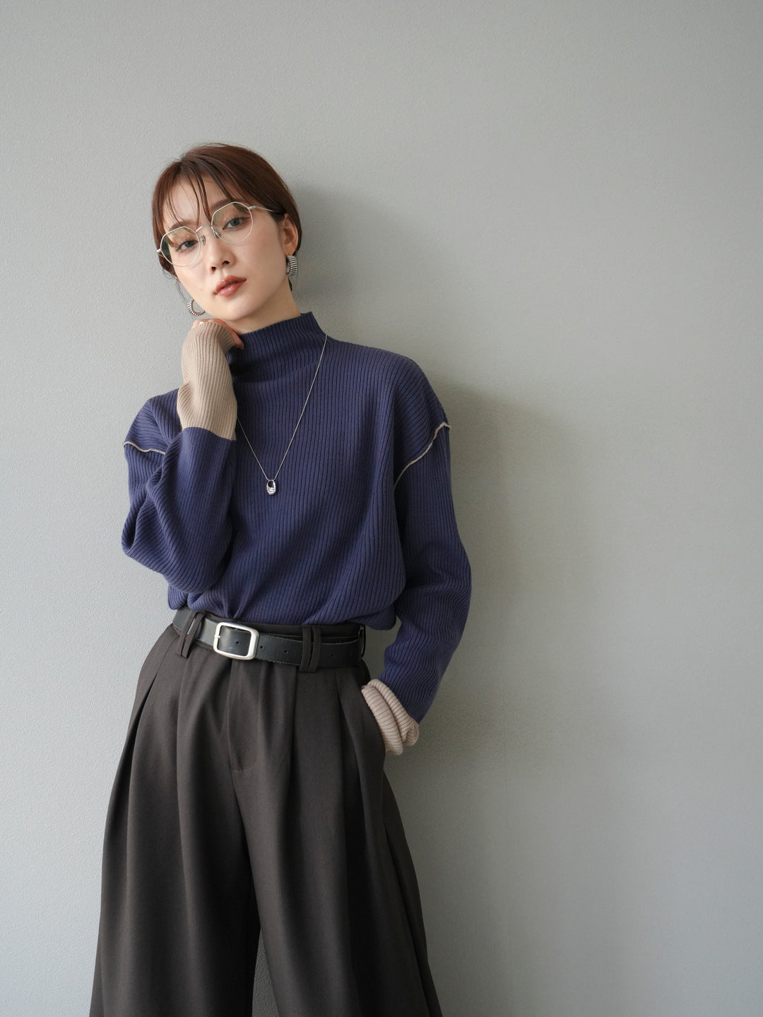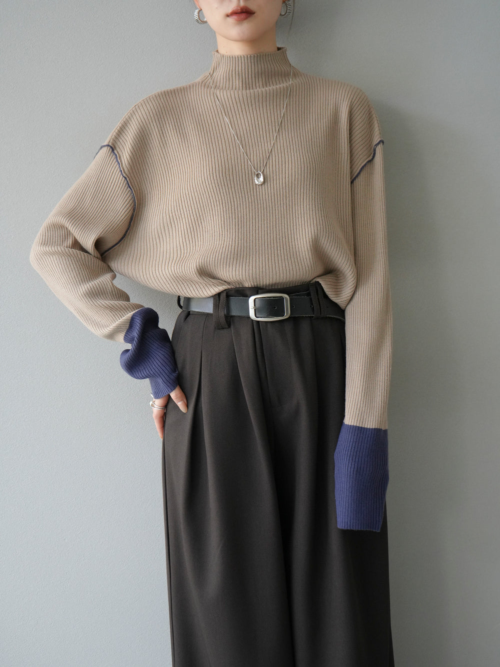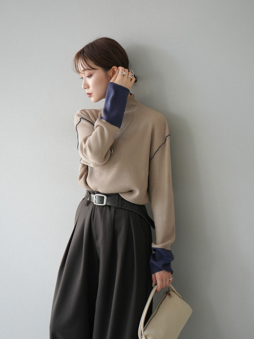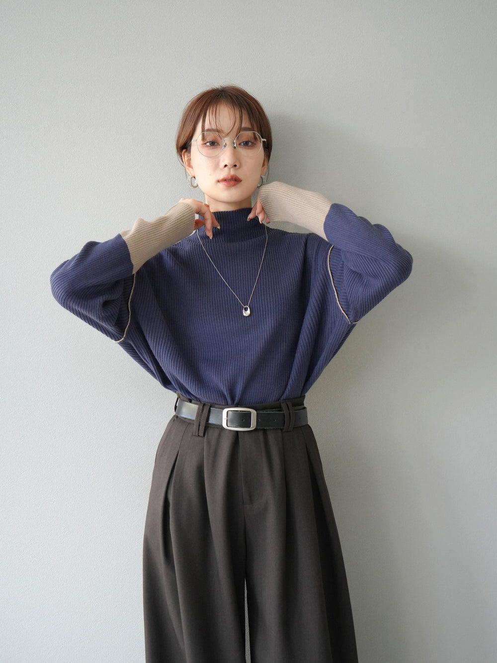 [予約]ボトルネック配色リブニットプルオーバー/アイアンブルー×ベージュ