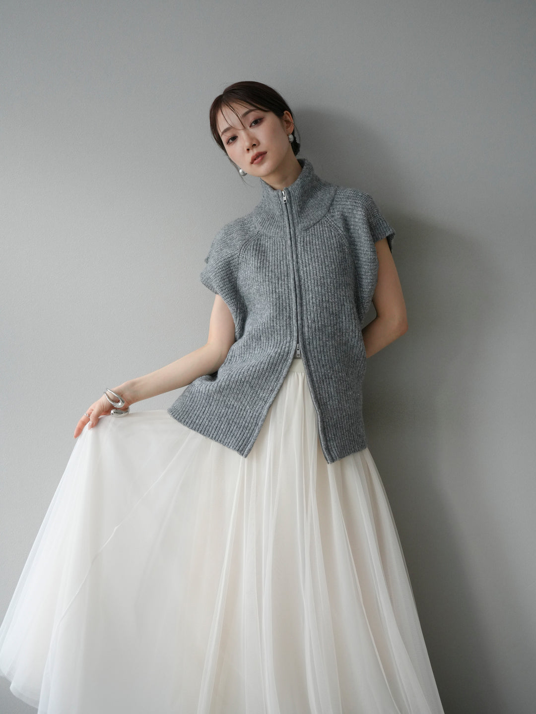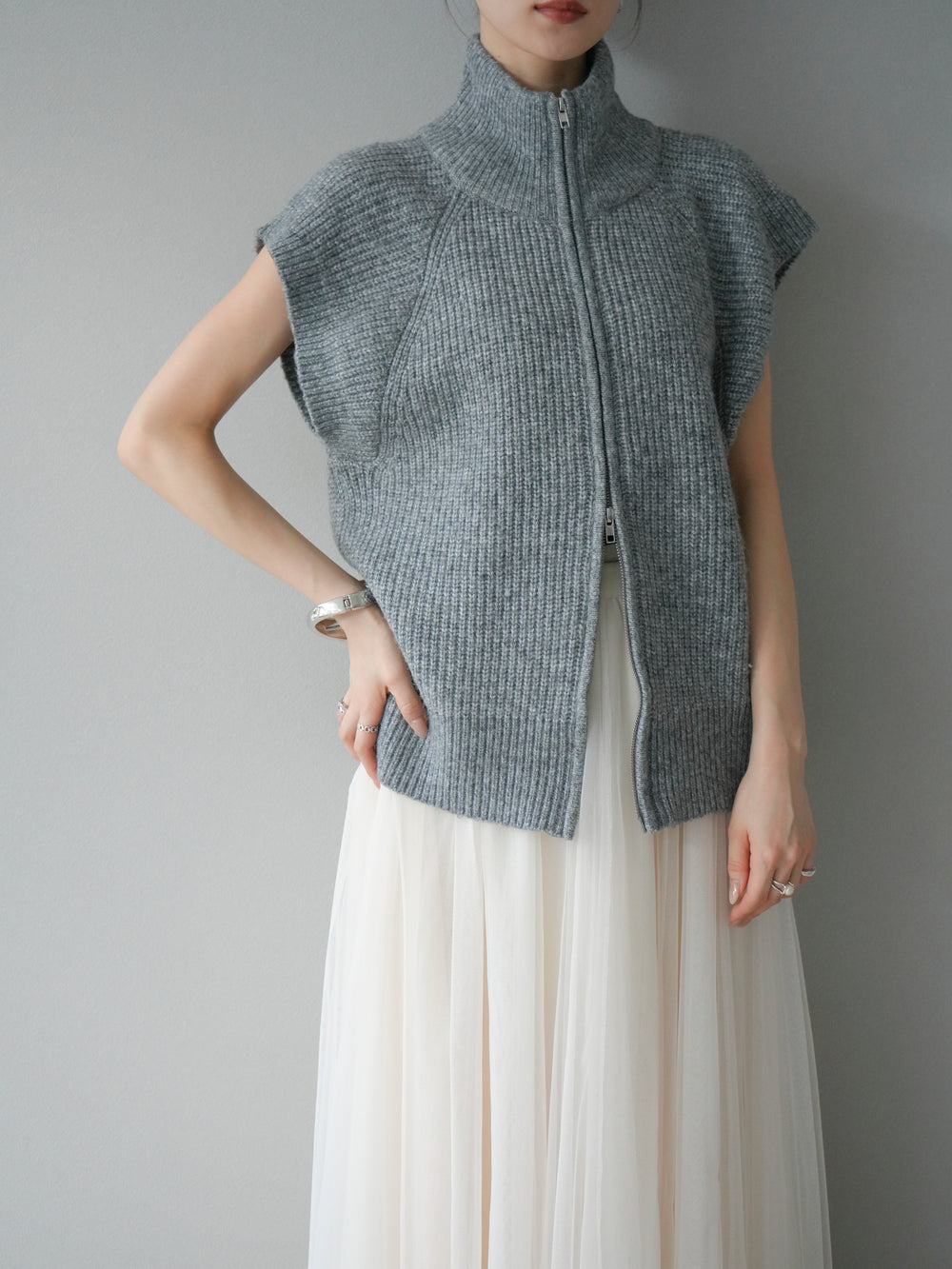 [予約]ダブルZIPハイネック畦編みニットベスト/杢グレー