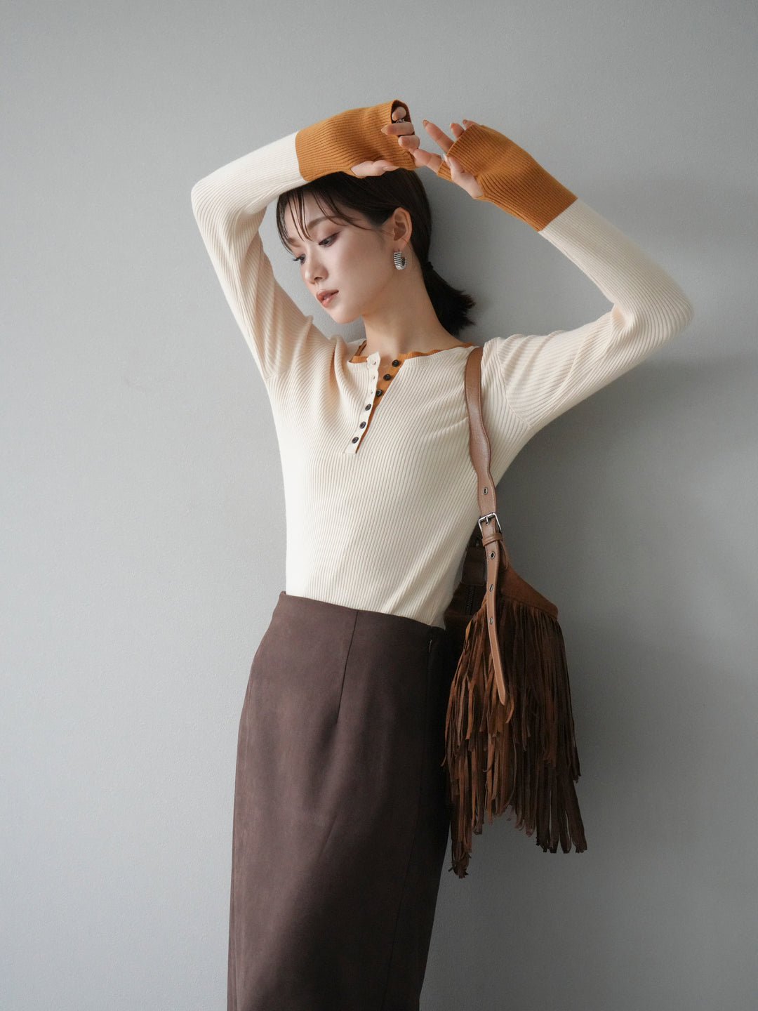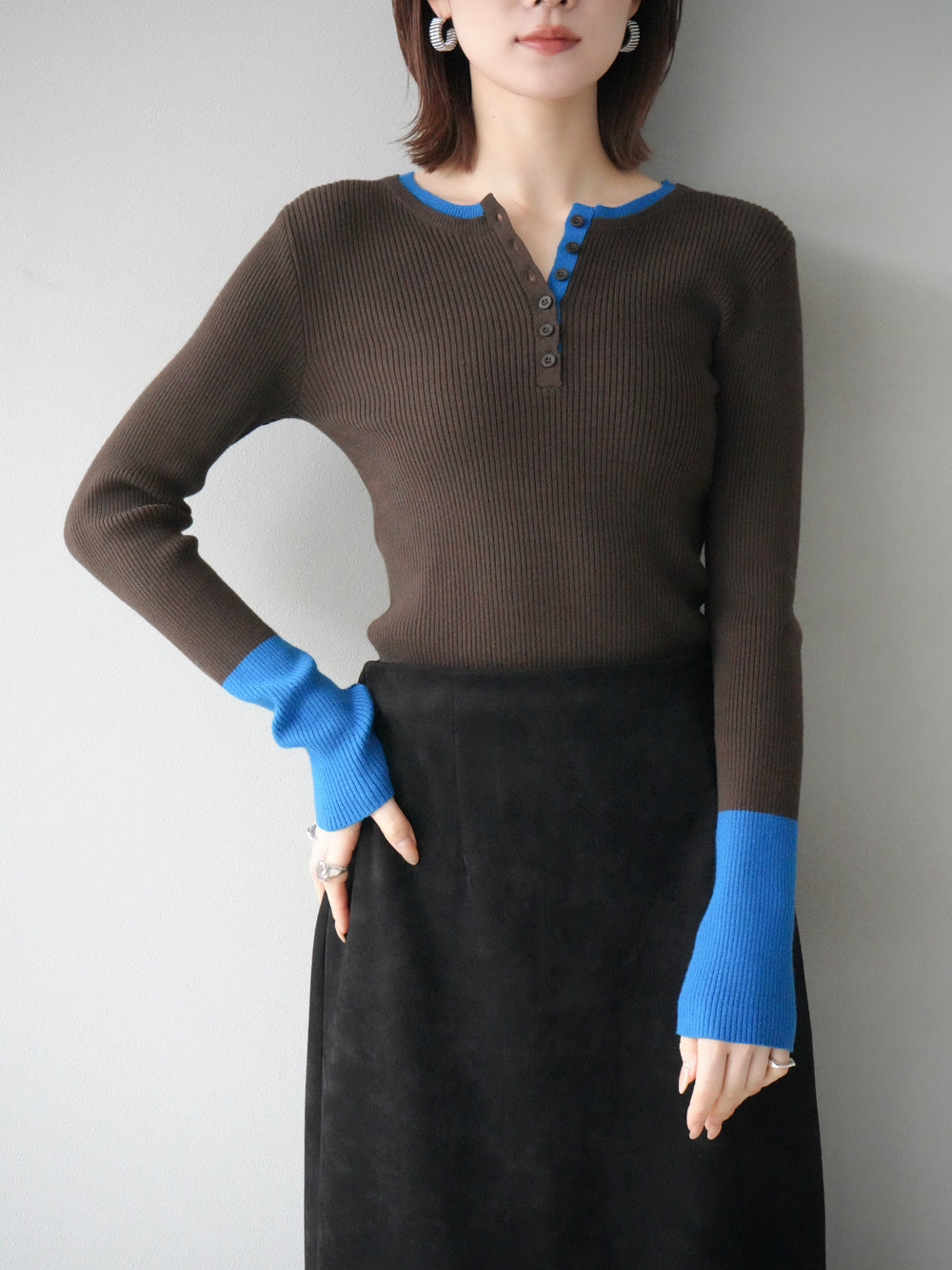 [1]ヘンリーネック配色リブニットトップス/ブラウン