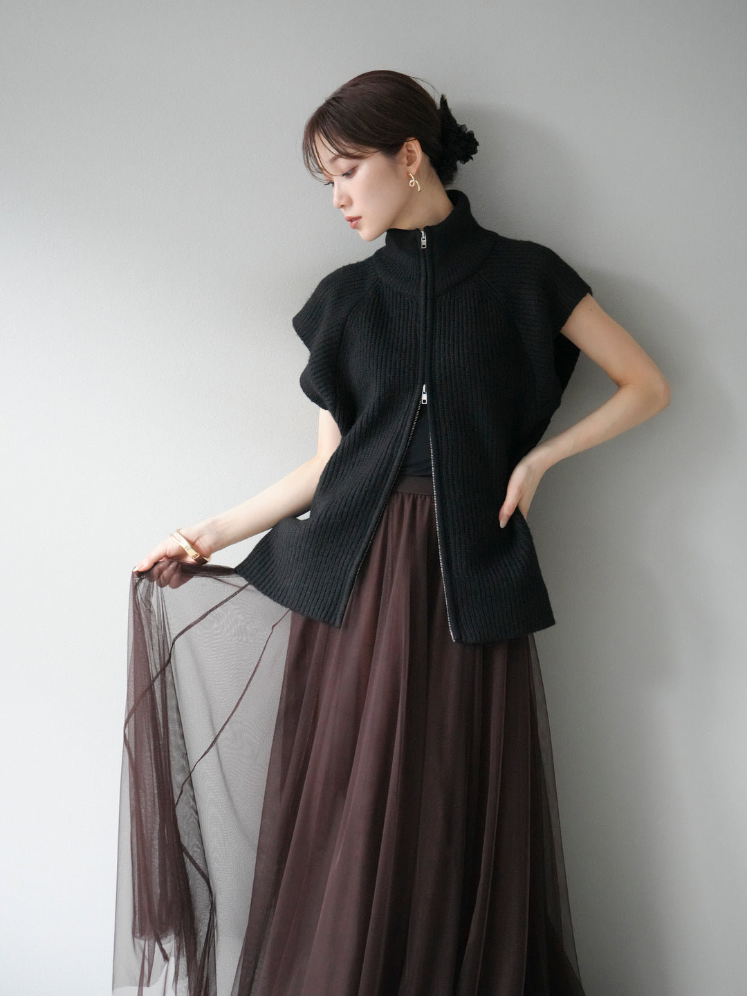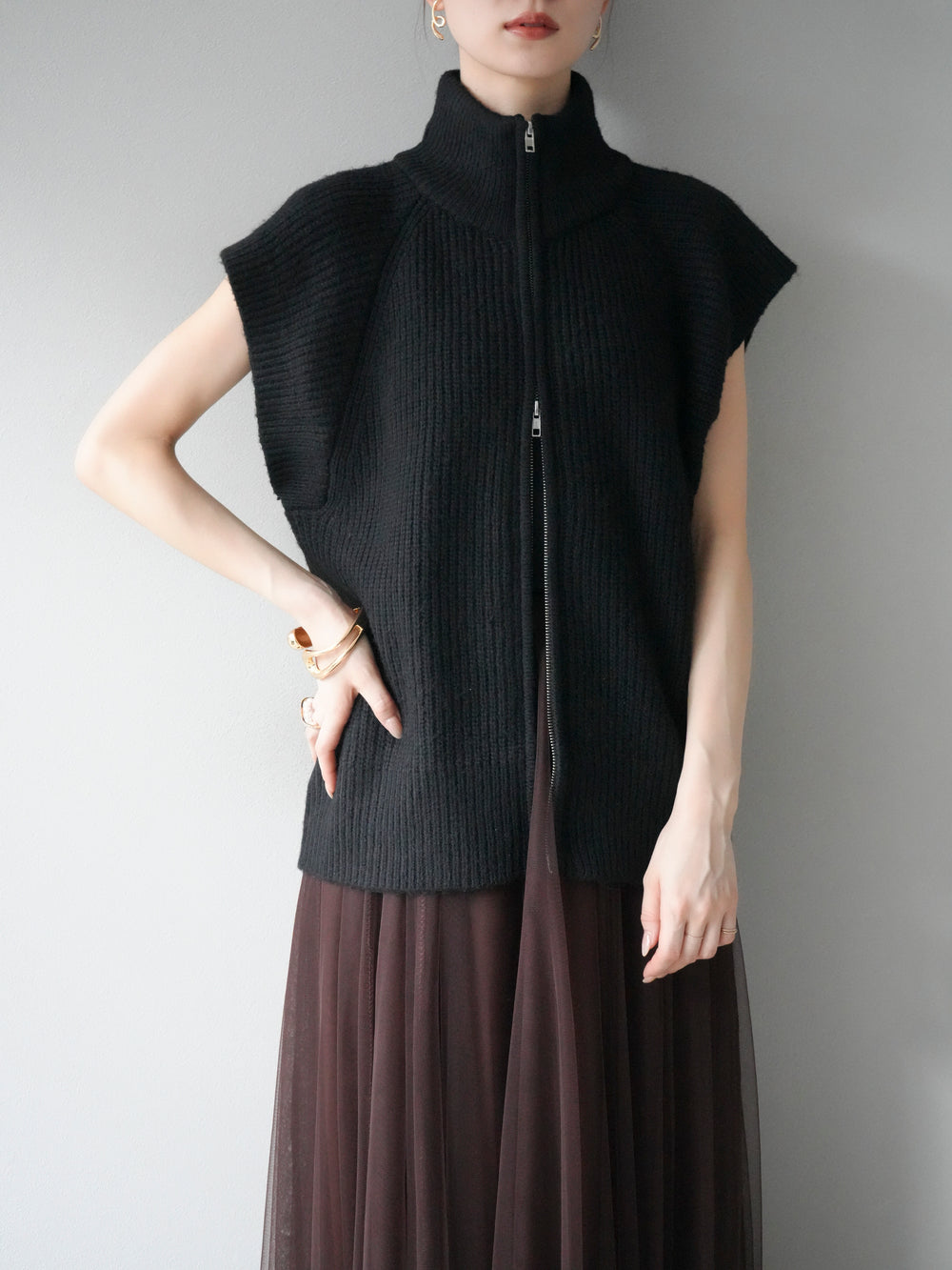 [予約]ダブルZIPハイネック畦編みニットベスト/ブラック