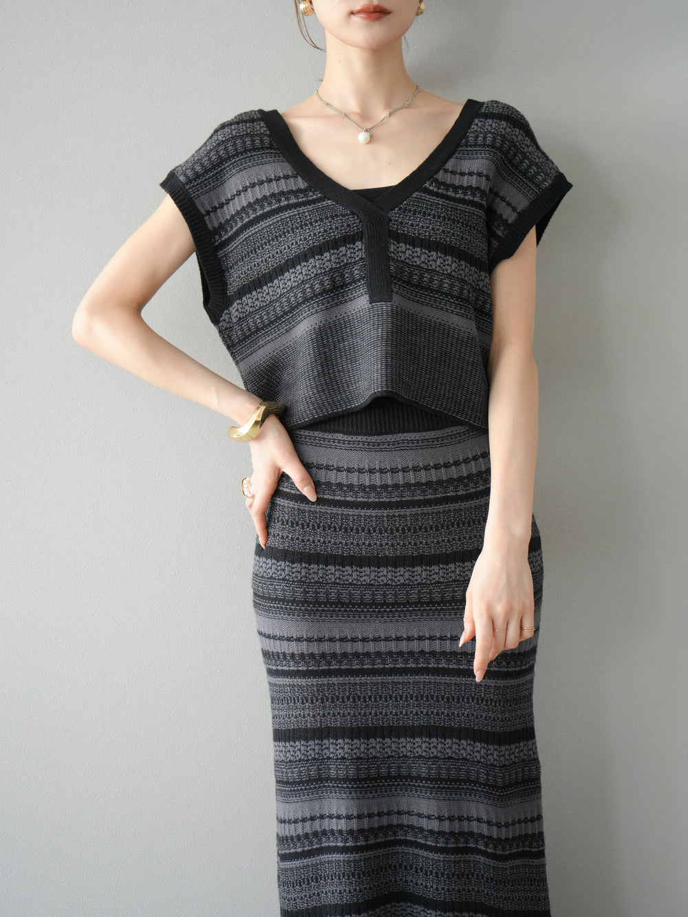 [予約]ガーター編み2WAYニットベスト/グレー×ブラック
