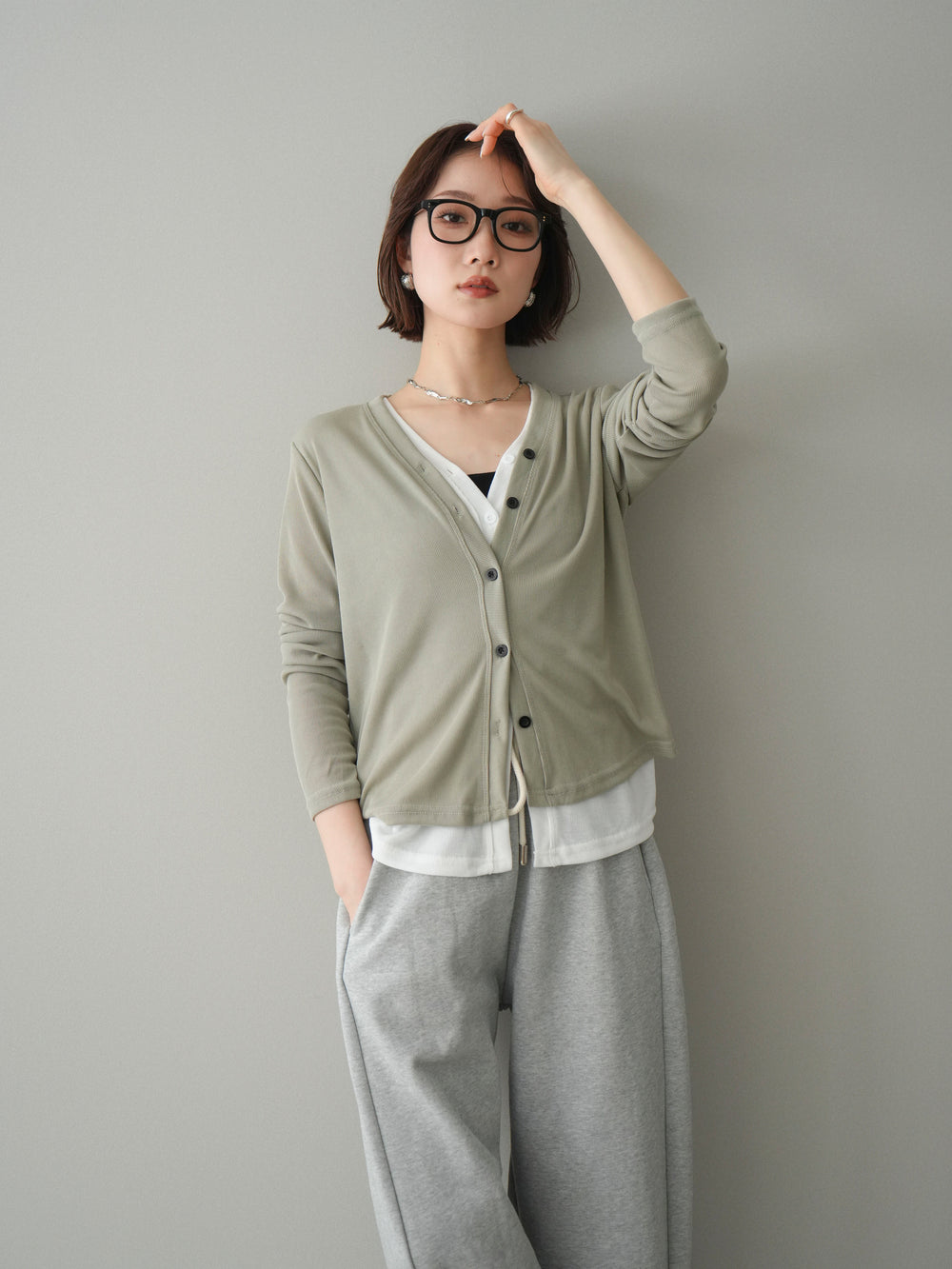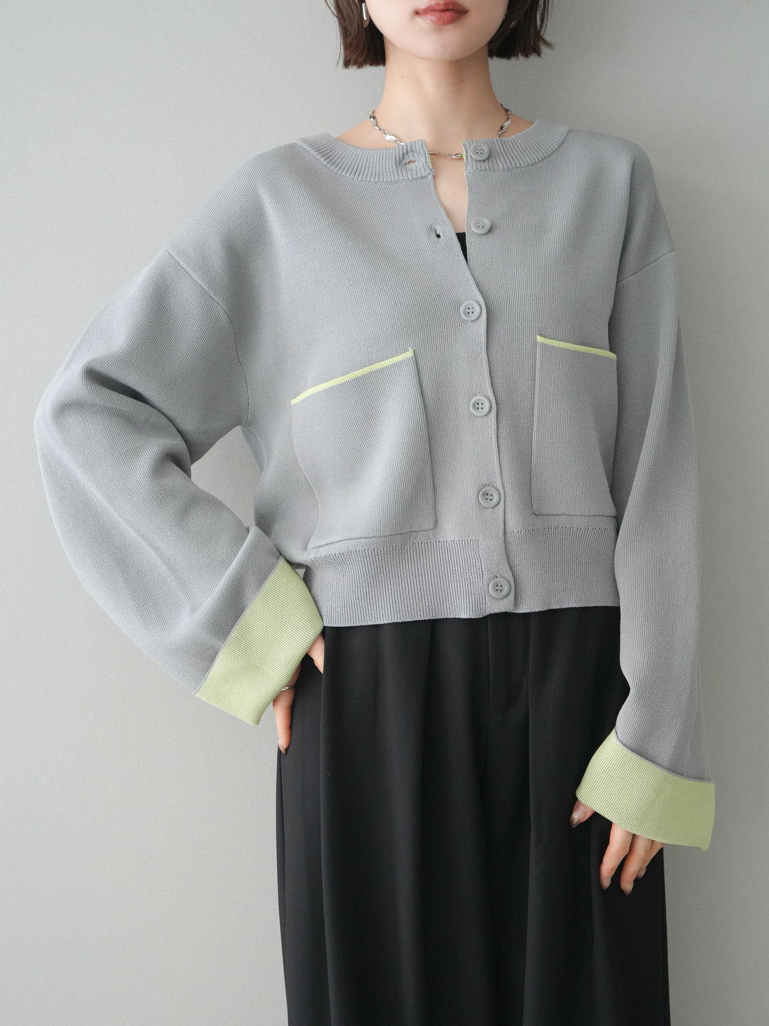 [予約]配色レイヤードカットリブカーディガン/gray