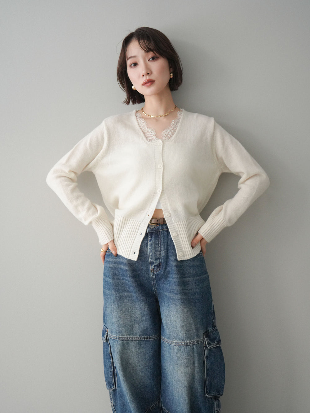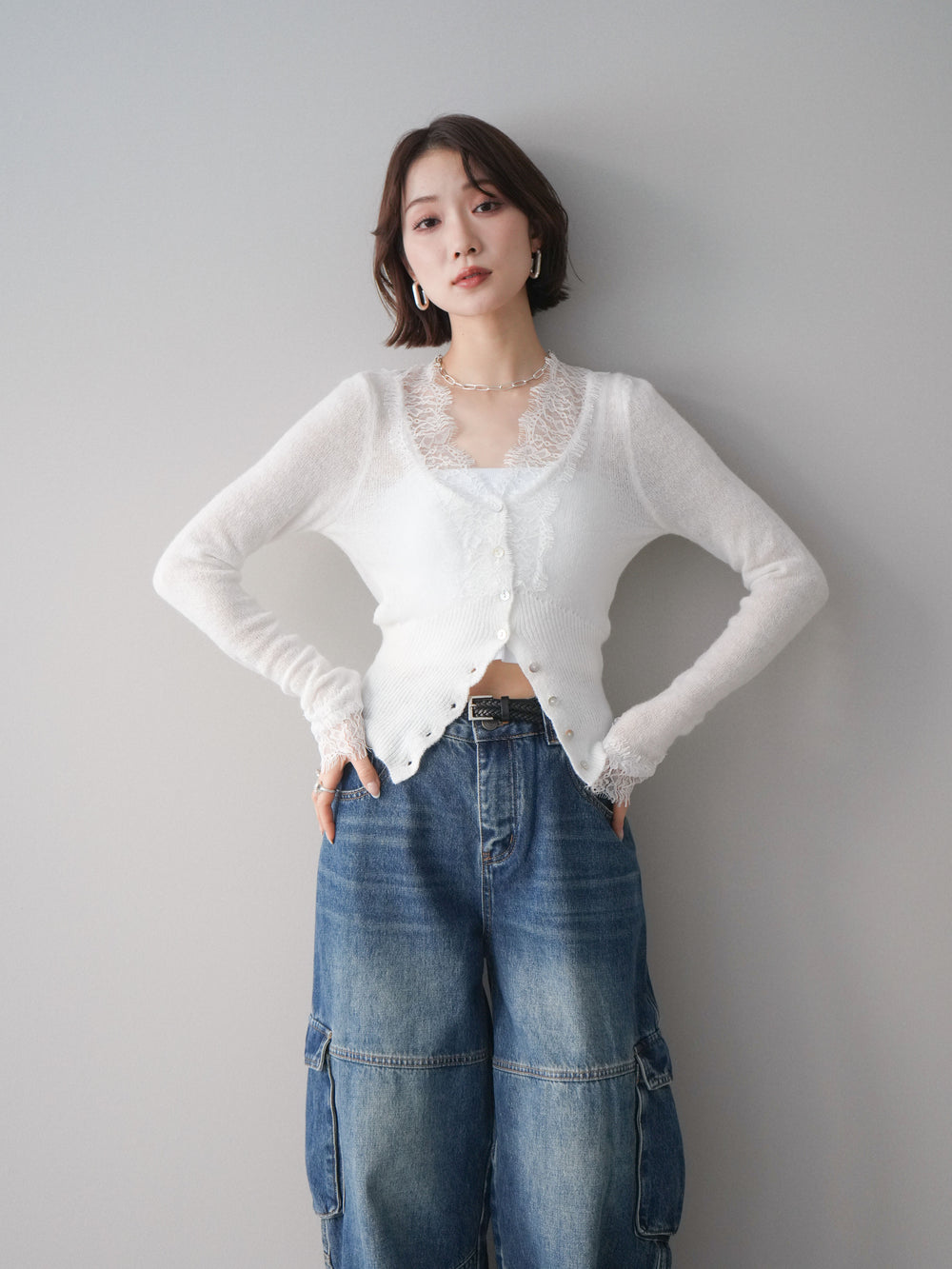 [予約]ネックレースニットカーディガン/white