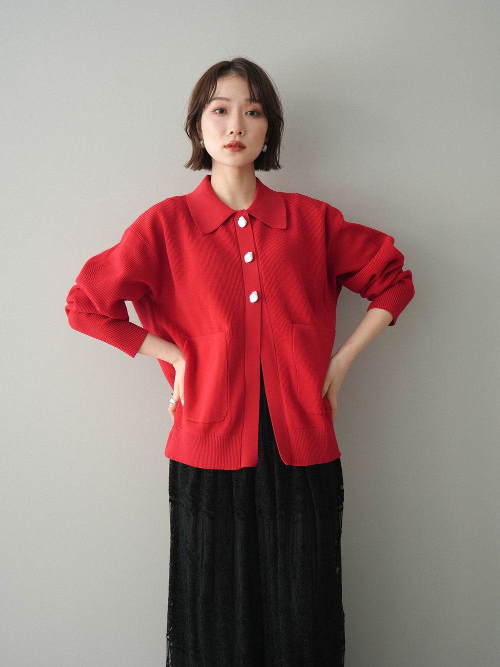 [予約]メタルボタン襟付きポリエステルニットカーディガン/red